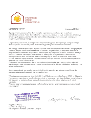 LIST REFERENCYJNY Warszawa, 30.05.2014 Z przyjemnością polecamy City Bum Bum jako organizatora warsztatów gry na perkusji zachodnioafrykańskiej. Nasze doświadczenia z wykonawcą, wskazują na to, iż opracowana przez niego forma wspólnej zabawy, stanowi świetny element tak integracyjny, rozrywkowy jak i zasilający w pozytywną, jednoczącą energię. Organizatorzy udowodnili, iż zintegrowanie niejednorodnej grupy do wspólnego, zaangażowanego działania jest dla nich równie proste jak zarażenie jej entuzjazmem i dobrym humorem. Prowadzący warsztaty pan Wojtek Pęczak w sposób niezwykle spójny z wizerunkiem i energetycznymi zasobami, miękko wprowadził uczestników w zadanie. Charyzma lidera, w połączeniu z zaraźliwie pozytywnym nastawieniem, bezpośrednią, ale niezwykle wyczutą formą przekazu, pokładami dobrego humoru i talentów scenicznych, przełożyły się na autentyczne zaangażowanie uczestników w wykonywane ćwiczenia. Ich efektem był koncert odegrany na niemal 100 bębnów przez osoby, których większość nigdy takowych instrumentów nie dzierżyła w rękach, oraz wyzwolenie pokładów spontanicznej radości uczestników! Umiejętność zainteresowania tą formą ekspresji, entuzjazm i zachęcający, lekki sposób przekazania wiedzy, zaowocował zainteresowaniem sporej grupy uczestników dalszym zgłębianiem tajników gry na bębnach afrykańskich. Sprawna organizacja warsztatów, przy dużej ilości osób, pozwala nam rekomendować firmę do przeprowadzania zajęć nawet dla licznego audytorium. Warsztaty, przeprowadzone w dniu 08.05.2014 na I Międzynarodowej Konferencji ETICS w Ożarowie Mazowieckim zapamiętamy jako świetną inwestycję w kreatywną, inspirującą, dodającą energii zabawę, której zwrot - w postaci pełnego zadowolenia uczestników, notowaliśmy od pierwszych minut warsztatu. Polecamy z ogromną dozą zaufania do profesjonalizmu, talentu i autentycznie pozytywnych wibracji prowadzących. Magdalena Wrona Dyrektor ds. Organizacji Stowarzyszenia na Rzecz Systemów Ociepleń.