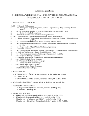 Ogłoszenia parafialne 3 NIEDZIELA WIELKANOCNA – UROCZYSTOŚĆ ZESŁANIA DUCHA ŚWIĘTEGO: 2015. 04. 19. – 2015. 05. 24. 1. KALENDARZ LITURGICZNY: 19. 04. – 3 Niedziela Wielkanocna; 23 – cz – Uroczystość świętego Wojciecha, Biskupa i Męczennika († 997), Głównego Patrona Polski; 24 – pt – Wspomnienie dowolne św. Jerzego, Męczennika, patrona Anglii († 305); 25 - so – Święto św. Marka Ewangelisty; 26 – 4 Niedziela Wielkanocna – Niedziela Dobrego Pasterza; 01. 05. - 1 Piątek Miesiąca – Wspomnienie dowolne św. Józefa, Rzemieślnika; 02 - 1 Sobota Miesiąca – Wspomnienie obowiązkowe św. Atanazego, Biskupa i Doktora Kościoła († 373); 03 – ni – Uroczystość NMP Królowej Polski – Głównej Patronki Polski; 04 - pn - Wspomnienie obowiązkowe św. Floriana, Męczennika, patrona hutników i strażaków († 155); 06 - śr – Święto św. św. Filipa i Jakuba Młodszego, Apostołów; 07 - 1 Czwartek Miesiąca; 08 - pt – Uroczystość św. Stanisława, Biskupa i Męczennika († 1079), Głównego Patrona Polski; 10 - 6 Niedziela Wielkanocna – Święto Drogiej Ojczyzny Polski; 12 - wt – Wspomnienie dowolne św. Pankracego, Męczennika († ok. 304); 14 - cz – Święto św. Macieja, Apostoła; 17 – 7 Niedziela Wielkanocna – Uroczystość Wniebowstąpienia Pańskiego; 23 - so – Wigilia Zesłania Ducha Świętego; 24 - ni – Uroczystość Zesłania Ducha Świętego; - kończy się Okres Wielkanocny; 25 - pn – Święto NMP, Matki Kościoła; - początek II cz. Okresu Zwykłego; 31 - Niedziela Najświętszej Trójcy. 2. MSZE ŚWIĘTE: - W NIEDZIELE I ŚWIĘTA (przypadające w dni wolne od pracy) O GODZ. 10:30. - W DNI POWSZEDNIE (wtorek, czwartek, sobota) O GODZ. 17:00. 3. Miesięcznik „RODZINA” można nabyć w kościele po Mszach św. 4. NABOŻEŃSTWO MAJOWE: - w dni powszednie (wtorek, czwartek, sobota) - po Mszy św.; - w niedziele – po Mszy św. 5. AUDYCJE RADIOWE: - 19 kwietnia – ni – Retransmisja Mszy św. – godz. 8:00, Pr. II PR; - 17 maja - ni – Retransmisja Mszy św. – godz. 8:00, Pr. II PR; - 02 maja – so – „Pięć minut nad Biblią” – godz. 7:40, Pr. II PR; - 09 maja – so - „Kościoły w Polsce i na świecie” – godz. 21:50, Pr. I PR. 6. Dnia 29 kwietnia br. Ksiądz Proboszcz obchodzi 36 Rocznicę Święceń Kapłańskich. Z tej racji 01 maja br. o godz. 10:30, w Rocznicę Prymicji, odprawi dziękczynną Mszę św. 7. KOMENTARZE NA NIEDZIELE I ŚWIĘTA: 3 NIEDZIELA WIELKANOCNA, 19. 04. 2015r. 1. Liturgia 3 Niedzieli Wielkanocnej Hasło dnia: Apostołowie świadkami Zmartwychwstałego. Wstęp Uczniowie Jezusa potrzebowali wiele czasu, by przejąć się prawdą o Zmartwychwstaniu swojego Mistrza. Nie wystarczył im fakt, że grób był pusty i że niewiasty relacjonowały, iż spotkały Chrystusa. Dopiero osobiste doświadczenie, umocnione po Zesłaniu Ducha Świętego, uczyniło wiarę uczniów niezachwianą i zdolną do świadectwa. I czytanie – Dz 3,13-15.17-19 Fragment jest pierwszą częścią kazania św. Piotra wygłoszonego w świątyni po uzdrowieniu chromego. Święty Piotr kładzie nacisk na ciągłość Kościoła z Izraelem (w. 13) i swoje świadectwo przy wyniesieniu Chrystusa (w. 15.17-19). II czytanie – 1 J 2,1-5a Przez swoją śmierć i Zmartwychwstanie Chrystus otworzył przed nami nowe horyzonty. Fragment łączy w harmonijny sposób zasady moralne z poznaniem intelektualnym (w. 4). Ewangelia – Łk 24,35-48 Wiara w Zmartwychwstanie nie płynęła u Apostołów z łatwowierności, jak skłonni są przypuszczać przeciwnicy religii. Wiara w Zmartwychwstanie Chrystusa jest darem, który otrzymujemy od Niego przez Ducha Świętego. Zmartwychwstanie stanowi centrum dziejów zbawienia. Zakończenie Wiara w historiozbawcze wydarzenie, jakim jest Zmartwychwstanie, od samego początku chrześcijaństwa stanowi centrum przepowiadania, a jej skutki winny objawiać się w życiu codziennym każdego wierzącego. 4 NIEDZIELA WIELKANOCNA – Dobrego Pasterza, 26. 04. 2015r. 1. Liturgia 4 Niedzieli Wielkanocnej Hasło dnia: Jezus ofiarowuje życie dla swoich owiec. Wstęp Jezus jest Dobrym Pasterzem, ponieważ przez swoją ofiarę przynosi plon i kontynuuje zgromadzenie synów Bożych, rozproszonych przez grzech, w jednej owczarni. Jezus daje swoje życie dla wypełnienia przewodnictwa Boga, który chce zbawienia wszystkich, a także tych, „co nie są z tej owczarni”. I czytanie – Dz 4,8-12 Fragment przedstawia przykład nauczania Apostołów. Święty Piotr dokonuje konfrontacji z członkami Najwyższej Rady żydowskiej, przesłuchującej go w związku z dokonanym przez niego cudownym uzdrowieniem. Apostoł nie ukrywa, że cud ten jest dowodem mocy, jakiej udziela swoim wyznawcom zmartwychwstały Chrystus. II czytanie – 1 J 3,1-2 Duch Święty, którego zmartwychwstały Chrystus nam zsyła, przekonuje nas, że jesteśmy dziećmi Bożymi; w pełni się to objawi, gdy nasz Pan – Jezus – przyjdzie powtórnie. Ewangelia – J 10,11-18 Wymowny obraz z tej perykopy ewangelicznej ukazuje, jak wielka jest troska Jezusa o Jego wyznawców. Obraz Jezusa jako Dobrego Pasterza, przedstawiony przez św. Jana, może być zrozumiany nie tylko w kontekście Księgi Ezechiela (por. Ez 34), ale idąc dalej: Jezus dobrowolnie „złoży swoje życie za swoje owce” (w. 11.15.17.18). Składając swoje życie, staje się On źródłem życia (w. 14-15), a zażyłość między Pasterzem a owcami będzie podobna do tej, jaka istnieje między Ojcem a Synem. Zakończenie Zmartwychwstały Chrystus przenika czas i przestrzeń – wszystkie chwile i wszystkie miejsca stoją przed nim otworem. Jednak wyróżnia On pewien dzień – Dzień Pański, w którym pozwala nam Siebie spotkać w sposób szczególny. Wyjdźmy zatem na spotkanie z przychodzącym Dobrym Pasterzem i podążajmy za Nim w naszej codzienności. Uroczystość Najświętszej Maryi Panny Królowej Polski – niedziela - 3 maja 2015 