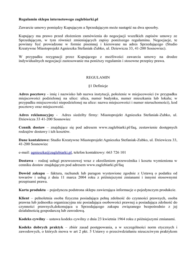 Regulamin sklepu internetowego zaglebiarki.pl Zawarcie umowy pomiędzy Kupującym a Sprzedającym może nastąpić na dwa sposoby. Kupujący ma prawo przed złożeniem zamówienia do negocjacji wszelkich zapisów umowy ze Sprzedającym, w tym również zmieniających zapisy poniższego regulaminu. Negocjacje, te powinny być prowadzone w formie pisemnej i kierowane na adres Sprzedającego (Studio Kreatywne Miastoprojekt Agnieszka Stefaniak-Zubko, ul. Dziewicza 33, 41-200 Sosnowiec). W przypadku rezygnacji przez Kupującego z możliwości zawarcia umowy na drodze indywidualnych negocjacji zastosowanie ma poniższy regulamin i stosowne przepisy prawa. REGULAMIN §1 Definicje Adres pocztowy - imię i nazwisko lub nazwa instytucji, położenie w miejscowości (w przypadku miejscowości podzielonej na ulice: ulica, numer budynku, numer mieszkania lub lokalu; w przypadku miejscowości niepodzielonej na ulice: nazwa miejscowości i numer nieruchomości), kod pocztowy oraz miejscowość. Adres reklamacyjny - Adres siedziby firmy: Miastoprojekt Agnieszka Stefaniak-Zubko, ul. Dziewicza 33 41-200 Sosnowiec Cennik dostaw – znajdujące się pod adresem www.zaglebiarki.pl/faq, zestawienie dostępnych rodzajów dostawy i ich kosztów. Dane kontaktowe: Studio Kreatywne Miastoprojekt Agnieszka Stefaniak-Zubko, ul. Dziewicza 33, 41-200 Sosnowiec e-mail: [email protected], telefon kontaktowy: 663 726 101 Dostawa – rodzaj usługi przewozowej wraz z określeniem przewoźnika i kosztu wymieniona w cenniku dostaw znajdującym pod adresem www.zaglebiarki.pl/faq Dowód zakupu – faktura, rachunek lub paragon wystawione zgodnie z Ustawą o podatku od towarów i usług z dnia 11 marca 2004 roku z późniejszymi zmianami i innymi stosownymi przepisami prawa. Karta produktu – pojedyncza podstrona sklepu zawierająca informacje o pojedynczym produkcie. Klient – pełnoletnia osoba fizyczna posiadająca pełną zdolność do czynności prawnych, osoba prawna lub jednostka organizacyjna nie posiadająca osobowości prawnej a posiadająca zdolność do czynności prawnych,dokonująca u Sprzedającego zakupu związanego bezpośrednio z jej działalnością gospodarczą lub zawodową. Kodeks cywilny – ustawa kodeks cywilny z dnia 23 kwietnia 1964 roku z późniejszymi zmianami. Kodeks dobrych praktyk – zbiór zasad postępowania, a w szczególności norm etycznych i zawodowych, o których mowa w art 2 pkt. 5 Ustawy o przeciwdziałaniu nieuczciwym praktykom rynkowym z dnia 23 sierpnia 2007 roku z późniejszymi zmianami. Konsument – pełnoletnia osoba fizyczna posiadająca pełną zdolność do czynności prawnych, dokonująca u Sprzedającego zakupu niezwiązanego bezpośrednio z jej działalnością gospodarczą lub zawodową. Koszyk – lista produktów sporządzona z oferowanych w sklepie produktów na podstawie wyborów Kupującego. Kupujący – zarówno Konsument, jak i Klient. Miejsce wydania rzeczy – adres pocztowy lub punkt odbioru wskazane w zamówieniu przez Kupującego. Moment wydania rzeczy – moment, w którym Kupujący lub wskazana przez niego do odbioru osoba trzecia obejmie rzecz w posiadanie. Płatność – metoda dokonania zapłaty za przedmiot umowy i dostawę wymieniona pod adresem zagłebiarki.pl/faq Prawo konsumenckie – ustawa o prawach konsumenta z dnia 30 maja 2014 roku. Produkt – minimalna i niepodzielna ilość rzeczy, która może być przedmiotem zamówienia, a która podana jest w sklepie Sprzedającego jako jednostka miary przy określeniu jego ceny (cena/jednostka). Przedmiot umowy – produkty i dostawa będące przedmiotem umowy. Przedmiot świadczenia – przedmiot umowy. Punkt odbioru – miejsce wydania rzeczy nie będące adresem pocztowym, wymienione w zestawieniu udostępnionym przez Sprzedającego w sklepie. Rzecz – rzecz ruchoma mogąca być lub będąca przedmiotem umowy. Sklep – serwis internetowy dostępny pod adresem zaglebiarki.pl, za pośrednictwem którego Kupujący może złożyć zamówienie. Sprzedający: Studio Kreatywne Miastoprojekt Agnieszka Stefaniak-Zubko ul. Dziewicza 33, 41-200 NIP 6442948963 REGON Nr konta System – zespół współpracujących ze sobą urządzeń informatycznych i oprogramowania, zapewniający przetwarzanie i przechowywanie, a także wysyłanie i odbieranie danych poprzez sieci telekomunikacyjne za pomocą właściwego dla danego rodzaju sieci urządzenia końcowego, potocznie określany Internetem. Termin realizacji – podana na karcie produktu liczba godzin lub dni roboczych. Umowa – umowa zawierana poza lokalem przedsiębiorcy lub na odległość w rozumieniu Ustawy o prawach konsumenta z dnia 30 maja 2014 roku w przypadku Konsumentów i umowa sprzedaży w rozumieniu art. 535 Ustawy kodeks cywilny z dnia 23 kwietnia 1964 roku w przypadku Kupujących. Wada – zarówno wada fizyczna, jak i wada prawna. Wada fizyczna – niezgodność rzeczy sprzedanej z umową, a w szczególności jeśli rzecz: - nie ma ona właściwości, które rzecz tego rodzaju powinna mieć ze względu na cel w umowie oznaczony albo wynikający z okoliczności lub przeznaczenia; - nie ma właściwości, o których istnieniu Sprzedający zapewnił Konsumenta, - nie nadaje się do celu, o którym Konsument poinformował Sprzedającego przy zawarciu umowy, a Sprzedający nie zgłosił zastrzeżenia co do takiego jej przeznaczenia; - została Konsumentowi wydana w stanie niezupełnym; - w razie nieprawidłowego jej zamontowania i uruchomienia, jeżeli czynności te zostały wykonane przez Sprzedającego lub osobę trzecią, za którą Sprzedający ponosi odpowiedzialność, albo przez Konsumenta, który postąpił według instrukcji otrzymanej od Sprzedającego; - nie ma ona właściwości, o której zapewniał producent lub jego przedstawiciel lub osoba, która wprowadza rzecz do obrotu w zakresie swojej działalności gospodarczej oraz osoba, która przez umieszczenie na rzeczy sprzedanej swojej nazwy, znaku towarowego lub innego oznaczenia od
