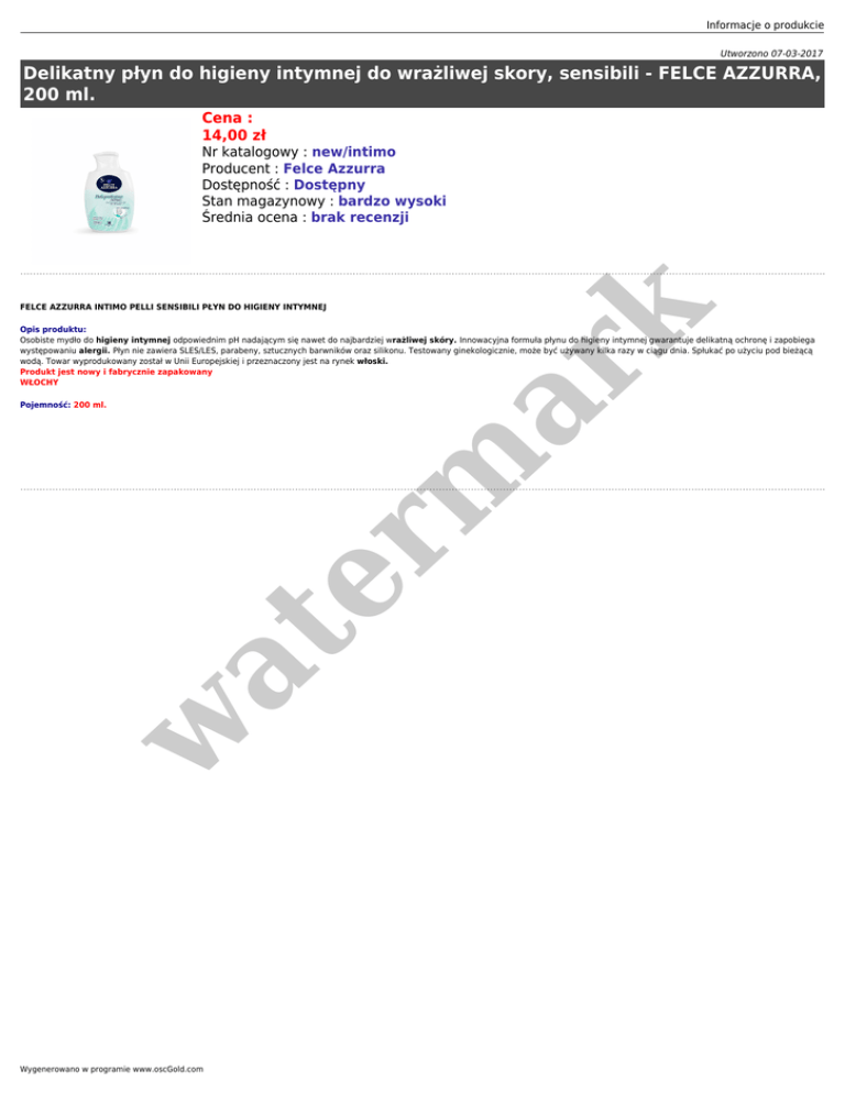 Informacje o produkcie Utworzono 07-03-2017 Delikatny płyn do higieny intymnej do wrażliwej skory, sensibili - FELCE AZZURRA, 200 ml. Cena : 14,00 zł Nr katalogowy : new/intimo Producent : Felce Azzurra Dostępność : Dostępny Stan magazynowy : bardzo wysoki Średnia ocena : brak recenzji er m ar k FELCE AZZURRA INTIMO PELLI SENSIBILI PŁYN DO HIGIENY INTYMNEJ Opis produktu: Osobiste mydło do higieny intymnej odpowiednim pH nadającym się nawet do najbardziej wrażliwej skóry. Innowacyjna formuła płynu do higieny intymnej gwarantuje delikatną ochronę i zapobiega występowaniu alergii. Płyn nie zawiera SLES/LES, parabeny, sztucznych barwników oraz silikonu. Testowany ginekologicznie, może być używany kilka razy w ciągu dnia. Spłukać po użyciu pod bieżącą wodą. Towar wyprodukowany został w Unii Europejskiej i przeznaczony jest na rynek włoski. Produkt jest nowy i fabrycznie zapakowany WŁOCHY w at Pojemność: 200 ml. Wygenerowano w programie www.oscGold.com