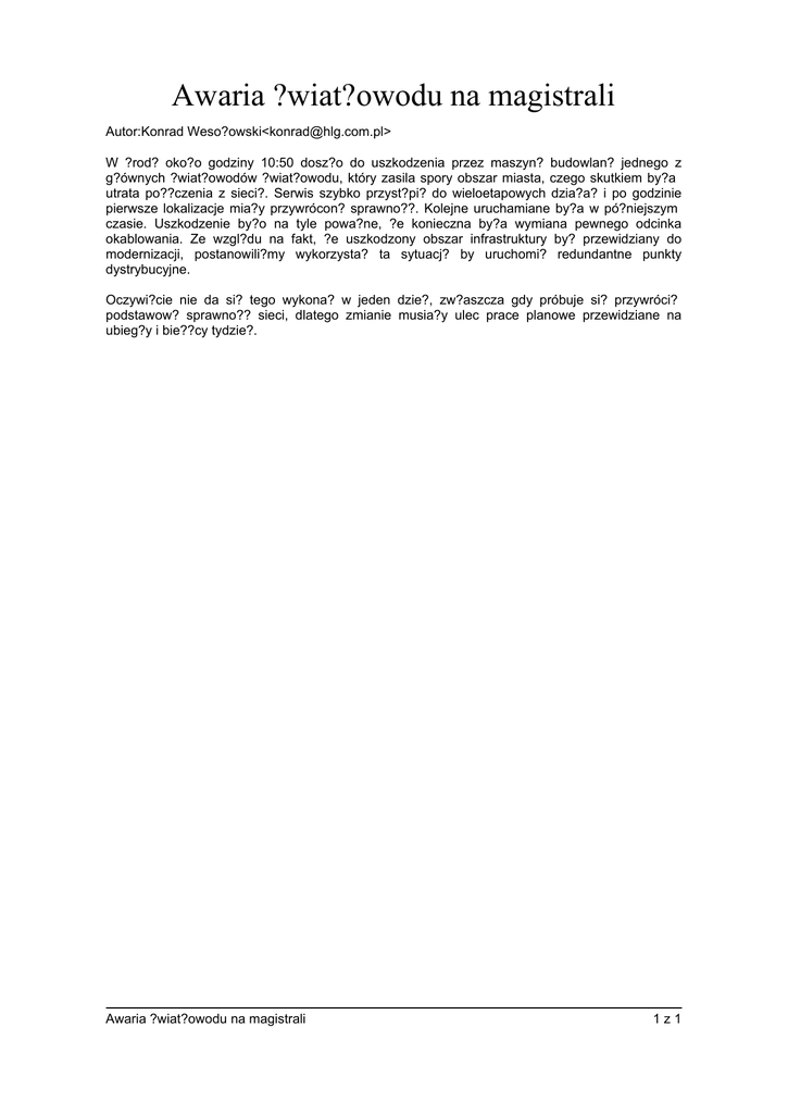 Awaria ?wiat?owodu na magistrali Autor:Konrad Weso?owski<[email protected]> W ?rod? oko?o godziny 10:50 dosz?o do uszkodzenia przez maszyn? budowlan? jednego z g?ównych ?wiat?owodów ?wiat?owodu, który zasila spory obszar miasta, czego skutkiem by?a utrata po??czenia z sieci?. Serwis szybko przyst?pi? do wieloetapowych dzia?a? i po godzinie pierwsze lokalizacje mia?y przywrócon? sprawno??. Kolejne uruchamiane by?a w pó?niejszym czasie. Uszkodzenie by?o na tyle powa?ne, ?e konieczna by?a wymiana pewnego odcinka okablowania. Ze wzgl?du na fakt, ?e uszkodzony obszar infrastruktury by? przewidziany do modernizacji, postanowili?my wykorzysta? ta sytuacj? by uruchomi? redundantne punkty dystrybucyjne. Oczywi?cie nie da si? tego wykona? w jeden dzie?, zw?aszcza gdy próbuje si? przywróci? podstawow? sprawno?? sieci, dlatego zmianie musia?y ulec prace planowe przewidziane na ubieg?y i bie??cy tydzie?. Awaria ?wiat?owodu na magistrali 1z1