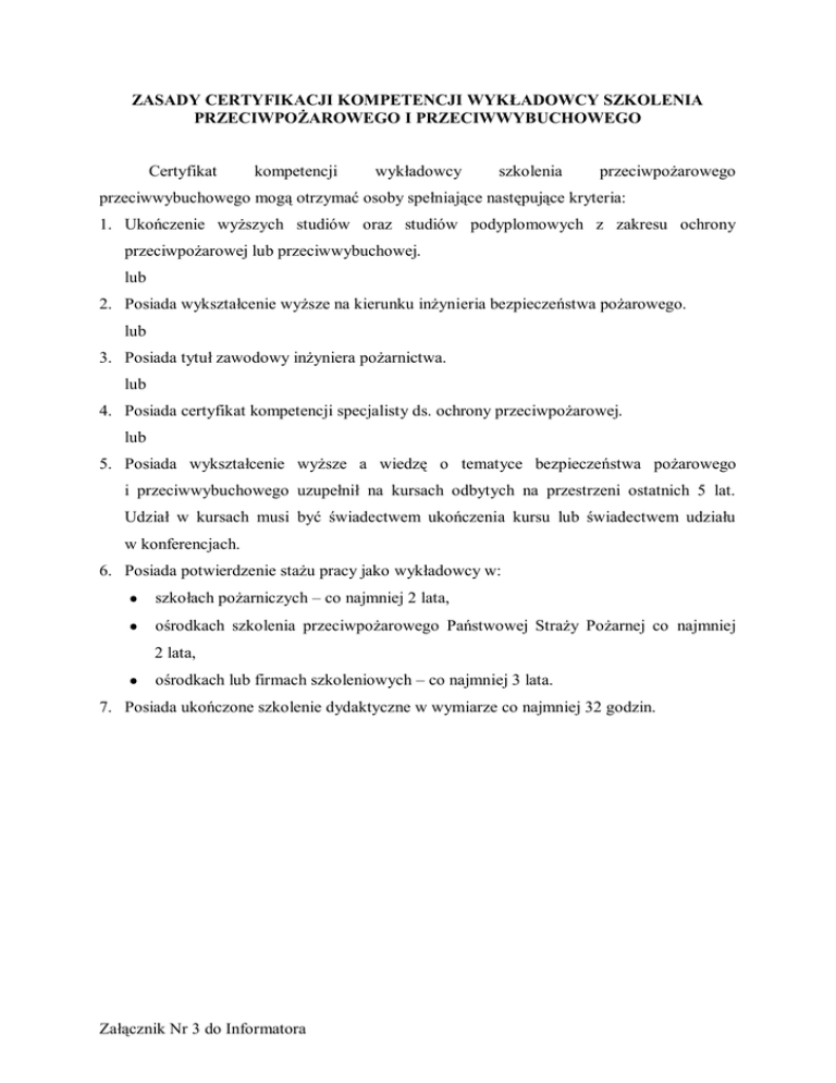 ZASADY CERTYFIKACJI KOMPETENCJI WYKŁADOWCY SZKOLENIA PRZECIWPOŻAROWEGO I PRZECIWWYBUCHOWEGO Certyfikat kompetencji wykładowcy szkolenia przeciwpożarowego przeciwwybuchowego mogą otrzymać osoby spełniające następujące kryteria: 1. Ukończenie wyższych studiów oraz studiów podyplomowych z zakresu ochrony przeciwpożarowej lub przeciwwybuchowej. lub 2. Posiada wykształcenie wyższe na kierunku inżynieria bezpieczeństwa pożarowego. lub 3. Posiada tytuł zawodowy inżyniera pożarnictwa. lub 4. Posiada certyfikat kompetencji specjalisty ds. ochrony przeciwpożarowej. lub 5. Posiada wykształcenie wyższe a wiedzę o tematyce bezpieczeństwa pożarowego i przeciwwybuchowego uzupełnił na kursach odbytych na przestrzeni ostatnich 5 lat. Udział w kursach musi być świadectwem ukończenia kursu lub świadectwem udziału w konferencjach. 6. Posiada potwierdzenie stażu pracy jako wykładowcy w: szkołach pożarniczych – co najmniej 2 lata, ośrodkach szkolenia przeciwpożarowego Państwowej Straży Pożarnej co najmniej 2 lata, ośrodkach lub firmach szkoleniowych – co najmniej 3 lata. 7. Posiada ukończone szkolenie dydaktyczne w wymiarze co najmniej 32 godzin. Załącznik Nr 3 do Informatora
