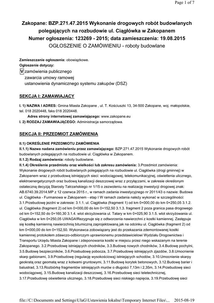 Page 1 of 7 Zakopane: BZP.271.47.2015 Wykonanie drogowych robót budowlanych polegających na rozbudowie ul. Ciągłówka w Zakopanem Numer ogłoszenia: 123269 - 2015; data zamieszczenia: 19.08.2015 OGŁOSZENIE O ZAMÓWIENIU - roboty budowlane Zamieszczanie ogłoszenia: obowiązkowe. Ogłoszenie dotyczy: V zamówienia publicznego zawarcia umowy ramowej ustanowienia dynamicznego systemu zakupów (DSZ) SEKCJA I: ZAMAWIAJĄCY I. 1) NAZWA I ADRES: Gmina Miasta Zakopane , ul. T. Kościuszki 13, 34-500 Zakopane, woj. małopolskie, tel. 018 2020448, faks 018 2020448. Adres strony internetowej zamawiającego: www.zakopane.eu I. 2) RODZAJ ZAMAWIAJĄCEGO: Administracja samorządowa. SEKCJA II: PRZEDMIOT ZAMÓWIENIA II.1) OKREŚLENIE PRZEDMIOTU ZAMÓWIENIA II.1.1) Nazwa nadana zamówieniu przez zamawiającego: BZP.271.47.2015 Wykonanie drogowych robót budowlanych polegających na rozbudowie ul. Ciągłówka w Zakopanem. II.1.2) Rodzaj zamówienia: roboty budowlane. II.1.4) Określenie przedmiotu oraz wielkości lub zakresu zamówienia: 3.Przedmiot zamówienia: Wykonanie drogowych robót budowlanych polegających na rozbudowie ul. Ciągłówka (drogi gminnej) w Zakopanem wraz z przebudową istniejących sieci: wodociągowej, telekomunikacyjnej, oświetlenia ulicznego, elektroenergetycznych oraz budową kanalizacji deszczowej wraz z przyłączami, w zakresie określonym ostateczną decyzją Starosty Tatrzańskiego nr 1/15 o zezwoleniu na realizację inwestycji drogowej znak: AB.6740.39.2014.MP z 12 czerwca 2015 r., w ramach zadania inwestycyjnego nr 2011/43 o nazwie: Budowa ul. Ciągłówka - Furmanowa w Zakopanem - etap I W ramach zadania naleŜy wykonać w szczególności: 3.1.Przebudowę jezdni w zakresie: 3.1.1. ul. Ciągłówka (fragment 1) od km 0+000,00 do km 0+250,05 3.1.2. ul. Ciągłówka (fragment 2) od km 0+000,00 do km 0+152,50 3.1.3. fragment 2 poza granica pasa drogowego od km 0+152,50 do 0+160,30 3.1.4. wlot skrzyŜowania ul. Tatary w km 0+025,90 3.1.5. wlot skrzyŜowania ul. Ciągłówka w km 0+250,05 UWAGA!Rezygnuje się z odtworzenia nawierzchni z kostki kamiennej. Zastępuje się kostkę kamienną nawierzchnią bitumiczną zaprojektowaną jak na odcinku ul. Ciągłówka (fragment 2) od km 0+000,00 do km 0+152,50. Wykonawca zobowiązany jest do przekazania zdemontowanej kostki kamiennej protokołem zdawczo-odbiorczym uprawnionemu przedstawicielowi Wydziału Drogownictwa i Transportu Urzędu Miasta Zakopane i zdeponowania kostki w miejscu przez niego wskazanym na terenie Zakopanego. 3.2.Przebudowę istniejących chodników, 3.3.Budowę nowych chodników, 3.4.Budowę pochylni, 3.5.Budowę bezpieczników, 3.6.Przebudowę pobocza, 3.7.Przebudowę istniejących zjazdów, 3.8.Umocnienie skarp gabionami, 3.9.Przebudowę (regulację wysokościową) istniejących schodów, 3.10.Umocnienie skarpy geokratą oraz geomatą wraz z kotwami gruntowymi, 3.11.Budowę korytek betonowych, 3.12.Budowę barier i balustrad, 3.13.Rozbiórkę fragmentów istniejących murów o długości 7,13m i 2,35m, 3.14.Przebudowę sieci wodociągowej, 3.15.Budowę kanalizacji deszczowej, 3.16.Przebudowę sieci teletechnicznej, 3.17.Przebudowę oświetlenia ulicznego, 3.18.Przebudowę sieci niskiego napięcia, 3.19.Przebudowę sieci file://C:\Documents and Settings\UlaG\Ustawienia lokalne\Temporary Internet Files\... 2015-08-19 Page 2 of 7 średniego napięcia, 3.20.Przebudowę przepustu na przepust o przekroju jajowym wraz ze zbiornikiem kruszywa wleczonego, 3.21.Rozbiórkę istniejącego przepustu, 3.22.Budowę dojazdu do przepustu, 3.23.Regulację sytuacyjną i wysokościową potoku Kotelnica przed i za przebudowywanym przepustem w dostosowaniu do poziomu jego rozwiązania sytuacyjnego i wysokościowego, 3.24.Wycinkę drzew, 3.25.Przedmiot umowy obejmuje ponadto: 3.25.1.wykonanie projektu wykonawczego odwodnienia drogi oraz uzyskanie skutecznego zgłoszenia robót nie wymagających pozwolenia na budowę dla odwodnień drogi w lokalizacjach określonych w piśmie Wydziału Drogownictwa i Transportu Urzędu Miasta Zakopane z dnia 2015-04-09 znak: DIT.7211.1.7.2015.TB, 3.25.2.wykonanie odwodnień drogi na podstawie sporządzonego przez Wykonawcę projektu wykonawczego zatwierdzonego przez Zamawiającego, 3.25.3.zabezpieczenie drogi, oznakowanie i zapewnienie przejezdności na czas pomiędzy wykonaniem przepustu a drogowymi robotami budowlanymi Zamawiający dopuszcza moŜliwość składania ofert równowaŜnych w zakresie zaproponowanych materiałów i urządzeń przedstawionych w dokumentacji technicznej pod warunkiem, Ŝe będą posiadały parametry techniczne, nie gorsze niŜ wymagane przez Zamawiającego. Zaoferowane urządzenia i materiały równowaŜne muszą posiadać stosowne, wymagane przepisami prawa atesty lub dopuszczenia do obrotu gospodarczego. UWAGA Zamawiający informuje, Ŝe dopuszcza zastosowanie metody wykonania ław pod elementy drogowe (krawęŜniki, obrzeŜa), zgodnej z normą DIN 18318, tj. na fundamencie o grubości co najmniej 20cm z podstawą z betonu C12 15, z oporem o parametrach 0,10m3 betonu mb ławy (który w trakcie montaŜu nie moŜe być jeszcze związany, aby powstało dobre połączenie prefabrykowanego elementu i betonu), jako równowaŜnej do wymaganej w dokumentacji projektowej i STWiORB. Zamawiający dopuszcza moŜliwość wystąpienia, w trakcie realizacji przedmiotu umowy, konieczności wykonania robót zamiennych w stosunku do przewidzianych w dokumentacji projektowej w sytuacji, gdy wykonanie tych robót będzie niezbędne do prawidłowego, tj. zgodnego z zasadami wiedzy technicznej i obowiązującymi na dzień odbioru przepisami wykonania przedmiotu umowy. Roboty zamienne nie powodują zwiększenia wynagrodzenia Wykonawcy. Zamawiający dopuszcza moŜliwość ograniczenia wykonania pewnych robót przewidzianych w dokumentacji projektowej, gdy ich wykonanie będzie zbędne do prawidłowego uŜytkowania, (tj. zgodnego z zasadami wiedzy technicznej i obowiązującymi na dzień o