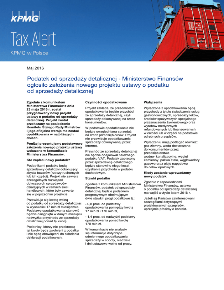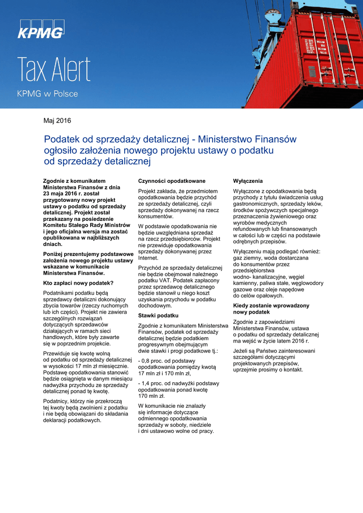 Maj 2016 Podatek od sprzedaży detalicznej - Ministerstwo Finansów ogłosiło założenia nowego projektu ustawy o podatku od sprzedaży detalicznej Zgodnie z komunikatem Ministerstwa Finansów z dnia 23 maja 2016 r. został przygotowany nowy projekt ustawy o podatku od sprzedaży detalicznej. Projekt został przekazany na posiedzenie Komitetu Stałego Rady Ministrów i jego oficjalna wersja ma zostać opublikowana w najbliższych dniach. Czynności opodatkowane Wyłączenia Projekt zakłada, że przedmiotem opodatkowania będzie przychód ze sprzedaży detalicznej, czyli sprzedaży dokonywanej na rzecz konsumentów. Wyłączone z opodatkowania będą przychody z tytułu świadczenia usług gastronomicznych, sprzedaży leków, środków spożywczych specjalnego przeznaczenia żywieniowego oraz wyrobów medycznych refundowanych lub finansowanych w całości lub w części na podstawie odrębnych przepisów. W podstawie opodatkowania nie będzie uwzględniana sprzedaż na rzecz przedsiębiorców. Projekt nie przewiduje opodatkowania Poniżej prezentujemy podstawowe sprzedaży dokonywanej przez założenia nowego projektu ustawy Internet. wskazane w komunikacie Przychód ze sprzedaży detalicznej Ministerstwa Finansów. nie będzie obejmował należnego podatku VAT. Podatek zapłacony Kto zapłaci nowy podatek? przez sprzedawcę detalicznego Podatnikami podatku będą będzie stanowił u niego koszt sprzedawcy detaliczni dokonujący uzyskania przychodu w podatku zbycia towarów (rzeczy ruchomych dochodowym. lub ich części). Projekt nie zawiera Stawki podatku szczególnych rozwiązań dotyczących sprzedawców Zgodnie z komunikatem Ministerstwa działających w ramach sieci Finansów, podatek od sprzedaży handlowych, które były zawarte detalicznej będzie podatkiem się w poprzednim projekcie. progresywnym obejmującym dwie stawki i progi podatkowe tj.: Przewiduje się kwotę wolną od podatku od sprzedaży detalicznej w wysokości 17 mln zł miesięcznie. Podstawę opodatkowania stanowić będzie osiągnięta w danym miesiącu nadwyżka przychodu ze sprzedaży detalicznej ponad tę kwotę. Podatnicy, którzy nie przekroczą tej kwoty będą zwolnieni z podatku i nie będą obowiązani do składania deklaracji podatkowych. - 0,8 proc. od podstawy opodatkowania pomiędzy kwotą 17 mln zł i 170 mln zł, - 1,4 proc. od nadwyżki podstawy opodatkowania ponad kwotę 170 mln zł. W komunikacie nie znalazły się informacje dotyczące odmiennego opodatkowania sprzedaży w soboty, niedziele i dni ustawowo wolne od pracy. Wyłączeniu mają podlegać również: gaz ziemny, woda dostarczana do konsumentów przez przedsiębiorstwa wodno- kanalizacyjne, węgiel kamienny, paliwa stałe, węglowodory gazowe oraz oleje napędowe do celów opałowych. Kiedy zostanie wprowadzony nowy podatek Zgodnie z zapowiedziami Ministerstwa Finansów, ustawa o podatku od sprzedaży detalicznej ma wejść w życie latem 2016 r. Jeżeli są Państwo zainteresowani szczegółami dotyczącymi projektowanych przepisów, uprzejmie prosimy o kontakt. Kontakt Biura KPMG Tomasz Grunwald Partner Tel. : +48 22 528 11 78 Faks: +48 22 528 11 59 [email protected] Warszawa ul. Inflancka 4a 00-189 Warszawa Tel. : +48 22 528 11 00 Faks: +48 22 528 10 09 [email protected] Gdańsk al. Zwycięstwa 13a 80-219 Gdańsk Tel. : +48 58 772 95 00 Faks: +48 58 772 95 01 [email protected] Kraków al. Armii Krajowej 18 30-150 Kraków Tel. : +48 12 424 94 00 Faks: +48 12 424 94 01 [email protected] Katowice ul. Francuska 34 40-028 Katowice Tel. : +48 32 778 88 00 Faks: +48 32 778 88 10 [email protected] Poznań ul. Roosevelta 18 60-829 Poznań Tel. : +48 61 845 46 00 Faks: +48 61 845 46 01 [email protected] Łódź al. Piłsudskiego 22 90-051 Łódź Tel. : +48 42 232 77 00 Faks: +48 42 232 77 01 [email protected] Tomasz Bełdyga Partner Tel. : +48 22 528 11 98 Faks: +48 22 528 11 59 [email protected] Piotr Żurowski Partner Tel. : +48 22 528 10 13 Faks: +48 22 528 11 59 [email protected] Wrocław ul. Bema 2 50-265 Wrocław Tel. : +48 71 370 49 00 Faks: +48 71 370 49 01 [email protected] W celu usprawnienia procesu dzielenia się wiedzą ekspertów KPMG, przygotowaliśmy nowy, innowacyjny system subskrypcyjny. Jeśli chcą Państwo otrzymywać inne publikacje od KPMG w Polsce, bezpośrednio na wskazany adres e-mail, zachęcamy do rejestracji na stronie kpmg.com/pl/subskrypcje. Informacje zawarte w niniejszej publikacji mają charakter ogólny i nie dotyczą sytuacji konkretnej firmy. Ze względu na szybkość zmian zachodzących w polskim prawodawstwie prosimy o upewnienie się w dniu zapoznania się z niniejszą publikacją, czy informacje w niej zawarte są wciąż aktualne. Przed podjęciem konkretnych decyzji proponujemy skonsultowanie ich z naszymi doradcami. Nazwa i logo KPMG są zastrzeżonymi znakami towarowymi bądź znakami towarowymi KPMG International. © 2016 KPMG Tax M.Michna sp.k. jest polską spółką komandytową i członkiem sieci KPMG składającej się z niezależnych spółek członkowskich stowarzyszonych z KPMG International Cooperative („KPMG International”), podmiotem prawa szwajcarskiego. Wszelkie prawa zastrzeżone. kpmg.pl