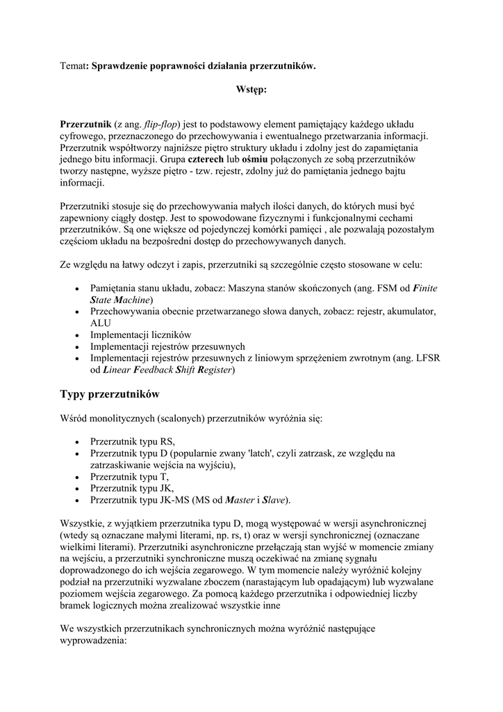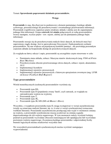 Temat: Sprawdzenie poprawności działania przerzutników. Wstęp: Przerzutnik (z ang. flip-flop) jest to podstawowy element pamiętający każdego układu cyfrowego, przeznaczonego do przechowywania i ewentualnego przetwarzania informacji. Przerzutnik współtworzy najniższe piętro struktury układu i zdolny jest do zapamiętania jednego bitu informacji. Grupa czterech lub ośmiu połączonych ze sobą przerzutników tworzy następne, wyższe piętro - tzw. rejestr, zdolny już do pamiętania jednego bajtu informacji. Przerzutniki stosuje się do przechowywania małych ilości danych, do których musi być zapewniony ciągły dostęp. Jest to spowodowane fizycznymi i funkcjonalnymi cechami przerzutników. Są one większe od pojedynczej komórki pamięci , ale pozwalają pozostałym częściom układu na bezpośredni dostęp do przechowywanych danych. Ze względu na łatwy odczyt i zapis, przerzutniki są szczególnie często stosowane w celu: • • • • • Pamiętania stanu układu, zobacz: Maszyna stanów skończonych (ang. FSM od Finite State Machine) Przechowywania obecnie przetwarzanego słowa danych, zobacz: rejestr, akumulator, ALU Implementacji liczników Implementacji rejestrów przesuwnych Implementacji rejestrów przesuwnych z liniowym sprzężeniem zwrotnym (ang. LFSR od Linear Feedback Shift Register) Typy przerzutników Wśród monolitycznych (scalonych) przerzutników wyróżnia się: • • • • • Przerzutnik typu RS, Przerzutnik typu D (popularnie zwany 'latch', czyli zatrzask, ze względu na zatrzaskiwanie wejścia na wyjściu), Przerzutnik typu T, Przerzutnik typu JK, Przerzutnik typu JK-MS (MS od Master i Slave). Wszystkie, z wyjątkiem przerzutnika typu D, mogą występować w wersji asynchronicznej (wtedy są oznaczane małymi literami, np. rs, t) oraz w wersji synchronicznej (oznaczane wielkimi literami). Przerzutniki asynchroniczne przełączają stan wyjść w momencie zmiany na wejściu, a przerzutniki synchroniczne muszą oczekiwać na zmianę sygnału doprowadzonego do ich wejścia zegarowego. W tym momencie należy wyróżnić kolejny podział na przerzutniki wyzwalane zboczem (narastającym lub opadającym) lub wyzwalane poziomem wejścia zegarowego. Za pomocą każdego przerzutnika i odpowiedniej liczby bramek logicznych można zrealizować wszystkie inne We wszystkich przerzutnikach synchronicznych można wyróżnić następujące wyprowadzenia: • • • • • wejście (lub wejścia) informacyjne - np. D (ang. Data) wejście synchronizujące, tzw. zegarowe C (ang. Clock) wejścia asynchroniczne - ustawiające Set i zerujące Reset (odpowiednio: 1 i 0 na wyjściu Q) wyjście proste Q wyjście zanegowane Q Wejścia R/S mają najwyższy priorytet i służą do wymuszenia określonego stanu wyjść niezależnie (asynchroniczne) od poziomów logicznych panujących na pozostałych wejściach informacyjnych czy zegarowych. W rodzimej literaturze spotyka się różne określenia (a nawet oznaczenia) tego samego funkcjonalnie rodzaju wejść. Dla przykładu wejście ustawiające bywa nazywane wejściem zapalającym, a wejście zegarowe C (CP, CL, CLK, T) - synchronizującym lub taktującym Przerzutniki typu D (flip-flop) należą do zbioru przerzutników wyzwalanych zboczem. Przepisanie stanu wejścia D (informacyjnego) na wyjście Q następuje w czasie zmiany poziomu logicznego na wejściu zegarowym z niskiego na wysoki. Przerzutnik typu D łatwo jest przekształcić w przerzutnik typu T i zrealizować dzielnik modulo 2 - tzw. dwójkę liczącą. W tym celu wystarczy połączyć wyjście zanegowane Q z wejściem D. Pojedyncza "dwójka" dzieli częstotliwość sygnału zegarowego na pół, przy czym wypełnienie przebiegu na wyjściu wynosi zawsze 50%. Łańcuch kaskadowo połączonych dwójek liczących może być wykorzystany do wytworzenia naturalnego kodu dwójkowego - podstawowego kodu wagowego używanego w technice cyfrowej. Stromość zboczy sygnałów zegarowych (wyrażana w nanosekundach), jest parametrem krytycznym w układach sekwencyjnych. Przerzutniki nie są tu wyjątkiem, stąd współcześnie wejścia zegarowe spotyka się najczęściej w wykonaniu Schmitta, charakteryzującym się obecnością tzw. pętli histerezy. Histereza oznacza 2 progi przełączania - inne dla każdego kierunku zmian napięcia na wejściu zegarowym. Przerzutnik typu Latch (zatrzask) jest wersją przerzutnika D wyzwalanego nie zboczem, lecz poziomem. W czasie trwania na wejściu zegarowym stanu wysokiego, wyjście Q powtarza stany logiczne wejścia D. W momencie zmiany na wejściu zegarowym stanu wysokiego na niski następuje "zatrzaśnięcie" (zapamiętanie) stanu wejścia D sprzed tej zmiany. Typowym zastosowaniem przerzutnika typu Latch jest zapamiętanie chwilowego stanu szyny danych w celu np. zobrazowania na wyświetlaczu. Dowolny przerzutnik tego typu charakteryzuje się mniejszą odpornością na zakłócenia od dowolnego przerzutnika wyzwalanego zboczem. Przerzutniki dwuzboczowe typu Master-Slave mają mniejsze wymagania na stromość zboczy. W ich przypadku wewnętrzny przerzutnik Master zapamiętuje stan wejść informacyjnych JK w momencie wystąpienia narastającego zbocza sygnału zegarowego, a zbocze opadające sygnału zegarowego przepisuje bit informacji z przerzutnika Master do przerzutnika Slave (i na wyjścia). Przerzutnik typu JK-MS można przekształcić w dwójkę liczącą przez podanie stanu wysokiego na oba wejścia J i K. W celu podwyższenia odporności na zakłócenia dwuzboczowych przerzutników MS, w układach praktycznych dąży się do skrócenia czasu trwania stanu wysokiego na wejściu zegarowym. Wszystkie przerzutniki w monolitycznych układach scalonych zbudowane są w oparciu o bramki logiczne. Każda bramka składa się z kolei z kilku/kilkunastu tranzystorów. Najprostsze przerzutniki asynchroniczne wymagają tylko dwóch dwuargumentowych (dwuwejściowych) bramek. Bardziej zaawansowane - kilkunastu wieloargumentowych