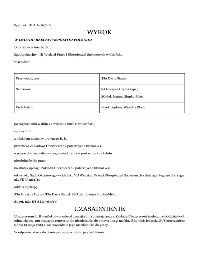 Sygn. akt III AUa 767/16 WYROK W IMIENIU RZECZYPOSPOLITEJ POLSKIEJ Dnia 22 września 2016 r. Sąd Apelacyjny - III Wydział Pracy i Ubezpieczeń Społecznych w Gdańsku w składzie: Przewodniczący: SSA Daria Stanek Sędziowie: SA Grażyna Czyżak (spr.) SO del. Joanna Siupka-Mróz Protokolant: st.sekr.sądowy Wioletta Blach po rozpoznaniu w dniu 22 września 2016 r. w Gdańsku sprawy L. B. z udziałem następcy prawnego B. B. przeciwko Zakładowi Ubezpieczeń Społecznych Oddział w G. o prawo do niezrealizowanego świadczenia w postaci renty z tytułu niezdolności do pracy na skutek apelacji Zakładu Ubezpieczeń Społecznych Oddział w G. od wyroku Sądu Okręgowego w Gdańsku VII Wydziału Pracy i Ubezpieczeń Społecznych z dnia 25 lutego 2016 r. sygn. akt VII U 1261/15 oddala apelację. SSA Grażyna Czyżak SSA Daria Stanek SSO del. Joanna Siupka-Mróz Sygn. akt III AUa 767/16 UZASADNIENIE Ubezpieczony L. B. wniósł odwołanie od decyzji z dnia 20 maja 2015 r. Zakładu Ubezpieczeń Społecznych Oddział w G. odmawiającej mu prawa do renty z tytułu niezdolności do pracy z uwagi na fakt, iż komisja lekarska ZUS orzeczeniem z dnia 15 maja 2015 r. nie stwierdziła jego niezdolności do pracy. W odpowiedzi na odwołanie pozwany wniósł o jego oddalenie. Sąd Okręgowy w Gdańsku - VII Wydział Pracy i Ubezpieczeń Społecznych wyrokiem z dnia 25 lutego 2016 r. w sprawie VII U 1261/15 zmienił zaskarżoną decyzję i przyznał ubezpieczonemu L. B. prawo do renty z tytułu całkowitej niezdolności do pracy od dnia 1 maja 2015 r. do dnia 30 kwietnia 2017 r. Podstawę tego rozstrzygnięcia stanowiły następujące ustalenia i rozważania Sądu pierwszej instancji. L. B., urodzony w dniu (...) z zawodu: monter, dekarz-blacharz, kierowca, mechanik samochodowy w dniu 17 marca 2015 r. złożył ponowny wniosek o rentę z tytułu niezdolności do pracy. Ubezpieczony był uprawniony do ww. świadczenia do dnia 30 kwietnia 2015 r. Lekarz orzecznik ZUS w opinii lekarskiej z dnia 16 kwietnia 2015 r. dokonał ustaleń, iż u ubezpieczonego doszło do naruszenia sprawności organizmu w stopniu niewielkim. Dysfunkcja ta ma charakter przewlekły i w porównaniu do poprzedniego badania orzeczniczego nastąpiła poprawa stanu zdrowia uznając, iż naruszona sprawność organizmu nie umożliwia wykonywania pracy zgodnej z poziomem posiadanych kwalifikacji. Komisja lekarska po rozpoznaniu sprzeciwu orzeczeniem z dnia 15 maja 2015 r. uznała, iż doszło do naruszenia funkcji w przebiegu choroby nowotworowej, bez cech wznowy, bez powikłań choroby i przebytej terapii. Stwierdzona niepełnosprawność jest w stopniu nie ograniczającym zdolności do zatrudnienia. W dniu 20 maja 2015 r. pozwany wydał zaskarżoną decyzję. Sąd Okręgowy weryfikując stanowisko pozwanego przeprowadził dowód z opinii biegłych sądowych laryngologa i onkologa. Biegli sądowi rozpoznali u wnioskodawcy następujące schorzenia: rak gardła dolnego z przerzutami do węzłów chłonnych szyi, rak płaskonabłonkowy języka – stan po częściowej resekcji, stan po radio i chemioterapii oraz podejrzenie przerzutu na szyi po stronie lewej październik 2015 r. niepotwierdzone w BAC. W opinii sądowej biegły laryngolog wskazał, iż nie doszło do poprawy zdrowia skarżącego, stwierdzony u niego rak gardła dolnego z przerzutami do węzłów chłonnych szyi po stronie prawej, potwierdzony badaniem histopatologicznym, leczony radio i chemioterapią, następnie z przerzutami do lewej połowy języka leczony częściową resekcją języka po lewej stronie w lipcu b.r. aktualnie nadal wymagał będzie resekcji układu chłonnego szyi po stronie lewej wraz ze ślinianką podżuchwową po tej stronie. Biegły podkreślił również, że jest to typowy przebieg choroby gardła dolnego raka płaskonabłonkowego, który często i wcześnie daje przerzuty do węzłów szyi z rokowaniem niepewnym i wątpliwym co do wyleczenia. Nadal nie ma żadnej poprawy w stanie zdrowia ubezpieczonego, co do całkowitego wyleczenia, jest natomiast dalszy postęp choroby neo. Z punktu widzenia biegłego stwierdzona choroba - rak płaskonabłonkowy 1,2 i 3 z podejrzeniem wznowy neo po stronie lewej - narusza sprawność organizmu skarżącego w stopniu umiarkowanym i powoduje nadal całkowitą niezdolność do pracy do 30 kwietnia 2017 r. uznając, iż jest to czas niezbędny do dalszego leczenia i ewentualnej rehabilitacji zdrowia. Biegły onkolog w opinii sądowej również wskazał, iż z punktu widzenia onkologicznego doszło wręcz do pogorszenia stanu zdrowia ubezpieczonego spowodowanego zdiagnozowaniem drugiego nowotworu złośliwego, leczonego operacyjnie i orzekł, że ubezpieczony po dniu 30 kwietnia 2015 r. jest nadal całkowicie niezdolny do pracy do końca kwietnia 2017 r. Sąd Okręgowy uwzględniając treść art. 12, art. 57 i art. 61 ustawy z dnia 17 grudnia 1998 r. o emeryturach i rentach z Funduszu Ubezpieczeń Społecznych (t.j. Dz.U. z 2016 r., poz. 887 ze zm.) uznał, że ubezpieczony jest całkowicie, okresowo niezdolny do pracy zarobkowej od dnia 1 maja 2015 r. do dnia 30 kwietnia 2017 r. Sąd Okręgowy nie orzekł o odpowiedzialności organu rentowego z uwagi na fakt, iż oceniający zdolność od pracy skarżącego biegli dysponowali dodatkową dokumentacją (m. in. w postaci wypisów ze szpitala), którą nie dysponował pozwany na etapie postępowania przed organem rentowym. Apelację od wyroku wywiódł organ rentowy zaskarżając go w całości i zarzucając naruszenie prawa procesowego, tj. art. 477 14 § 4 k.p.c. poprzez orzeczenie co do istoty sprawy na podstawie nowych okoliczności dotyczących stwierdzenia niezdolności do pracy, które powstały po dniu złożenia odwołania od decyzji. Wskazując na powyższe wniósł o uchylenie zaskarżonego wyroku w całości i przekazanie sprawy do ponownego rozpatrzenia przez organ rentowy. W uzasadnieniu apelacji organ rentowy wskazał, że na dzień wydania decyzji nie z