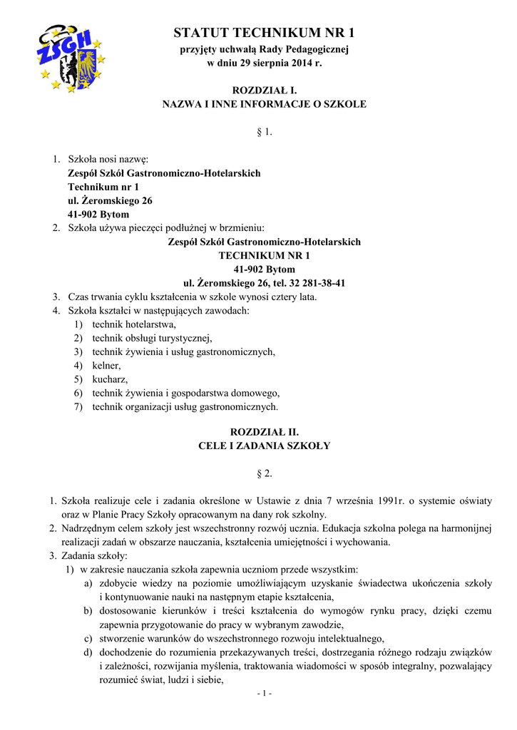 STATUT TECHNIKUM NR 1 przyjęty uchwałą Rady Pedagogicznej w dniu 29 sierpnia 2014 r. ROZDZIAŁ I. NAZWA I INNE INFORMACJE O SZKOLE § 1. 1. Szkoła nosi nazwę: Zespół Szkół Gastronomiczno-Hotelarskich Technikum nr 1 ul. Żeromskiego 26 41-902 Bytom 2. Szkoła używa pieczęci podłużnej w brzmieniu: Zespół Szkół Gastronomiczno-Hotelarskich TECHNIKUM NR 1 41-902 Bytom ul. Żeromskiego 26, tel. 32 281-38-41 3. Czas trwania cyklu kształcenia w szkole wynosi cztery lata. 4. Szkoła kształci w następujących zawodach: 1) technik hotelarstwa, 2) technik obsługi turystycznej, 3) technik żywienia i usług gastronomicznych, 4) kelner, 5) kucharz, 6) technik żywienia i gospodarstwa domowego, 7) technik organizacji usług gastronomicznych. ROZDZIAŁ II. CELE I ZADANIA SZKOŁY § 2. 1. Szkoła realizuje cele i zadania określone w Ustawie z dnia 7 września 1991r. o systemie oświaty oraz w Planie Pracy Szkoły opracowanym na dany rok szkolny. 2. Nadrzędnym celem szkoły jest wszechstronny rozwój ucznia. Edukacja szkolna polega na harmonijnej realizacji zadań w obszarze nauczania, kształcenia umiejętności i wychowania. 3. Zadania szkoły: 1) w zakresie nauczania szkoła zapewnia uczniom przede wszystkim: a) zdobycie wiedzy na poziomie umożliwiającym uzyskanie świadectwa ukończenia szkoły i kontynuowanie nauki na następnym etapie kształcenia, b) dostosowanie kierunków i treści kształcenia do wymogów rynku pracy, dzięki czemu zapewnia przygotowanie do pracy w wybranym zawodzie, c) stworzenie warunków do wszechstronnego rozwoju intelektualnego, d) dochodzenie do rozumienia przekazywanych treści, dostrzegania różnego rodzaju związków i zależności, rozwijania myślenia, traktowania wiadomości w sposób integralny, pozwalający rozumieć świat, ludzi i siebie, -1- e) poznawanie dziedzictwa kultury narodowej, podtrzymywanie poczucia tożsamości narodowej i językowej, f) poznawanie zasad rozwoju osobowego i mechanizmów życia społecznego; 2) w zakresie umiejętności szkoła uczy: a) planowania, organizowania, oceniania procesu własnego uczenia się, b) skutecznego porozumiewania się, którego podstawą jest dialog, konstruktywna wymiana myśli, c) efektywnego współdziałania w zespole, funkcjonującym na zasadach współpracy, d) kreatywnej postawy wobec problemów oraz ich rozwiązywania w twórczy sposób, e) korzystania z informacji z różnych źródeł, f) umiejętności wykorzystywania wiedzy w praktycznym działaniu; 3) szkoła w swej pracy wychowawczej zmierza do tego, aby uczniowie: a) znajdowali w szkole warunki do wszechstronnego rozwoju osobowości, b) stawali się samodzielni w dążeniu do dobra w jego wymiarze indywidualnym i społecznym, godząc umiejętnie dobro własne z dobrem innych, odpowiedzialność za siebie i za innych, wolność własną z wolnością innych, c) mieli świadomość użyteczności edukacji szkolnej, d) dążyli poprzez rzetelną pracę do osiągnięcia wartości ważnych w otaczającym ich świecie, e) uczyli się szacunku dla dobra wspólnego jako podstawy życia społecznego oraz przygotowywali się do życia w rodzinie, w społeczności lokalnej i w państwie w duchu przekazu dziedzictwa kulturowego regionu i kształtowania postaw patriotycznych, f) przygotowywali się do rozpoznawania i hierarchizowania wartości moralnych, umożliwiających dokonywanie właściwych wyborów, g) kształtowali w sobie postawę dialogu, tolerancji, otwartości na racje innych. § 3. 1. Nauczyciele sprawują opiekę nad uczniami w czasie zajęć edukacyjnych obowiązkowych i nadobowiązkowych, zajęć pozalekcyjnych oraz na wszystkich przerwach międzylekcyjnych. 2. Przy wyjściu z uczniami poza teren szkoły obowiązują odrębne przepisy dotyczące sprawowania opieki. 3. Nauczyciele i wychowawcy zobowiązani są również do podejmowania innych działań zleconych przez Dyrektora w ramach indywidualnego zakresu czynności oraz do doraźnego podejmowania działań z własnej inicjatywy, jeżeli wymaga tego sprawowanie opieki i bezpieczeństwo uczniów. 4. W celu zapewnienia bezpiecznych warunków nauki, wychowania i opieki budynki szkolne przy ul. Żeromskiego 26 i ul. Chrobrego 13 oraz teren szkolny objęto systemem monitoringu wizyjnego (kamery CCTV). 5. Nauczyciele, wychowawcy i pedagog podczas posiedzeń Rady Pedagogicznej analizują postępy uczniów w nauce w celu wyeliminowania trudności w osiąganiu dobrych wyników. W przypadku występowania niepowodzeń szkolnych uczniowi organizuje się pomoc. 6. Uczniom, którym z przyczyn rozwojowych, rodzinnych lub losowych potrzebna jest pomoc i wsparcie, w tym również pomoc materialna, szkoła - w ramach posiadanych na ten cel środków - zapewnia taką pomoc przez: 1) działalność pedagoga i psychologa szkolnego, 2) wywiad środowiskowy, 3) doraźną pomoc materialną, 4) stypendia lub zapomogi losowe. -2- § 4. 1. Szkoła umożliwia uczniom podtrzymywanie poczucia tożsamości narodowej, etnicznej, językowej, światopoglądowej i religijnej w procesie dydaktycznym między innymi przez organizowanie lekcji religii lub etyki. 2. Szkoła sprzyja rozwijaniu zainteresowań uczniów przez organizowanie zajęć dodatkowych, kół zainteresowań, różnych zajęć pozalekcyjnych i form aktywności. 3. Dodatkowe zajęcia edukacyjne Dyrektor może wprowadzić do szkolnego planu nauczania po zasięgnięciu opinii Rady Pedagogicznej i Rady Rodziców. 4. W szkole funkcjonują przedmiotowe, sportowe i inne koła zainteresowań, stosownie do posiadanych środków finansowych oraz zainteresowań młodzieży. 5. Nauczyciele organizują dla młodzieży różne formy aktywności na terenie szkoły i poza nią, między innymi: 1) konkursy i turnieje, 2) imprezy szkolne, 3) imprezy sportowe, 4) wyjścia do kina, teatru, muzeum itd., 5) wyjścia do instytucji i urzędów w mieście i poza nim, 6) wyjścia do hoteli i zakładów gastronomicznych. 6. Wszystkie wyżej wymienione działania pod