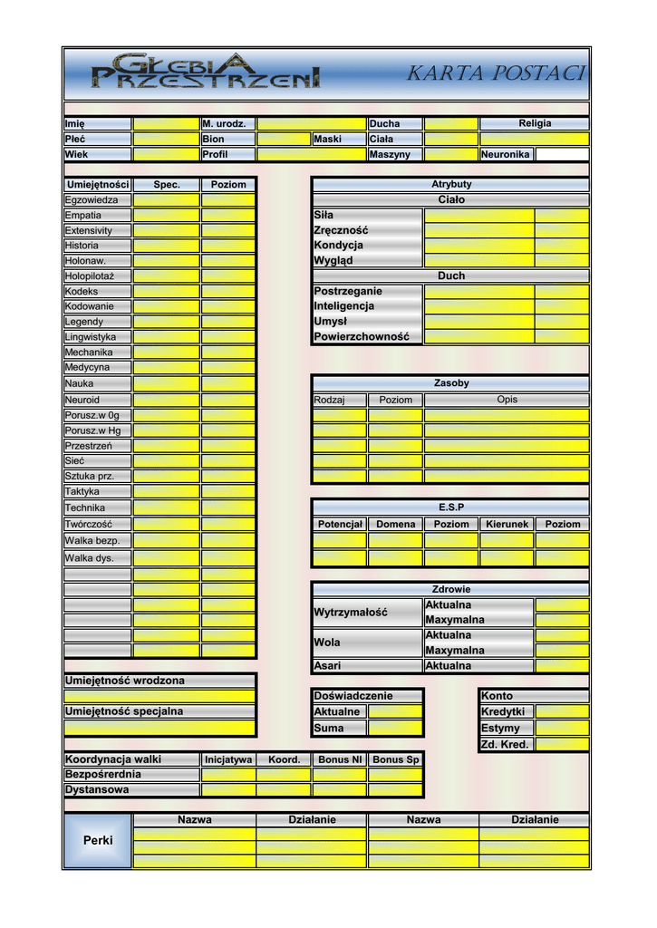 Karta postaci Imię M. urodz. Płeć Bion Wiek Profil Umiejętności Spec. Religia Ducha Maski Ciała Maszyny Neuronika Atrybuty Poziom Ciało Egzowiedza Siła Zręczność Kondycja Wygląd Empatia Extensivity Historia Holonaw. Holopilotaż Duch Postrzeganie Inteligencja Umysł Powierzchowność Kodeks Kodowanie Legendy Lingwistyka Mechanika Medycyna Zasoby Nauka Neuroid Rodzaj Opis Poziom Porusz.w 0g Porusz.w Hg Przestrzeń Sieć Sztuka prz. Taktyka E.S.P Technika Twórczość Potencjał Domena Poziom Kierunek Poziom Walka bezp. Walka dys. Zdrowie Aktualna Maxymalna Aktualna Maxymalna Aktualna Wytrzymałość Wola Asari Umiejętność wrodzona Doświadczenie Aktualne Suma Umiejętność specjalna Koordynacja walki Bezpośrerdnia Dystansowa Inicjatywa Nazwa Perki Koord. Bonus NI Działanie Konto Kredytki Estymy Zd. Kred. Bonus Sp Nazwa Działanie Karta ekwpiunku i opisów Sprzęt Broń Opis Opis Moc Moc Zw Zw Obrażenia Opis postaci Wygląd Historia Przyjaciele/ wrogowie/ rodzina Notatki Umiejscowienie Magazynek Typ Wartość Wartość