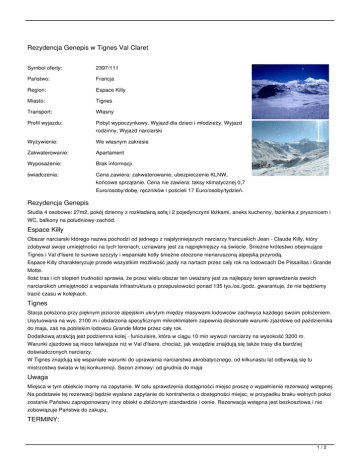 Rezydencja Genepis w Tignes Val Claret Symbol oferty: 2397/111 Państwo: Francja Region: Espace Killy Miasto: Tignes Transport: Własny Profil wyjazdu: Pobyt wypoczynkowy, Wyjazd dla dzieci i młodzieży, Wyjazd Wyżywienie: We własnym zakresie Zakwaterowanie: Apartament Wyposażenie: Brak informacji świadczenia: Cena zawiera: zakwaterowanie, ubezpieczenie KLNW, rodzinny, Wyjazd narciarski końcowe sprzątanie. Cena nie zawiera: taksy klimatycznej 0,7 Euro/osoby/dobę, ręczników i pościeli 17 Euro/osoby/tydzień. Rezydencja Genepis Studia 4 osobowe: 27m2, pokój dzienny z rozkładaną sofą i 2 pojedynczymi łóżkami, aneks kuchenny, łazienka z prysznicem i WC, balkony na południowy-zachód. Espace Killy Obszar narciarski którego nazwa pochodzi od jednego z najsłynniejszych narciarzy francuskich Jean - Claude Killy, który zdobywał swoje umiejętności na tych terenach, uznawany jest za najpiękniejszy na świecie. Śnieżne królestwo obejmujące Tignes i Val d'Isere to surowe szczyty i wspaniałe kotły śnieżne otoczone nienaruszoną alpejską przyrodą. Espace Killy charakteryzuje przede wszystkim możliwość jazdy na nartach przez cały rok na lodowcach De Pissaillas i Grande Motte. Ilość tras i ich stopień trudności sprawia, że przez wielu obszar ten uważany jest za najlepszy teren sprawdzenia swoich narciarskich umiejętności a wspaniała infrastruktura o przepustowości ponad 135 tys./os./godz. gwarantuje, że nie będziemy tracić czasu w kolejkach. Tignes Stacja położona przy pięknym jeziorze alpejskim ukrytym między masywami lodowców zachwyca każdego swoim położeniem. Usytuowana na wys. 2100 m i obdarzona specyficznym mikroklimatem zapewnia doskonałe warunki zjazdowe od października do maja, zaś na pobliskim lodowcu Grande Motte przez cały rok. Dodatkową atrakcją jest podziemna kolej - funiculaire, która w ciągu 10 min wywozi narciarzy na wysokość 3200 m. Warunki zjazdowe są nieco łatwiejsze niż w Val d'Isere, chociaż, jak wszędzie znajdują się także trasy dla bardziej doświadczonych narciarzy. W Tignes znajdują się wspaniałe warunki do uprawiania narciarstwa akrobatycznego, od kilkunastu lat odbywają się tu mistrzostwa świata w tej konkurencji. Sezon zimowy: od grudnia do maja Uwaga Miejsca w tym obiekcie mamy na zapytanie. W celu sprawdzenia dostępności miejsc proszę o wypełnienie rezerwacji wstępnej. Na podstawie tej rezerwacji będzie wysłane zapytanie do kontrahenta o dostępności miejsc, w przypadku braku wolnych pokoi zostanie Państwu zaproponowany inny obiekt o zbliżonym standardzie i cenie. Rezerwacja wstępna jest bezkosztowa i nie zobowiązuje Państwa do zakupu. TERMINY: 1/2 od: 2017-03-12 do: 2017-03-19 (8 dni), miejsca: zamów cena od: 946 PLN = 217 EUR od: 2017-03-19 do: 2017-03-26 (8 dni), miejsca: zamów cena od: 946 PLN = 217 EUR od: 2017-03-26 do: 2017-04-02 (8 dni), miejsca: zamów cena od: 946 PLN = 217 EUR od: 2017-04-02 do: 2017-04-09 (8 dni), miejsca: zamów cena od: 946 PLN = 217 EUR CENNIK: Długość pobytu: 8 dni Grupa cenowa: I Pobyt w obiekcie (do wyboru) (*) studio 4-osobowe standardowo dla osób: 4 Ubezpieczenie (do wyboru) (*) ubezpieczenie NW KL ubezpieczene NWKL SKI Ubezpieczenie (opcjonalne) ubezpieczenie - od kosztów rezygnacji 841 7 15 2.4 % Waluta: EUR Aktualne ceny z systemu S.A.R.T. (-) - cena usługi, podatku kalkulowana przy osobie lub gratis (*) - kwota wliczona w cenę standardową 2/2