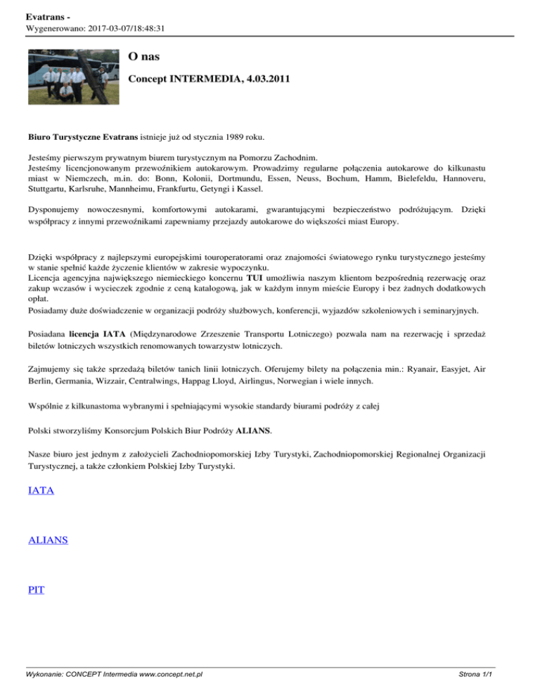 Evatrans Wygenerowano: 2017-03-07/18:48:31 O nas Concept INTERMEDIA, 4.03.2011 Biuro Turystyczne Evatrans istnieje już od stycznia 1989 roku. Jesteśmy pierwszym prywatnym biurem turystycznym na Pomorzu Zachodnim. Jesteśmy licencjonowanym przewoźnikiem autokarowym. Prowadzimy regularne połączenia autokarowe do kilkunastu miast w Niemczech, m.in. do: Bonn, Kolonii, Dortmundu, Essen, Neuss, Bochum, Hamm, Bielefeldu, Hannoveru, Stuttgartu, Karlsruhe, Mannheimu, Frankfurtu, Getyngi i Kassel. Dysponujemy nowoczesnymi, komfortowymi autokarami, gwarantującymi bezpieczeństwo podróżującym. Dzięki współpracy z innymi przewoźnikami zapewniamy przejazdy autokarowe do większości miast Europy. Dzięki współpracy z najlepszymi europejskimi touroperatorami oraz znajomości światowego rynku turystycznego jesteśmy w stanie spełnić każde życzenie klientów w zakresie wypoczynku. Licencja agencyjna największego niemieckiego koncernu TUI umożliwia naszym klientom bezpośrednią rezerwację oraz zakup wczasów i wycieczek zgodnie z ceną katalogową, jak w każdym innym mieście Europy i bez żadnych dodatkowych opłat. Posiadamy duże doświadczenie w organizacji podróży służbowych, konferencji, wyjazdów szkoleniowych i seminaryjnych. Posiadana licencja IATA (Międzynarodowe Zrzeszenie Transportu Lotniczego) pozwala nam na rezerwację i sprzedaż biletów lotniczych wszystkich renomowanych towarzystw lotniczych. Zajmujemy się także sprzedażą biletów tanich linii lotniczych. Oferujemy bilety na połączenia min.: Ryanair, Easyjet, Air Berlin, Germania, Wizzair, Centralwings, Happag Lloyd, Airlingus, Norwegian i wiele innych. Wspólnie z kilkunastoma wybranymi i spełniającymi wysokie standardy biurami podróży z całej Polski stworzyliśmy Konsorcjum Polskich Biur Podróży ALIANS. Nasze biuro jest jednym z założycieli Zachodniopomorskiej Izby Turystyki, Zachodniopomorskiej Regionalnej Organizacji Turystycznej, a także członkiem Polskiej Izby Turystyki. IATA ALIANS PIT Wykonanie: CONCEPT Intermedia www.concept.net.pl Strona 1/1