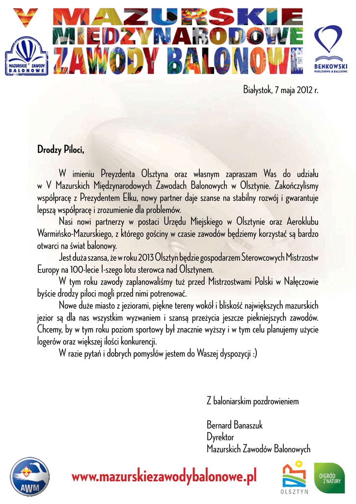 Białystok, 7 maja 2012 r. Drodzy Piloci, W imieniu Preyzdenta Olsztyna oraz własnym zapraszam Was do udziału w V Mazurskich Międzynarodowych Zawodach Balonowych w Olsztynie. Zakończylismy współpracę z Prezydentem Ełku, nowy partner daje szanse na stabilny rozwój i gwarantuje lepszą współpracę i zrozumienie dla problemów. Nasi nowi partnerzy w postaci Urzędu Miejskiego w Olsztynie oraz Aeroklubu Warmińsko-Mazurskiego, z którego gościny w czasie zawodów będziemy korzystać są bardzo otwarci na świat balonowy. Jest duża szansa, że w roku 2013 Olsztyn będzie gospodarzem Sterowcowych Mistrzostw Europy na 100-lecie I-szego lotu sterowca nad Olsztynem. W tym roku zawody zaplanowaliśmy tuż przed Mistrzostwami Polski w Nałęczowie byście drodzy piloci mogli przed nimi potrenować. Nowe duże miasto z jeziorami, piękne tereny wokół i bliskość największych mazurskich jezior są dla nas wszystkim wyzwaniem i szansą przeżycia jeszcze piekniejszych zawodów. Chcemy, by w tym roku poziom sportowy był znacznie wyższy i w tym celu planujemy użycie logerów oraz większej ilości konkurencji. W razie pytań i dobrych pomysłów jestem do Waszej dyspozycji :) Z baloniarskim pozdrowieniem Bernard Banaszuk Dyrektor Mazurskich Zawodów Balonowych www.mazurskiezawodybalonowe.pl Program zawodów 26-29 lipiec 2012 26.07.2012 – Czwartek 9:00-14:00 – Rejestracja załóg na lotnisku Aeroklubu Warmińsko-Mazurskiego http://www.aeroklub.olsztyn.pl/index.php/kontakt.html 17:00 – Uroczyste otwarcie zawodów i generalna odprawa pilotów również na lotnisku, 18:00 – Popołudniowy lot do konkurencji, 21:00 – Wspólne Grillowanie w „Balloons Garden”, 27.07.2012 – Piątek 5:00 – Poranna odprawa pilotów, 5:45 – Poranny lot do konkurencji, 12.00 – 15.30 Czas Atrakcji? (szczegóły wkrótce), 17:00 – Popołudniowa odprawa pilotów, 17:45 – Popołudniowy lot do konkurencji, 22.00 – Wielka Parada Baloniarzy głównymi ulicami Olsztyna, 22:45 – Wspólne Grillowanie w „Balloons Garden”, 28.07.2012 – Sobota 5:00 – Poranna odprawa pilotów, 5:45 – Poranny lot do konkurencji, 12.00-15.00 – Czas Atrakcji ? (szczegóły wkrótce), 17:00 – Popołudniowa odprawa pilotów, 17:45 – Popołudniowy lot do konkurencji, 21:30 – Nocny Pokaz Balonów w centrum Olsztyna, 23:00 – Wręczenie pucharów i nagród & uroczysty bankiet + Disco Party , 27.02.2011 – Niedziela 6:00 – Poranna odprawa do konkurencji o Puchar Prezesa firmy Notatek, 6:25 – Poranny lot, po locie wręczenie nagrody i pucharu. www.mazurskiezawodybalonowe.pl www.mazurskiezawodybalonowe.pl
