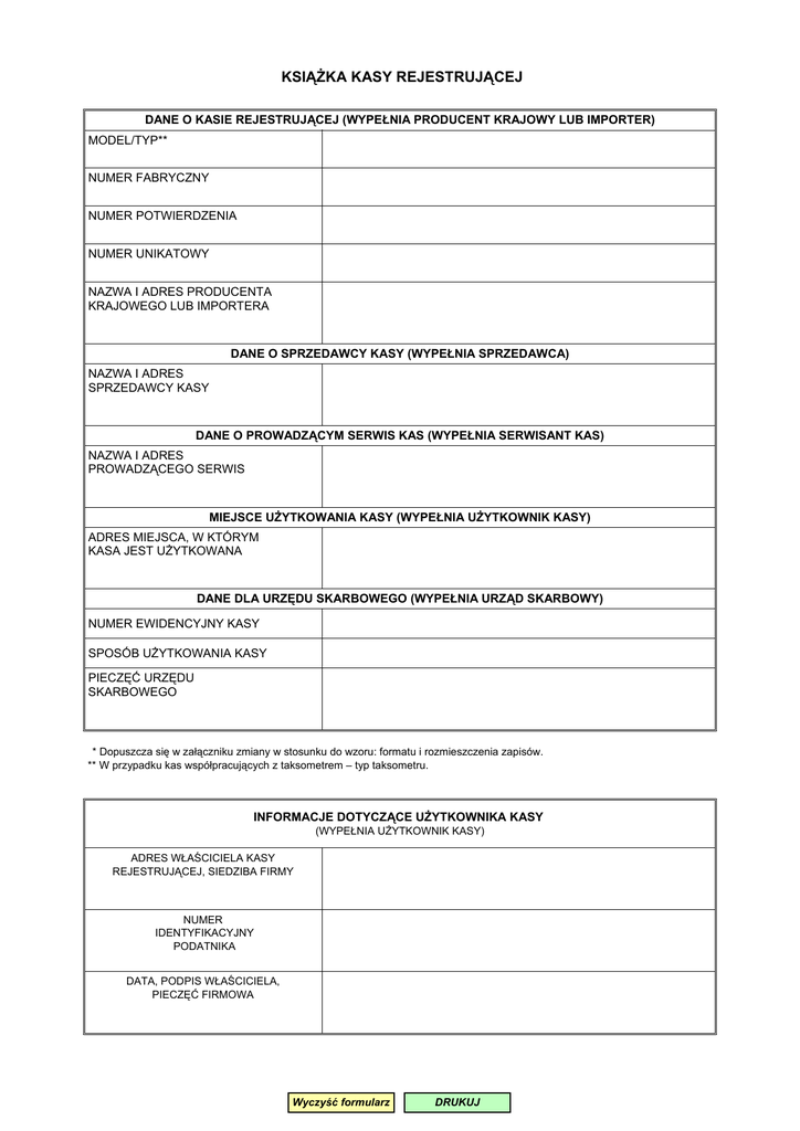 KSIĄŻKA KASY REJESTRUJĄCEJ DANE O KASIE REJESTRUJĄCEJ (WYPEŁNIA PRODUCENT KRAJOWY LUB IMPORTER) MODEL/TYP** NUMER FABRYCZNY NUMER POTWIERDZENIA NUMER UNIKATOWY NAZWA I ADRES PRODUCENTA KRAJOWEGO LUB IMPORTERA DANE O SPRZEDAWCY KASY (WYPEŁNIA SPRZEDAWCA) NAZWA I ADRES SPRZEDAWCY KASY DANE O PROWADZĄCYM SERWIS KAS (WYPEŁNIA SERWISANT KAS) NAZWA I ADRES PROWADZĄCEGO SERWIS MIEJSCE UŻYTKOWANIA KASY (WYPEŁNIA UŻYTKOWNIK KASY) ADRES MIEJSCA, W KTÓRYM KASA JEST UŻYTKOWANA DANE DLA URZĘDU SKARBOWEGO (WYPEŁNIA URZĄD SKARBOWY) NUMER EWIDENCYJNY KASY SPOSÓB UŻYTKOWANIA KASY PIECZĘĆ URZĘDU SKARBOWEGO * Dopuszcza się w załączniku zmiany w stosunku do wzoru: formatu i rozmieszczenia zapisów. ** W przypadku kas współpracujących z taksometrem – typ taksometru. INFORMACJE DOTYCZĄCE UŻYTKOWNIKA KASY (WYPEŁNIA UŻYTKOWNIK KASY) ADRES WŁAŚCICIELA KASY REJESTRUJĄCEJ, SIEDZIBA FIRMY NUMER IDENTYFIKACYJNY PODATNIKA DATA, PODPIS WŁAŚCICIELA, PIECZĘĆ FIRMOWA Wyczyść formularz DRUKUJ INSTALACJA KASY REJESTRUJĄCEJ (WPROWADZENIE W TRYB FISKALNY) DATA I GODZINA STAN LICZNIKA NIEFISKALNEGO PODPIS I PIECZĘĆ PROWADZĄCEGO SERWIS KAS DATA, PODPIS, PIECZĘĆ WŁAŚCICIELA, UŻYTKOWNIKA KASY REJESTRUJĄCEJ POTWIERDZENIE CAŁOŚCI PLOMB KASY REJESTRUJĄCEJ PRZEZ WŁAŚCICIELA, UŻYTKOWNIKA KASY REJESTRUJĄCEJ ZMIANY MIEJSCA UŻYTKOWANIA KASY, WYMIANA PAMIĘCI FISKALNEJ KASY, ZMIANY SPOSOBU UŻYTKOWANIA KASY, OPCJE AKCEPTACJA NACZELNIKA URZĘDU SKARBOWEGO RODZAJ ZMIANY Wyczyść formularz DRUKUJ OSOBY UPOWAŻNIONE DO WYKONYWANIA SERWISU KASY REJESTRUJĄCEJ (WYPEŁNIA PROWADZĄCY SERWIS KAS/KIEROWNIK PUNKTU SERWISU KAS) NAZWISKO I IMIĘ NUMER IDENTYFIKACYJNY PODPIS I PIECZĘĆ KIEROWNIKA SERWISU NUMER IDENTYFIKACYJNY PODPIS I PIECZĘĆ KIEROWNIKA SERWISU NUMER IDENTYFIKACYJNY PODPIS I PIECZĘĆ KIEROWNIKA SERWISU NUMER IDENTYFIKACYJNY PODPIS I PIECZĘĆ KIEROWNIKA SERWISU NUMER IDENTYFIKACYJNY PODPIS I PIECZĘĆ KIEROWNIKA SERWISU ADRES PUNKTU SERWISOWEGO I TELEFON NAZWISKO I IMIĘ ADRES PUNKTU SERWISOWEGO I TELEFON NAZWISKO I IMIĘ ADRES PUNKTU SERWISOWEGO I TELEFON NAZWISKO I IMIĘ ADRES PUNKTU SERWISOWEGO I TELEFON NAZWISKO I IMIĘ ADRES PUNKTU SERWISOWEGO I TELEFON Osoby, które nie świadczą serwisu, kierownik serwisu wykreśla i potwierdza pieczęcią z dniem zaprzestania jego świadczenia. Wyczyść formularz DRUKUJ ŻĄDANIE INTERWENCJI SERWISU KAS (WYPEŁNIA UŻYTKOWNIK KASY) DATA, GODZINA KTO WEZWAŁ KOGO POWIADOMIŁ Wyczyść formularz DRUKUJ W JAKI SPOSÓB POTWIERDZENIE SERWISANTA KAS INTERWENCJE TECHNICZNE SERWISU KAS (WYPEŁNIA PROWADZĄCYSERWIS KASY) DATA GODZINA STAN LICZNIKÓW PARAGONÓW FISKALNYCH RAPORTU FISK. DOB. ZEROWANIA RAM NIEFISKALNEGO (OGÓLNY) OPIS ZGŁOSZONYCH NIEPRAWIDŁOWOŚCI DZIAŁANIA KASY REJESTRUJĄCEJ STAN PLOMB KASY, LICZBA ELEMENTY KASY REJESTRUJĄCEJ WYMIENIONE PRZY NAPRAWIE WYSZCZEGÓLNIENIE DRUKOWANYCH DOKUMENTÓW FISKALNYCH PRZYCZYNY, Z POWODU KTÓRYCH JEST NIEMOŻLIWA NAPRAWA KASY NA MIEJSCU MIEJSCE NAPRAWY KASY, ADRES SERWISU PODPIS I PIECZĘĆ PROWADZĄCEGO SERWIS KAS ODBIÓR NAPRAWIONEJ KASY REJESTRUJĄCEJ DATA GODZINA STAN LICZNIKÓW PARAGONÓW FISKALNYCH RAPORTU FISK. DOB. ZEROWANIA RAM NIEFISKALNEGO (OGÓLNY) DATA, GODZINA, PODPIS I PIECZĘĆ UŻYTKOWNIKA KASY POTWIERDZENIE ODBIORU KASY - ZWROT DOKUMENTÓW FISKALNYCH - STAN PLOMB PRAWIDŁOWY Wyczyść formularz DRUKUJ PRZEGLĄD TECHNICZNY KASY REJESTRUJĄCEJ (WYPEŁNIA SERWISANT KAS) DATA WYKONANIA PRZEGLĄDU TECHNICZNEGO STWIERDZONE NIEPRAWIDŁOWOŚCI DZIAŁANIA KASY REJESTRUJĄCEJ Wyczyść formularz DRUKUJ PODPIS I PIECZĘĆ SERWISANTA KAS RODZAJE URZĄDZEŃ ORAZ NOŚNIKÓW (PARAMETRY TECHNICZNE) DO STOSOWANIA PRZY ARCHIWIZOWANIU KOPII NA INFORMATYCZNYCH NOŚNIKACH DANYCH/RODZAJ PAPIERU TERMICZNEGO L.P. RODZAJE URZĄDZEŃ LUB NOŚNIKÓW/RODZAJ PAPIERU TERMICZNEGO DO DRUKU DOKUMENTÓW KASOWYCH PARAMETRY TECHNICZNE Wyczyść formularz OZNACZENIE STOSOWANEGO PROGRAMU ARCHIWIZUJĄCEGO /PROGRAMU ODCZYTU PAMIĘCI FISKALNEJ KASY DRUKUJ PODPIS I PIECZĘĆ PRODUCENTA KRAJOWEGO LUB IMPORTERA