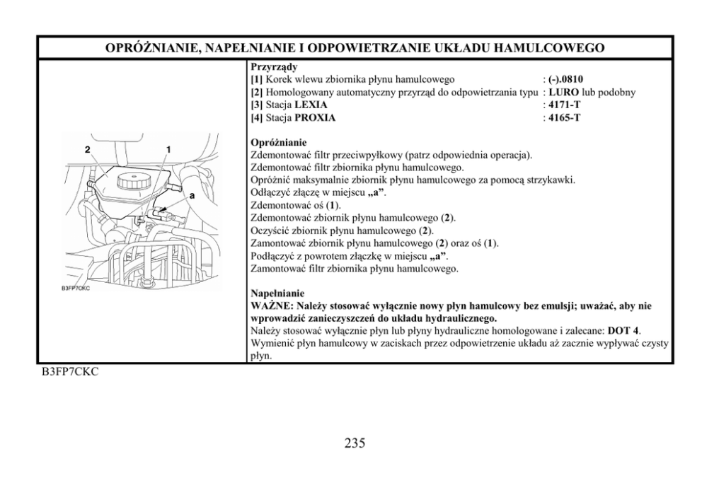 OPRÓśNIANIE, NAPEŁNIANIE I ODPOWIETRZANIE UKŁADU HAMULCOWEGO Przyrządy [1] Korek wlewu zbiornika płynu hamulcowego [2] Homologowany automatyczny przyrząd do odpowietrzania typu [3] Stacja LEXIA [4] Stacja PROXIA : (-).0810 : LURO lub podobny : 4171-T : 4165-T OpróŜnianie Zdemontować filtr przeciwpyłkowy (patrz odpowiednia operacja). Zdemontować filtr zbiornika płynu hamulcowego. OpróŜnić maksymalnie zbiornik płynu hamulcowego za pomocą strzykawki. Odłączyć złączę w miejscu „a”. Zdemontować oś (1). Zdemontować zbiornik płynu hamulcowego (2). Oczyścić zbiornik płynu hamulcowego (2). Zamontować zbiornik płynu hamulcowego (2) oraz oś (1). Podłączyć z powrotem złączkę w miejscu „a”. Zamontować filtr zbiornika płynu hamulcowego. Napełnianie WAśNE: NaleŜy stosować wyłącznie nowy płyn hamulcowy bez emulsji; uwaŜać, aby nie wprowadzić zanieczyszczeń do układu hydraulicznego. NaleŜy stosować wyłącznie płyn lub płyny hydrauliczne homologowane i zalecane: DOT 4. Wymienić płyn hamulcowy w zaciskach przez odpowietrzenie układu aŜ zacznie wypływać czysty płyn. B3FP7CKC 235 OPRÓśNIANIE, NAPEŁNIANIE I ODPOWIETRZANIE UKŁADU HAMULCOWEGO Odpowietrzanie głównego układu hamulcowego UWAGA: Przestrzegać kolejności otwierania śrub odpowietrzających: od 1 do 6. A: Zaciski hamulców; LUCAS (z przodu). B: Zaciski hamulców; BREMBO (z przodu). Moment dokręcania śruby odpowietrzającej: Zaciski hamulców z przodu : 1,5 ± 0,1 Zaciski hamulców z tyłu : 1,5 ± 0,1 UWAGA: Podczas operacji odpowietrzania: naleŜy uwaŜać, aby utrzymywać właściwy poziom płynu hamulcowego w zbiorniku i w miarę potrzeby uzupełniać, dolewając wyłącznie czysty płyn, bez emulsji. Za pomocą przyrządu do odpowietrzania Zamontować przyrząd [1] do zbiornika płynu hamulcowego (2). Podłączyć przyrząd [1] do jednego z homologowanych automatycznych przyrządów do odpowietrzania. Ustawić ciśnienie przyrządu : 2 bary Dla kaŜdego układu hamulcowego: Podłączyć przewód przezroczysty do śruby odpowietrzającej, drugi koniec przewodu wstawić do czystego pojemnika. Odkręcić śrubę odpowietrzającą; poczekać, aŜ płyn hamulcowy zacznie wyciekać bez pęcherzyków powietrza. Wkręcić śrubę odpowietrzającą. Usunąć przyrząd do odpowietrzania. Sprawdzić poziom płynu hamulcowego (pomiędzy poziomem „MINI” a poziomem „MAXI”). Napełnić, jeŜeli jest to konieczne, syntetycznym płynem hamulcowym, homologowanym i zalecanym. B3FP7CLD 236 OPRÓśNIANIE, NAPEŁNIANIE I ODPOWIETRZANIE UKŁADU HAMULCOWEGO Bez pomocy przyrządu do odpowietrzania UWAGA: Do wykonania tej czynności potrzeba dwóch mechaników. Podłączyć przezroczysty przewód do śruby odpowietrzającej. Powoli nacisnąć na pedał hamulca. Odkręcić śrubę odpowietrzającą. Przytrzymać pedał naciśnięty do oporu. Wkręcić śrubę odpowietrzającą. Poczekać aŜ pedał hamulca sam wróci do górnego połoŜenia. Powtórzyć operację aŜ zacznie wypływać czysty płyn hamulcowy bez pęcherzyków powietrza. Postępować w ten sam sposób w przypadku pozostałych kół. Sprawdzić poziom płynu hamulcowego (pomiędzy poziomem „MINI” a poziomem „MAXI”). Napełnić, jeŜeli jest to konieczne, syntetycznym płynem hamulcowym, homologowanym i zalecanym. Odpowietrzanie pomocniczego układu hamulcowego UWAGA: Przyrząd do odpowietrzania przez cały czas podłączony jest do zbiornika płynu hamulcowego. Stosować przyrząd diagnostyczny LEXIA lub PROXIA. Wybrać menu ABS lub ESP (w zaleŜności od wersji). Postępować zgodnie z poleceniami przyrządu diagnostycznego. Na koniec programu odpowietrzania sprawdzić i uzupełnić poziom płynu hamulcowego, jeŜeli jest to konieczne. Sprawdzić skok pedału hamulca (wydłuŜenie jest niedopuszczalne), w przeciwnym razie powtórzyć procedurę odpowietrzania. Usunąć oprzyrządowanie. B3FP7CLD 237