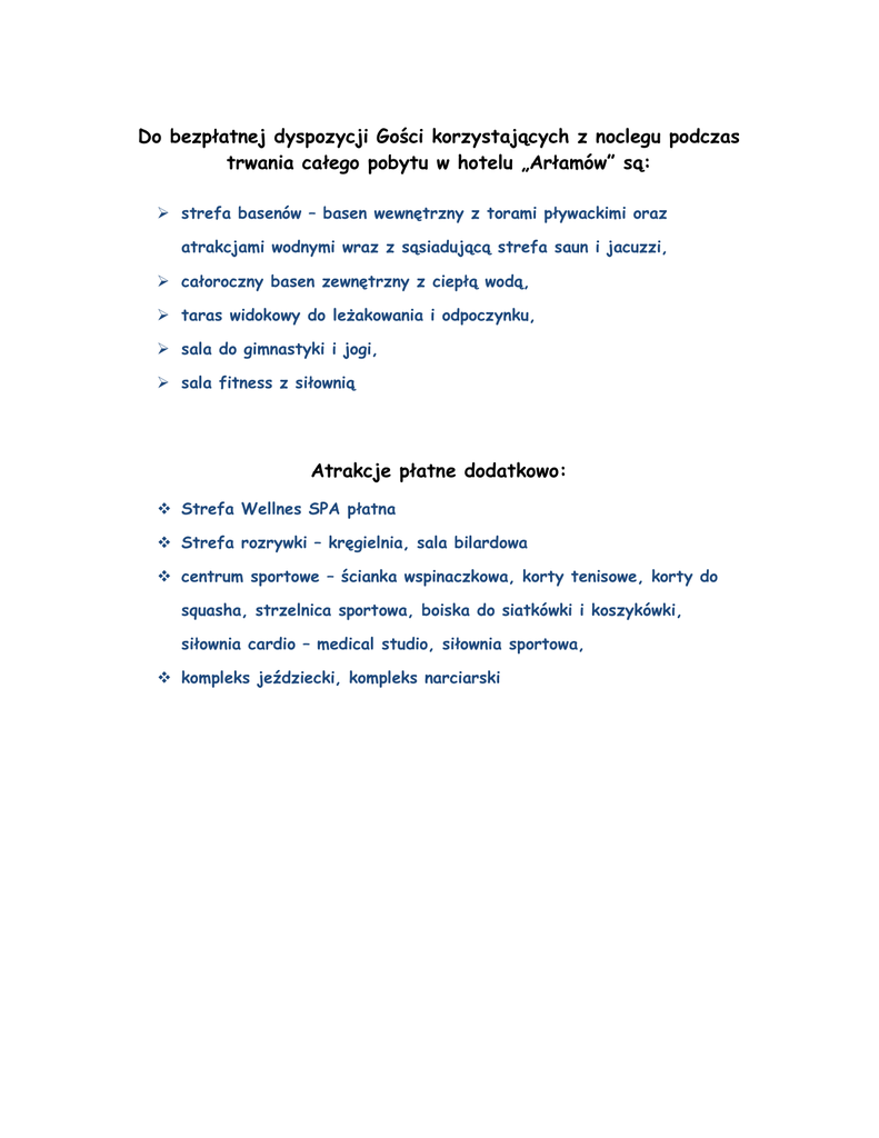 Do bezpłatnej dyspozycji Gości korzystających z noclegu podczas trwania całego pobytu w hotelu „Arłamów” są: strefa basenów – basen wewnętrzny z torami pływackimi oraz atrakcjami wodnymi wraz z sąsiadującą strefa saun i jacuzzi, całoroczny basen zewnętrzny z ciepłą wodą, taras widokowy do leŜakowania i odpoczynku, sala do gimnastyki i jogi, sala fitness z siłownią Atrakcje płatne dodatkowo: Strefa Wellnes SPA płatna Strefa rozrywki – kręgielnia, sala bilardowa centrum sportowe – ścianka wspinaczkowa, korty tenisowe, korty do squasha, strzelnica sportowa, boiska do siatkówki i koszykówki, siłownia cardio – medical studio, siłownia sportowa, kompleks jeździecki, kompleks narciarski