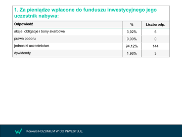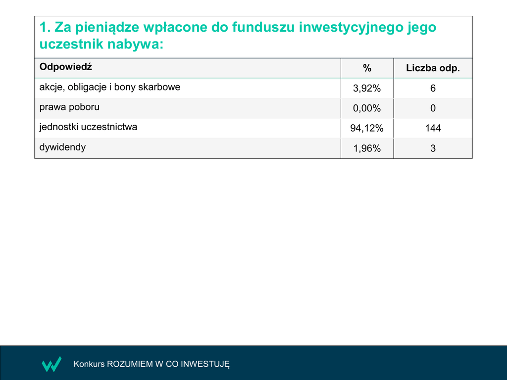 1. Za pieniądze wpłacone do funduszu inwestycyjnego jego uczestnik nabywa: Odpowiedź % Liczba odp. akcje, obligacje i bony skarbowe 3,92% 6 prawa poboru 0,00% 0 jednostki uczestnictwa 94,12% 144 dywidendy 1,96% 3 Konkurs ROZUMIEM W CO INWESTUJĘ 2. W grupie funduszy inwestujących w dłużne papiery wartościowe najbardziej konserwatywną politykę inwestycyjną mają: Odpowiedź % Liczba odp. fundusze obligacji korporacyjnych 3,14% 5 fundusze obligacji skarbowych 39,62% 63 fundusze depozytowe 5,66% 9 fundusze rynku pieniężnego 51,57% 82 Konkurs ROZUMIEM W CO INWESTUJĘ 3. Inwestując w fundusze za pośrednictwem bossafund.pl nie ponosimy opłat: Odpowiedź % Liczba odp. za zarządzanie 8,86% 14 bieżących 1,27% 2 rocznych 3,16% 5 manipulacyjnych 86,71% 137 Konkurs ROZUMIEM W CO INWESTUJĘ 4. Towarzystwa Funduszy Inwestycyjnych (TFI) działają w oparciu o: Odpowiedź % Liczba odp. Ustawę Prawo Bankowe 3,77% 6 Ustawę o działalności ubezpieczeniowej 1,26% 2 Ustawę o funduszach inwestycyjnych 76,73% 122 Ustawę o TFI 18,24% 29 Konkurs ROZUMIEM W CO INWESTUJĘ 5. Pod względem prawnym fundusz inwestycyjny: Odpowiedź % Liczba odp. jest własnością danego TFI 19,58% 28 jest wyodrębnioną grupą aktywów TFI 23,78% 34 jest oddzielnym podmiotem prawnym 54,55% 78 jest własnością zarządzającego funduszem 2,10% 3 Konkurs ROZUMIEM W CO INWESTUJĘ 6. Nabycie przez inwestora jednostek uczestnictwa w danym funduszu może nastąpić wtedy, gdy jego środki trafią na: Odpowiedź % Liczba odp. rachunek tego funduszu 63,47% 106 rachunek w domu maklerskim 7,19% 12 rachunek TFI 20,96% 35 rachunek agenta transferowego 8,38% 14 Konkurs ROZUMIEM W CO INWESTUJĘ 7. Jeśli cena rynkowa instrumentów znajdujących się w portfelu funduszu rośnie, to liczba jednostek uczestnictwa posiadanych przez uczestnika funduszu: Odpowiedź % Liczba odp. również rośnie 7,60% 13 spada 4,09% 7 nie zmienia się 85,96% 147 rośnie, ale tylko częściowo 2,34% 4 Konkurs ROZUMIEM W CO INWESTUJĘ 8. Fundusze inwestycyjne dają następujące gwarancje: Odpowiedź % Liczba odp. gwarancję ochrony kapitału w długim okresie 1,27% 2 gwarancję zysku w długim okresie 2,55% 4 gwarancję limitowania strat 1,91% 3 fundusze nie dają takich gwarancji 94,27% 148 Konkurs ROZUMIEM W CO INWESTUJĘ 16 9. Spośród wymienionych poniżej funduszy najwyższym ryzykiem inwestycyjnym charakteryzuje się: Odpowiedź % Liczba odp. fundusz akcji małych i średnich spółek 93,83% 152 fundusz mieszany 1,85% 3 fundusz rynku pieniężnego 3,70% 6 fundusz obligacji skarbowych 0,62% 1 Konkurs ROZUMIEM W CO INWESTUJĘ 10. Spośród wymienionych poniżej funduszy najwyższym ryzykiem inwestycyjnym charakteryzuje się: Odpowiedź % Liczba odp. fundusz obligacji korporacyjnych 91,67% 143 fundusz obligacji skarbowych 1,92% 3 fundusz gotówkowy 2,56% 4 fundusz runku pieniężnego 3,85% 6 Konkurs ROZUMIEM W CO INWESTUJĘ 11. Rynek pieniężny: Odpowiedź % Liczba odp. jest rynkiem kapitałowym 24,32% 36 pozwala na pozyskiwanie środków na okresy od kilkunastu godzin do maksymalnie 1 roku 70,95% 105 pozwala na pozyskiwanie środków na okresy od kilkunastu godzin do maksymalnie 1 miesiąca 4,05% 6 to miejsce obrotu numizmatami 0,68% 1 Konkurs ROZUMIEM W CO INWESTUJĘ 12. Do instrumentów rynku pieniężnego nie należą: Odpowiedź % Liczba odp. bony skarbowe 1,74% 3 obligacje zamienne 79,65% 137 certyfikaty depozytowe 12,79% 22 bony pieniężne 5,81% 10 Konkurs ROZUMIEM W CO INWESTUJĘ 13. Stopa, po której banki komercyjne pożyczają sobie pieniądze na rynku pieniężnym, to: Odpowiedź % Liczba odp. stopa lombardowa 0,67% 1 WIBOR 96,67% 145 stopa dyskontowa 2,00% 3 stopa redyskontowa 0,67% 1 Konkurs ROZUMIEM W CO INWESTUJĘ 14. Fundusze pieniężne i gotówkowe lokują środki głównie w instrumenty charakteryzujące się: Odpowiedź % Liczba odp. długim terminem do wykupu 7,28% 11 wysokimi wahaniami wartości 1,32% 2 niską lub bardzo niską płynnością 1,32% 2 żadne z powyższych 90,07% 136 Konkurs ROZUMIEM W CO INWESTUJĘ 15. Dostępne w Polsce obligacje korporacyjne: Odpowiedź % Liczba odp. są emitowane przez firmy o bardzo różnej kondycji finansowej 85,26% 133 są emitowane wyłącznie przez firmy o najlepszej kondycji finansowej 7,69% 12 gwarantują zwrot kapitału 1,92% 3 objęte są zwykle gwarancjami Bankowego Funduszu Gwarancyjnego BFG 5,13% 8 Konkurs ROZUMIEM W CO INWESTUJĘ 16. Do sposobów ograniczania ryzyka kredytowego w portfelach funduszy zawierających obligacje korporacyjne nie zalicza się : Odpowiedź % Liczba odp. dywersyfikacji 7,32% 12 wprowadzania limitów koncentracji 7,32% 12 starannej selekcji emitentów 6,10% 10 wysokiego udziału pojedynczych emitentów w portfelu 79,27% 130 Konkurs ROZUMIEM W CO INWESTUJĘ 17. Najbardziej płynne i bezpieczne fundusze, których definicja wynika bezpośrednio z ustawy o funduszach inwestycyjnych, to: Odpowiedź % Liczba odp. fundusze pieniężne 5,81% 10 fundusze lokacyjne 2,33% 4 fundusze rynku pieniężnego 84,30% 145 fundusze gotówkowe 7,56% 13 Konkurs ROZUMIEM W CO INWESTUJĘ 18. Wśród funduszy pieniężnych i gotówkowych do najbardziej ryzykownych należą: Odpowiedź % Liczba odp. fundusze rynku pieniężnego 2,89% 5 fundusze z dużym udziałem obligacji korporacyjnych i wysoką koncentracją pojedynczych emitentów 93,06% 161 fundusze z niskim udziałem obligacji korporacyjnych i niską koncentracją pojedynczych emitentów 2,89% 5 fundusze obligacji skarbowych 1,16% 2 Konkurs ROZUMIEM W CO INWESTUJĘ 19. Do instrumentów dłużnych nie zaliczamy: Odpowiedź % Liczba odp. czeków 18,24% 29 weksli 1,89% 3 praw poboru 76,10% 121 listów zastawnych 3,77% 6 Konkurs ROZUMIEM W CO INWESTUJĘ 20. Tak zwane rolowanie długu, to: Odpowiedź % Liczba odp. spłacenie jednej serii obligacji środkami pochodzącymi z emisji kolejnej serii obligacji 95,27% 141 wynegocjowanie dłuższego terminu spłaty obligacji 2,03% 3 wynegocjowanie umorzenia odsetek od obligacji