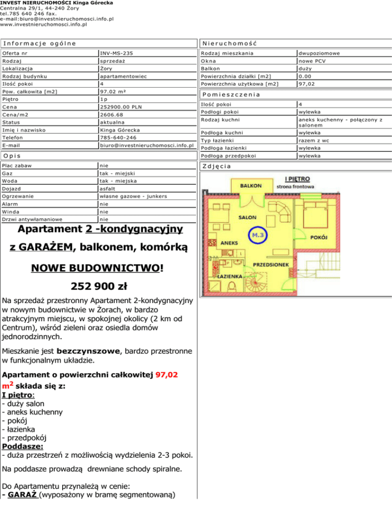 INVEST NIERUCHOMOŚCI Kinga Górecka Centralna 29/1, 44-240 Żory tel.785 640 246 fax. e-mail:[email protected] www.investnieruchomosci.info.pl Informacje ogólne Nieruchomość Oferta nr INV-MS-235 Rodzaj mieszkania dwupoziomowe Rodzaj sprzedaż Okna nowe PCV Lokalizacja Żory Balkon duży Rodzaj budynku apartamentowiec Powierzchnia działki [m2] 0.00 Ilość pokoi 4 Powierzchnia użytkowa [m2] 97,02 Pow. całkowita [m2] 97.02 m² Piętro 1p Cena 252900.00 PLN Cena/m2 2606.68 Status aktualna Imię i nazwisko Kinga Górecka Telefon 785-640-246 E-mail [email protected] Opis Plac zabaw nie Gaz tak - miejski Woda tak - miejska Dojazd asfalt Ogrzewanie własne gazowe - junkers Alarm nie Winda nie Drzwi antywłamaniowe nie Apartament 2 -kondygnacyjny z GARAŻEM, balkonem, komórką NOWE BUDOWNICTWO! 252 900 zł Na sprzedaż przestronny Apartament 2-kondygnacyjny w nowym budownictwie w Żorach, w bardzo atrakcyjnym miejscu, w spokojnej okolicy (2 km od Centrum), wśród zieleni oraz osiedla domów jednorodzinnych. Mieszkanie jest bezczynszowe, bardzo przestronne w funkcjonalnym układzie. Apartament o powierzchni całkowitej 97,02 m2 składa się z: I piętro: - duży salon - aneks kuchenny - pokój - łazienka - przedpokój Poddasze: - duża przestrzeń z możliwością wydzielenia 2-3 pokoi. Na poddasze prowadzą drewniane schody spiralne. Do Apartamentu przynależą w cenie: - GARAŻ (wyposażony w bramę segmentowaną) Pomieszczenia Ilość pokoi 4 Podłogi pokoi wylewka Rodzaj kuchni aneks kuchenny - połączony z salonem Podłoga kuchni wylewka Typ łazienki razem z wc Podłoga łazienki wylewka Podłoga przedpokoi wylewka Zdjęcia - komórka lokatorska - balkon (podłoga w płytkach ceramicznych) - drzwi wejściowe do mieszkań antywłamaniowe z podwójnym zamkiem Teren całkowicie ogrodzony. Ogrzewanie ekonomiczne - na piec 2-funkcyjny gazowy. W bliskiej odległości znajdują się obiekty handlowe, szkoła, przedszkole, przystanki dla darmowej linii MPK. Serdecznie zapraszam na bezpłatną prezentację oferty, kontakt - Kinga Górecka, tel: 785-640-246 INVEST NIERUCHOMOŚCI 44-240 Żory, ul. Centralna 29/1 (za Sądem) e-mail: [email protected] LICENCJA nr 21998 więcej podobnych ofert: http://www.investnieruchomosci.info.pl © Wszelkie prawa zastrzeżone - INVEST NIERUCHOMOŚCI