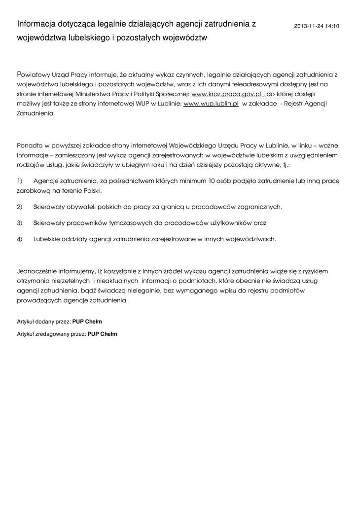 Informacja dotycząca legalnie działających agencji zatrudnienia z 2013-11-24 14:10 województwa lubelskiego i pozostałych województw Powiatowy Urząd Pracy informuje, że aktualny wykaz czynnych, legalnie działających agencji zatrudnienia z województwa lubelskiego i pozostałych województw, wraz z ich danymi teleadresowymi dostępny jest na stronie internetowej Ministerstwa Pracy i Polityki Społecznej: www.kraz.praca.gov.pl , do której dostęp możliwy jest także ze strony internetowej WUP w Lublinie: www.wup.lublin.pl w zakładce - Rejestr Agencji Zatrudnienia. Ponadto w powyższej zakładce strony internetowej Wojewódzkiego Urzędu Pracy w Lublinie, w linku – ważne informacje – zamieszczony jest wykaz agencji zarejestrowanych w województwie lubelskim z uwzględnieniem rodzajów usług, jakie świadczyły w ubiegłym roku i na dzień dzisiejszy pozostają aktywne, tj.: 1) Agencje zatrudnienia, za pośrednictwem których minimum 10 osób podjęło zatrudnienie lub inną pracę zarobkową na terenie Polski, 2) Skierowały obywateli polskich do pracy za granicą u pracodawców zagranicznych, 3) Skierowały pracowników tymczasowych do pracodawców użytkowników oraz 4) Lubelskie oddziały agencji zatrudnienia zarejestrowane w innych województwach. Jednocześnie informujemy, iż korzystanie z innych źródeł wykazu agencji zatrudnienia wiąże się z ryzykiem otrzymania nierzetelnych i nieaktualnych informacji o podmiotach, które obecnie nie świadczą usług agencji zatrudnienia, bądź świadczą nielegalnie, bez wymaganego wpisu do rejestru podmiotów prowadzących agencje zatrudnienia. Artykuł dodany przez: PUP Chełm Artykuł zredagowany przez: PUP Chełm