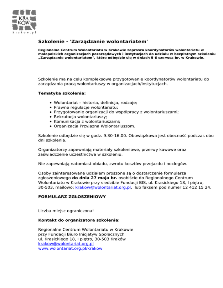 Szkolenie - 'Zarządzanie wolontariatem' Regionalne Centrum Wolontariatu w Krakowie zaprasza koordynatorów wolontariatu w małopolskich organizacjach pozarządowych i instytucjach do udziału w bezpłatnym szkoleniu „Zarządzanie wolontariatem", które odbędzie się w dniach 5-6 czerwca br. w Krakowie. Szkolenie ma na celu kompleksowe przygotowanie koordynatorów wolontariatu do zarządzania pracą wolontariuszy w organizacjach/instytucjach. Tematyka szkolenia: Wolontariat – historia, definicja, rodzaje; Prawne regulacje wolontariatu; Przygotowanie organizacji do współpracy z wolontariuszami; Rekrutacja wolontariuszy; Komunikacja z wolontariuszami; Organizacja Przyjazna Wolontariuszom. Szkolenie odbędzie się w godz. 9.30-16.00. Obowiązkowa jest obecność podczas obu dni szkolenia. Organizatorzy zapewniają materiały szkoleniowe, przerwy kawowe oraz zaświadczenie uczestnictwa w szkoleniu. Nie zapewniają natomiast obiadu, zwrotu kosztów przejazdu i noclegów. Osoby zainteresowane udziałem proszone są o dostarczenie formularza zgłoszeniowego do dnia 27 maja br. osobiście do Regionalnego Centrum Wolontariatu w Krakowie przy siedzibie Fundacji BIS, ul. Krasickiego 18, I piętro, 30-503, mailowo: [email protected], lub faksem pod numer 12 412 15 24. FORMULARZ ZGŁOSZENIOWY Liczba miejsc ograniczona! Kontakt do organizatora szkolenia: Regionalne Centrum Wolontariatu w Krakowie przy Fundacji Biuro Inicjatyw Społecznych ul. Krasickiego 18, I piętro, 30-503 Kraków [email protected] www.wolontariat.org.pl/krakow Powered by TCPDF (www.tcpdf.org)