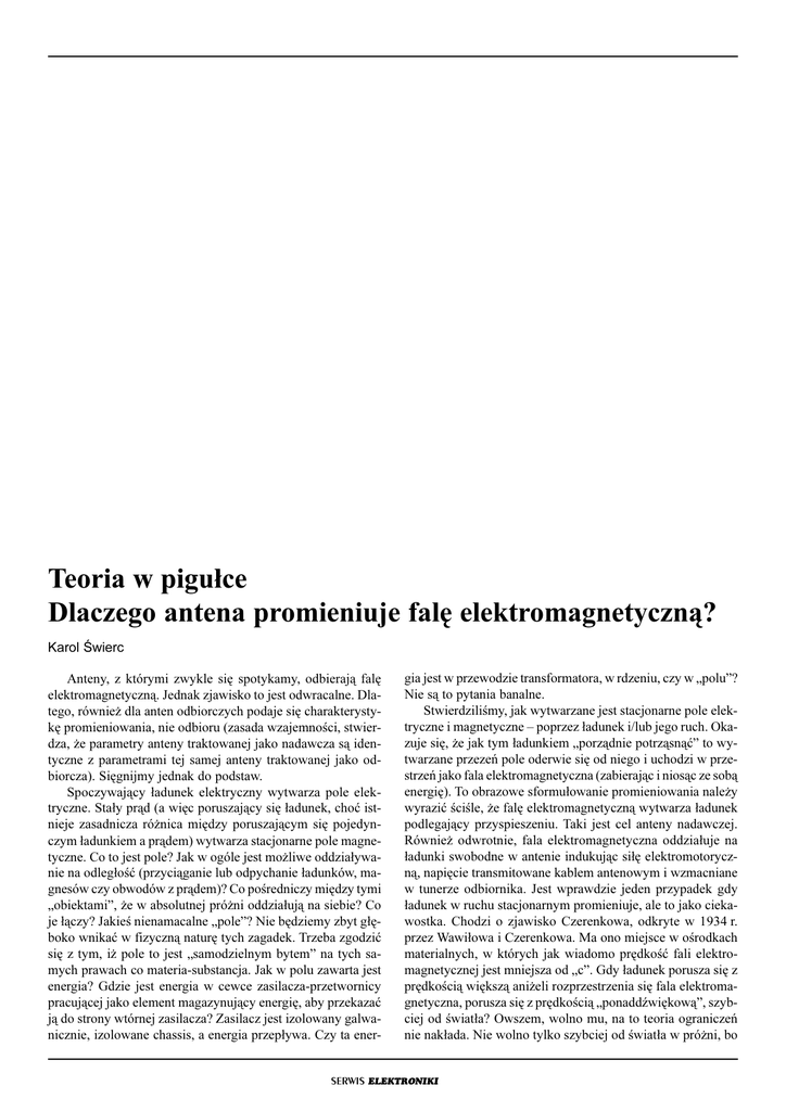 Teoria w pigu³ce Dlaczego antena promieniuje falê elektromagnetyczn¹? Karol Œwierc Anteny, z którymi zwykle siê spotykamy, odbieraj¹ falê elektromagnetyczn¹. Jednak zjawisko to jest odwracalne. Dlatego, równie¿ dla anten odbiorczych podaje siê charakterystykê promieniowania, nie odbioru (zasada wzajemnoœci, stwierdza, ¿e parametry anteny traktowanej jako nadawcza s¹ identyczne z parametrami tej samej anteny traktowanej jako odbiorcza). Siêgnijmy jednak do podstaw. Spoczywaj¹cy ³adunek elektryczny wytwarza pole elektryczne. Sta³y pr¹d (a wiêc poruszaj¹cy siê ³adunek, choæ istnieje zasadnicza ró¿nica miêdzy poruszaj¹cym siê pojedynczym ³adunkiem a pr¹dem) wytwarza stacjonarne pole magnetyczne. Co to jest pole? Jak w ogóle jest mo¿liwe oddzia³ywanie na odleg³oœæ (przyci¹ganie lub odpychanie ³adunków, magnesów czy obwodów z pr¹dem)? Co poœredniczy miêdzy tymi „obiektami”, ¿e w absolutnej pró¿ni oddzia³uj¹ na siebie? Co je ³¹czy? Jakieœ nienamacalne „pole”? Nie bêdziemy zbyt g³êboko wnikaæ w fizyczn¹ naturê tych zagadek. Trzeba zgodziæ siê z tym, i¿ pole to jest „samodzielnym bytem” na tych samych prawach co materia-substancja. Jak w polu zawarta jest energia? Gdzie jest energia w cewce zasilacza-przetwornicy pracuj¹cej jako element magazynuj¹cy energiê, aby przekazaæ j¹ do strony wtórnej zasilacza? Zasilacz jest izolowany galwanicznie, izolowane chassis, a energia przep³ywa. Czy ta ener- gia jest w przewodzie transformatora, w rdzeniu, czy w „polu”? Nie s¹ to pytania banalne. Stwierdziliœmy, jak wytwarzane jest stacjonarne pole elektryczne i magnetyczne – poprzez ³adunek i/lub jego ruch. Okazuje siê, ¿e jak tym ³adunkiem „porz¹dnie potrz¹sn¹æ” to wytwarzane przezeñ pole oderwie siê od niego i uchodzi w przestrzeñ jako fala elektromagnetyczna (zabieraj¹c i nios¹c ze sob¹ energiê). To obrazowe sformu³owanie promieniowania nale¿y wyraziæ œciœle, ¿e falê elektromagnetyczn¹ wytwarza ³adunek podlegaj¹cy przyspieszeniu. Taki jest cel anteny nadawczej. Równie¿ odwrotnie, fala elektromagnetyczna oddzia³uje na ³adunki swobodne w antenie indukuj¹c si³ê elektromotoryczn¹, napiêcie transmitowane kablem antenowym i wzmacniane w tunerze odbiornika. Jest wprawdzie jeden przypadek gdy ³adunek w ruchu stacjonarnym promieniuje, ale to jako ciekawostka. Chodzi o zjawisko Czerenkowa, odkryte w 1934 r. przez Wawi³owa i Czerenkowa. Ma ono miejsce w oœrodkach materialnych, w których jak wiadomo prêdkoœæ fali elektromagnetycznej jest mniejsza od „c”. Gdy ³adunek porusza siê z prêdkoœci¹ wiêksz¹ ani¿eli rozprzestrzenia siê fala elektromagnetyczna, porusza siê z prêdkoœci¹ „ponaddŸwiêkow¹”, szybciej od œwiat³a? Owszem, wolno mu, na to teoria ograniczeñ nie nak³ada. Nie wolno tylko szybciej od œwiat³a w pró¿ni, bo SERWIS ELEKTRONIKI Dlaczego antena promieniuje falê elektromagnetyczn¹? „c”, to nie tylko prêdkoœæ œwiat³a, to bardzo wa¿na sta³a naszej przyrody, a miêdzy innymi jedn¹ z jej szczególnych cech jest prêdkoœæ fali elektromagnetycznej w pró¿ni! A wiêc, mimo ¿e jest to ruch jednostajny, obserwuje siê promieniowanie. Dodajmy równie¿ jako ciekawostkê, i¿ „normalne” promieniowanie dipola jest proporcjonalne do drugiej potêgi momentu dipolowego i a¿ do czwartej potêgi czêstotliwoœci. Dlatego te¿ moc tracona w formie promieniowania przesy³owych linii energetycznych jest znikoma. Jednak, wróæmy do tematu „przyziemnego” – anteny. Antena jest w gruncie rzeczy elementem zapewniaj¹cym przejœcie od fali prowadzonej w prowadnicy falowej do fali rozchodz¹cej siê w wolnej przestrzeni (lub odwrotnie). Podajmy w tym miejscu ró¿nicê charakterystyk spadku mocy od odleg³oœci, na któr¹ fala jest przesy³ana. W kablu spadek jest jednakowy (w decybelach) na ka¿dy jednakowy jego odcinek, otrzymujemy wiêc funkcjê ekspotencjaln¹ (typu e-x). Moc fali w wolnej przestrzeni spada odwrotnie proporcjonalnie do kwadratu odleg³oœci (~1/x2). Najprostsz¹ antenê otrzymamy rozcinaj¹c i odginaj¹c od siebie koñce kabla antenowego. W³aœnie efekt „przyspieszenia”, niestacjonarnoœci ruchu ³adunków w tym odcinku linii jest Ÿród³em promieniowania anteny. Stwierdzamy zatem, i¿ obecnoœæ fali w antenie i jej „prowadnicy” jest zwi¹zana z obecnoœci¹ ³adunków na powierzchni przewodników. £adunki te s¹ potrzebne do wzbudzenia fali, nie do jej przesy³ania. Poniewa¿ w antenie zachodz¹ zjawiska rezonansowe, jej wymiary geometryczne musz¹ byæ œciœle powi¹zane z d³ugoœci¹ promieniowanej (odbieranej) fali. Powiemy teraz w wielkim skrócie o fali elektromagnetycznej wypromieniowanej (odbieranej) przez „pryzmat” parametrów anten. Charakterystyka promieniowania – Jest to natê¿enie promieniowanej (odbieranej) fali roz³o¿one po sferze, w której œrodku umieszczamy antenê. Pomiaru dokonuje siê w tzw. strefie dalekiej, co oznacza, ¿e wymiary fizyczne anteny s¹ zaniedbywalne. W wielu publikacjach poœwiêconych technice antenowej mo¿na znaleŸæ wykresy charakterystycznych „listków” anteny. Kierunkowoœæ – Okreœla ona, jak silnie antena koncentruje energiê w jednym kierunku (oczywiœcie, kosztem kierunków innych). Zysk energetyczny – To bardzo podobny parametr do kierunkowoœci; uwzglêdnia on dodatkowo sprawnoœæ energetyczn¹ anteny. Wyra¿ony jest on najczêœciej w decybelach, jednak nale¿y zawsze zwróciæ uwagê „wzglêdem czego” (dB to miara wzglêdnej wielkoœci). Najczêœciej bêdzie to wzglêdem anteny izotropowej, nierealizowalnej fizycznie anteny o charakterystyce wykazuj¹cej pe³n¹ symetriê sferyczn¹ (charakterystyka jest powierzchni¹ kuli). Jak wiadomo, aby unikn¹æ niedomówieñ za skrótem decybela czêsto dodaje siê jak¹œ umown¹ literkê. W omawianym przypadku jest to „i” – dBi. Jeœli zysk okreœlany jest wzglêdem najprostszej realizowa