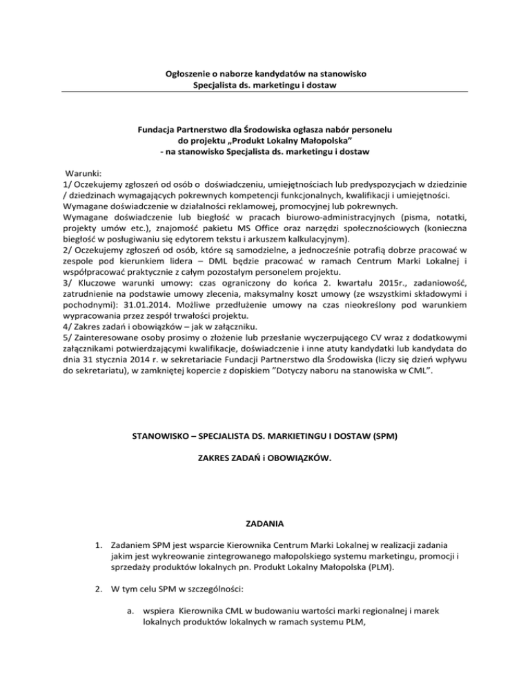 Ogłoszenie o naborze kandydatów na stanowisko Specjalista ds. marketingu i dostaw Fundacja Partnerstwo dla Środowiska ogłasza nabór personelu do projektu „Produkt Lokalny Małopolska” - na stanowisko Specjalista ds. marketingu i dostaw Warunki: 1/ Oczekujemy zgłoszeń od osób o doświadczeniu, umiejętnościach lub predyspozycjach w dziedzinie / dziedzinach wymagających pokrewnych kompetencji funkcjonalnych, kwalifikacji i umiejętności. Wymagane doświadczenie w działalności reklamowej, promocyjnej lub pokrewnych. Wymagane doświadczenie lub biegłość w pracach biurowo-administracyjnych (pisma, notatki, projekty umów etc.), znajomość pakietu MS Office oraz narzędzi społecznościowych (konieczna biegłość w posługiwaniu się edytorem tekstu i arkuszem kalkulacyjnym). 2/ Oczekujemy zgłoszeń od osób, które są samodzielne, a jednocześnie potrafią dobrze pracować w zespole pod kierunkiem lidera – DML będzie pracować w ramach Centrum Marki Lokalnej i współpracować praktycznie z całym pozostałym personelem projektu. 3/ Kluczowe warunki umowy: czas ograniczony do końca 2. kwartału 2015r., zadaniowość, zatrudnienie na podstawie umowy zlecenia, maksymalny koszt umowy (ze wszystkimi składowymi i pochodnymi): 31.01.2014. Możliwe przedłużenie umowy na czas nieokreślony pod warunkiem wypracowania przez zespół trwałości projektu. 4/ Zakres zadań i obowiązków – jak w załączniku. 5/ Zainteresowane osoby prosimy o złożenie lub przesłanie wyczerpującego CV wraz z dodatkowymi załącznikami potwierdzającymi kwalifikacje, doświadczenie i inne atuty kandydatki lub kandydata do dnia 31 stycznia 2014 r. w sekretariacie Fundacji Partnerstwo dla Środowiska (liczy się dzień wpływu do sekretariatu), w zamkniętej kopercie z dopiskiem ”Dotyczy naboru na stanowiska w CML”. STANOWISKO – SPECJALISTA DS. MARKIETINGU I DOSTAW (SPM) ZAKRES ZADAŃ i OBOWIĄZKÓW. ZADANIA 1. Zadaniem SPM jest wsparcie Kierownika Centrum Marki Lokalnej w realizacji zadania jakim jest wykreowanie zintegrowanego małopolskiego systemu marketingu, promocji i sprzedaży produktów lokalnych pn. Produkt Lokalny Małopolska (PLM). 2. W tym celu SPM w szczególności: a. wspiera Kierownika CML w budowaniu wartości marki regionalnej i marek lokalnych produktów lokalnych w ramach systemu PLM, b. w porozumieniu z Kierownikiem CML wspiera Brand Managera Małopolska w kwestiach związanych z zarządzaniem marką w odniesieniu do dostawców i dostaw w systemie PLM, c. wspiera Kierownika CML i innych członków zespołu w kreowaniu nowych inicjatyw i projektów marketingowych służących rozwojowi systemu PLM, d. pod kierunkiem i w uzgodnieniu z Kierownikiem CML odpowiada za przygotowanie i realizację materiałów tożsamościowych, informacyjnych i opakowaniowych marki, przygotowanie i monitorowanie zamówień realizacyjnych, kontrolę jakości realizowanych materiałów, zachowanie ich wysokiej jakości i właściwej relacji kosztów do korzyści, e. pod kierunkiem i w uzgodnieniu z Kierownikiem CML opracuje i wdroży system monitorowania i badania opinii w ramach systemu PLM w odniesieniu do partnerów i współpracowników, konsumentów, dostawców, innych kontrahentów oraz konkurencji. 3. Bezpośrednim przełożonym DML („Brand Manager”) jest Kierownik Centrum Marki Lokalnej („Local Product Model Implementation Manager’), przed którym SPM odpowiada za powierzone mu do realizacji zadania, projekty i wszelkie inne działania powierzone do realizacji. 4. SPM organizuje swoją pracę zgodnie z dobrą praktyką zarządzania projektami metodyczna i uporządkowana praca, umiejętność stworzenia odpowiedniego środowiska pracy, efektywne i zgodne m.in. z procedurami i regulaminami wykorzystywanie zasobów i środków, terminowość i zgodność z budżetem, zgodne z ramami projektu monitorowanie i raportowanie. 5. Od osoby zatrudnionej lub świadczącej usługi na stanowisku DML oczekuje się zaangażowania w pracy następujących zasobów osobistych, w ponadstandardowym wymiarze: • • • • • • • • energiczność w realizacji powierzonych zadań, podejmowaniu nowych wyzwań i współtworzeniu nowych jakości, silne poczucie pracy zespołowej i motywacja na osiągnięcie zespołowych sukcesów, poczucie odpowiedzialności za współrealizowane zadania i ich efekty, zarówno w sensie operacyjnym jak i szerszym kontekście całego projektu i dobra Fundacji, umiejętność samodzielnego wykonywania wyznaczonych zadań, otwarcie na zmiany, elastyczność i łatwość dostosowania się do szybko zmieniających się okoliczności, dyspozycyjność – w uzgodnionym zakresie, pomocniczność, nastawienie na współpracę i budowanie partnerskich relacji ze współpracownikami, umiejętność pozytywnego komunikowania się i współpracy z osobami o różnym poziomie wykształcenia, kompetencji kulturowych, na różnych szczeblach zarządzania i pozycjach zawodowych, wrażliwość w stosunkach międzyludzkich i chęć do pomocy innym. OBOWIĄZKI 6. Osoba zatrudniona lub świadcząca usługi na stanowisku jest zobowiązana: a. znać, propagować i stosować standardy obowiązujące w Fundacji Partnerstwo dla Środowiska, b. na bieżąco monitorować stopień i jakość realizacji powierzonych zadań, c. stosować w swojej pracy wszystkie odpowiednie zarządzenia w zakresie: godzin i dyscypliny pracy pracowników i niestałego personelu projektu, efektywnego czasu i sposobu pracy pracowników, a także przepisy wynikające z regulaminów, procedur, pełnomocnictw, przepisów i zasad obowiązujących w FPDS, d. stale aktualizować i pogłębiać wiedzę związaną z działaniami FPDS i produktami, doskonalić umiejętności posługiwania się używanymi w FPDS narzędziami, e. zgłaszać potrzeby szkoleniowe, f. operacyjnie wykorzystywać wiedzę zdobytą na szkoleniach, g. dbać o racjonalność ponoszonych kosztów, h. działać zgodnie z obowiązującymi proce