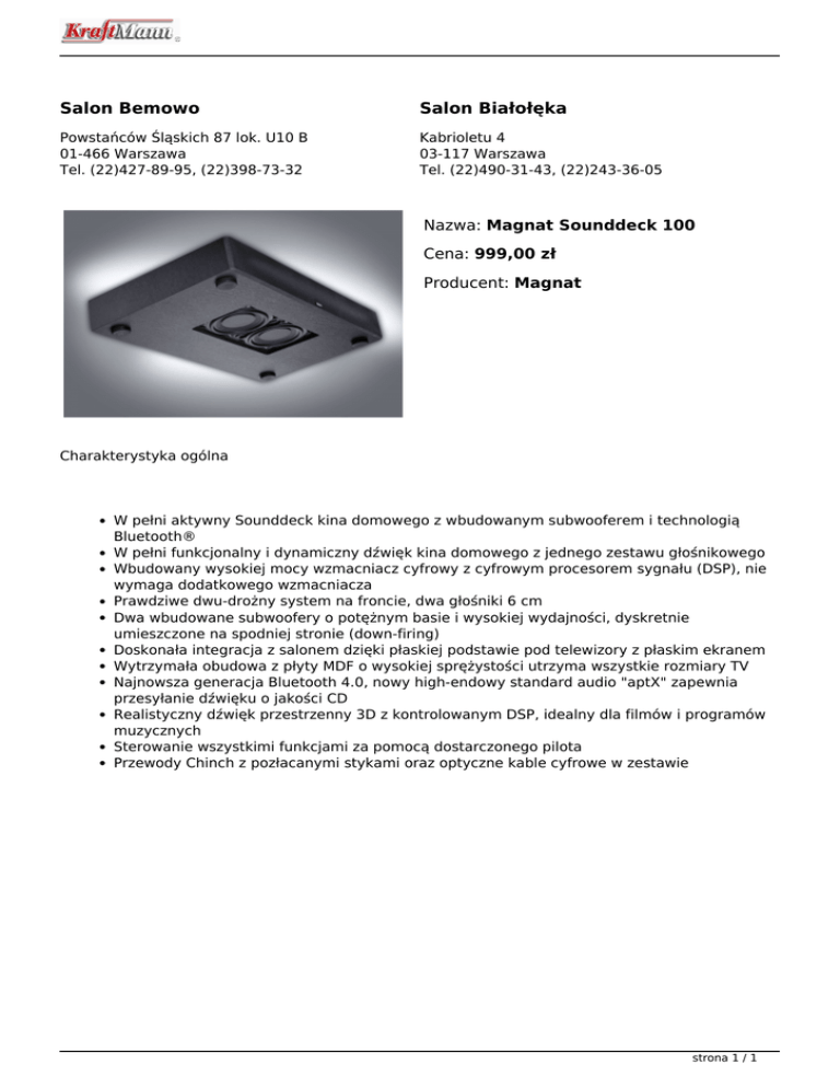 Salon Bemowo Salon Białołęka Powstańców Śląskich 87 lok. U10 B 01-466 Warszawa Tel. (22)427-89-95, (22)398-73-32 Kabrioletu 4 03-117 Warszawa Tel. (22)490-31-43, (22)243-36-05 Nazwa: Magnat Sounddeck 100 Cena: 999,00 zł Producent: Magnat Charakterystyka ogólna W pełni aktywny Sounddeck kina domowego z wbudowanym subwooferem i technologią Bluetooth® W pełni funkcjonalny i dynamiczny dźwięk kina domowego z jednego zestawu głośnikowego Wbudowany wysokiej mocy wzmacniacz cyfrowy z cyfrowym procesorem sygnału (DSP), nie wymaga dodatkowego wzmacniacza Prawdziwe dwu-drożny system na froncie, dwa głośniki 6 cm Dwa wbudowane subwoofery o potężnym basie i wysokiej wydajności, dyskretnie umieszczone na spodniej stronie (down-firing) Doskonała integracja z salonem dzięki płaskiej podstawie pod telewizory z płaskim ekranem Wytrzymała obudowa z płyty MDF o wysokiej sprężystości utrzyma wszystkie rozmiary TV Najnowsza generacja Bluetooth 4.0, nowy high-endowy standard audio "aptX" zapewnia przesyłanie dźwięku o jakości CD Realistyczny dźwięk przestrzenny 3D z kontrolowanym DSP, idealny dla filmów i programów muzycznych Sterowanie wszystkimi funkcjami za pomocą dostarczonego pilota Przewody Chinch z pozłacanymi stykami oraz optyczne kable cyfrowe w zestawie strona 1 / 1 Powered by TCPDF (www.tcpdf.org)