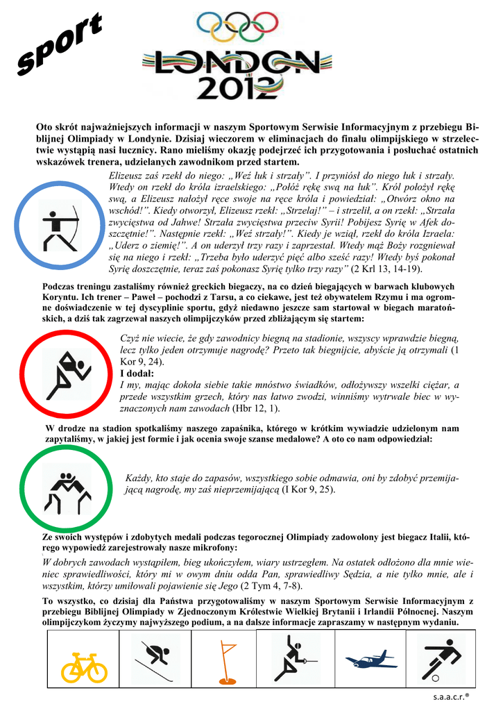Oto skrót najważniejszych informacji w naszym Sportowym Serwisie Informacyjnym z przebiegu Biblijnej Olimpiady w Londynie. Dzisiaj wieczorem w eliminacjach do finału olimpijskiego w strzelectwie wystąpią nasi łucznicy. Rano mieliśmy okazję podejrzeć ich przygotowania i posłuchać ostatnich wskazówek trenera, udzielanych zawodnikom przed startem. Elizeusz zaś rzekł do niego: „Weź łuk i strzały”. I przyniósł do niego łuk i strzały. Wtedy on rzekł do króla izraelskiego: „Połóż rękę swą na łuk”. Król położył rękę swą, a Elizeusz nałożył ręce swoje na ręce króla i powiedział: „Otwórz okno na wschód!”. Kiedy otworzył, Elizeusz rzekł: „Strzelaj!” – i strzelił, a on rzekł: „Strzała zwycięstwa od Jahwe! Strzała zwycięstwa przeciw Syrii! Pobijesz Syrię w Afek doszczętnie!”. Następnie rzekł: „Weź strzały!”. Kiedy je wziął, rzekł do króla Izraela: „Uderz o ziemię!”. A on uderzył trzy razy i zaprzestał. Wtedy mąż Boży rozgniewał się na niego i rzekł: „Trzeba było uderzyć pięć albo sześć razy! Wtedy byś pokonał Syrię doszczętnie, teraz zaś pokonasz Syrię tylko trzy razy” (2 Krl 13, 14-19). Podczas treningu zastaliśmy również greckich biegaczy, na co dzień biegających w barwach klubowych Koryntu. Ich trener – Paweł – pochodzi z Tarsu, a co ciekawe, jest też obywatelem Rzymu i ma ogromne doświadczenie w tej dyscyplinie sportu, gdyż niedawno jeszcze sam startował w biegach maratońskich, a dziś tak zagrzewał naszych olimpijczyków przed zbliżającym się startem: Czyż nie wiecie, że gdy zawodnicy biegną na stadionie, wszyscy wprawdzie biegną, lecz tylko jeden otrzymuje nagrodę? Przeto tak biegnijcie, abyście ją otrzymali (1 Kor 9, 24). I dodał: I my, mając dokoła siebie takie mnóstwo świadków, odłożywszy wszelki ciężar, a przede wszystkim grzech, który nas łatwo zwodzi, winniśmy wytrwale biec w wyznaczonych nam zawodach (Hbr 12, 1). W drodze na stadion spotkaliśmy naszego zapaśnika, którego w krótkim wywiadzie udzielonym nam zapytaliśmy, w jakiej jest formie i jak ocenia swoje szanse medalowe? A oto co nam odpowiedział: Każdy, kto staje do zapasów, wszystkiego sobie odmawia, oni by zdobyć przemijającą nagrodę, my zaś nieprzemijającą (I Kor 9, 25). Ze swoich występów i zdobytych medali podczas tegorocznej Olimpiady zadowolony jest biegacz Italii, którego wypowiedź zarejestrowały nasze mikrofony: \ W dobrych zawodach wystąpiłem, bieg ukończyłem, wiary ustrzegłem. Na ostatek odłożono dla mnie wieniec sprawiedliwości, który mi w owym dniu odda Pan, sprawiedliwy Sędzia, a nie tylko mnie, ale i wszystkim, którzy umiłowali pojawienie się Jego (2 Tym 4, 7-8). To wszystko, co dzisiaj dla Państwa przygotowaliśmy w naszym Sportowym Serwisie Informacyjnym z przebiegu Biblijnej Olimpiady w Zjednoczonym Królestwie Wielkiej Brytanii i Irlandii Północnej. Naszym olimpijczykom życzymy najwyższego podium, a na dalsze informacje zapraszamy w następnym wydaniu. s.a.a.c.r.®