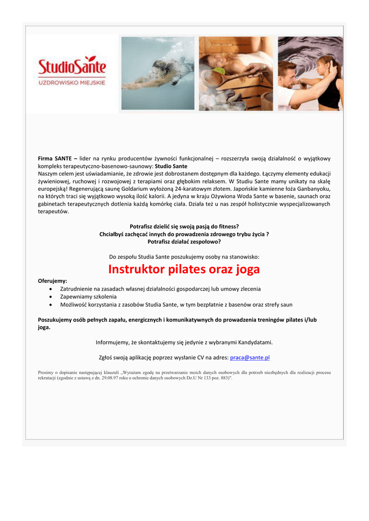 Firma SANTE – lider na rynku producentów żywności funkcjonalnej – rozszerzyła swoją działalność o wyjątkowy kompleks terapeutyczno-basenowo-saunowy: Studio Sante Naszym celem jest uświadamianie, że zdrowie jest dobrostanem dostępnym dla każdego. Łączymy elementy edukacji żywieniowej, ruchowej i rozwojowej z terapiami oraz głębokim relaksem. W Studiu Sante mamy unikaty na skalę europejską! Regenerującą saunę Goldarium wyłożoną 24-karatowym złotem. Japońskie kamienne łoża Ganbanyoku, na których traci się wyjątkowo wysoką ilość kalorii. A jedyna w kraju Ożywiona Woda Sante w basenie, saunach oraz gabinetach terapeutycznych dotlenia każdą komórkę ciała. Działa też u nas zespół holistycznie wyspecjalizowanych terapeutów. Potrafisz dzielić się swoją pasją do fitness? Chciałbyś zachęcać innych do prowadzenia zdrowego trybu życia ? Potrafisz działać zespołowo? Do zespołu Studia Sante poszukujemy osoby na stanowisko: Instruktor pilates oraz joga Oferujemy: Zatrudnienie na zasadach własnej działalności gospodarczej lub umowy zlecenia Zapewniamy szkolenia Możliwość korzystania z zasobów Studia Sante, w tym bezpłatnie z basenów oraz strefy saun Poszukujemy osób pełnych zapału, energicznych i komunikatywnych do prowadzenia treningów pilates i/lub joga. Informujemy, że skontaktujemy się jedynie z wybranymi Kandydatami. Zgłoś swoją aplikację poprzez wysłanie CV na adres: [email protected] Prosimy o dopisanie następującej klauzuli „Wyrażam zgodę na przetwarzanie moich danych osobowych dla potrzeb niezbędnych dla realizacji procesu rekrutacji (zgodnie z ustawą z dn. 29.08.97 roku o ochronie danych osobowych Dz.U Nr 133 poz. 883)".