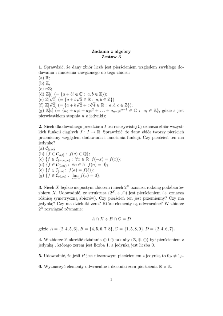 1. Sprawdzić, że dany zbiór liczb jest pierścieniem względem zwykłego dodawania i mnożenia zawężonego do tego zbioru: