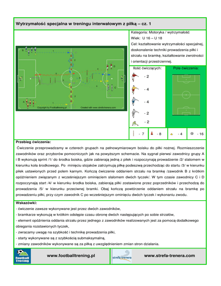 Wytrzymałość specjalna w treningu interwałowym z piłką – cz. 1 Kategoria: Motoryka / wytrzymałość Wiek: U 16 – U 18 Cel: kształtowanie wytrzymałości specjalnej, doskonalenie techniki prowadzenia piłki i strzału na bramkę, kształtowanie zwrotności i orientacji przestrzennej. Ilość ćwiczących: Pole ćwiczenia: -2 -4 -4 -2 -2 - 7 -8 -4 - 16 Przebieg ćwiczenia: Ćwiczenie przeprowadzamy w czterech grupach na pełnowymiarowym boisku do piłki nożnej. Rozmieszczenie zawodników oraz przyborów pomocniczych jak na powyższym schemacie. Na sygnał pierwsi zawodnicy grupy A i B wykonują sprint /1/ do środka boiska, gdzie zabierają jedną z piłek i rozpoczynają prowadzenie /2/ slalomem w kierunku koła środkowego. Po minięciu stojaków zatrzymują piłkę podeszwą przechodząc do startu /3/ w kierunku piłek ustawionych przed polem karnym. Kończą ćwiczenie oddaniem strzału na bramkę /zawodnik B z krótkim opóźnieniem związanym z wcześniejszym ominięciem slalomem dwóch tyczek/. W tym czasie zawodnicy C i D rozpoczynają start /4/ w kierunku środka boiska, zabierają piłki zostawione przez poprzedników i przechodzą do prowadzenia /5/ w kierunku przeciwnej bramki. Obaj kończą powtórzenie oddaniem strzału na bramkę po prowadzeniu piłki, przy czym zawodnik C po wcześniejszym ominięciu dwóch tyczek i wykonaniu zwodu. Wskazówki: - ćwiczenie zawsze wykonywane jest przez dwóch zawodników, - bramkarze wykonują w krótkim odstępie czasu obronę dwóch następujących po sobie strzałów, - element opóźnienia oddania strzału przez jednego z zawodników realizowanych jest za pomocą dodatkowego obiegania rozstawionych tyczek, - zwracamy uwagę na szybkość i technikę prowadzenia piłki, - starty wykonywane są z szybkością submaksymalną, - zmiany zawodników wykonywane są za piłką z uwzględnieniem zmian stron działania. www.footballtrening.pl www.strefa-trenera.com