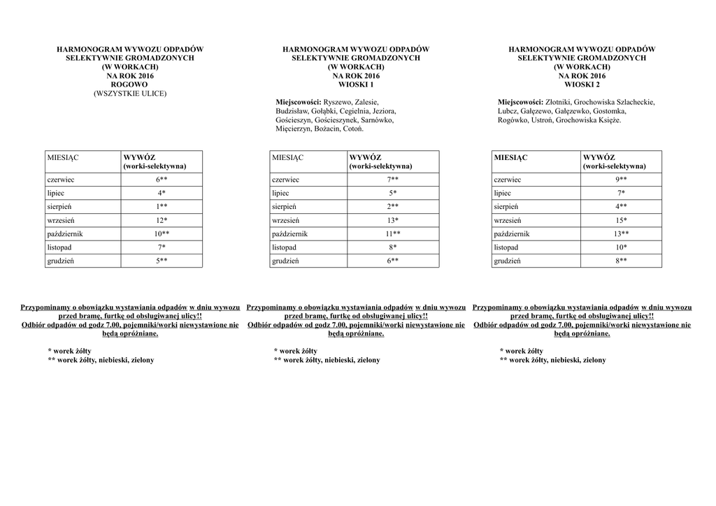 HARMONOGRAM WYWOZU ODPADÓW SELEKTYWNIE GROMADZONYCH (W WORKACH) NA ROK 2016 ROGOWO (WSZYSTKIE ULICE) HARMONOGRAM WYWOZU ODPADÓW SELEKTYWNIE GROMADZONYCH (W WORKACH) NA ROK 2016 WIOSKI 1 Miejscowości: Ryszewo, Zalesie, Budzisław, Gołąbki, Cegielnia, Jeziora, Gościeszyn, Gościeszynek, Sarnówko, Mięcierzyn, Bożacin, Cotoń. MIESIĄC WYWÓZ (worki-selektywna) MIESIĄC WYWÓZ (worki-selektywna) HARMONOGRAM WYWOZU ODPADÓW SELEKTYWNIE GROMADZONYCH (W WORKACH) NA ROK 2016 WIOSKI 2 Miejscowości: Złotniki, Grochowiska Szlacheckie, Lubcz, Gałęzewo, Gałęzewko, Gostomka, Rogówko, Ustroń, Grochowiska Księże. MIESIĄC WYWÓZ (worki-selektywna) czerwiec 6** czerwiec 7** czerwiec 9** lipiec 4* lipiec 5* lipiec 7* sierpień 1** sierpień 2** sierpień 4** wrzesień 12* wrzesień 13* wrzesień 15* październik 10** październik 11** październik 13** listopad 7* listopad 8* listopad 10* grudzień 5** grudzień 6** grudzień 8** Przypominamy o obowiązku wystawiania odpadów w dniu wywozu Przypominamy o obowiązku wystawiania odpadów w dniu wywozu Przypominamy o obowiązku wystawiania odpadów w dniu wywozu przed bramę, furtkę od obsługiwanej ulicy!! przed bramę, furtkę od obsługiwanej ulicy!! przed bramę, furtkę od obsługiwanej ulicy!! Odbiór odpadów od godz 7.00, pojemniki/worki niewystawione nie Odbiór odpadów od godz 7.00, pojemniki/worki niewystawione nie Odbiór odpadów od godz 7.00, pojemniki/worki niewystawione nie będą opróżniane. będą opróżniane. będą opróżniane. * worek żółty ** worek żółty, niebieski, zielony * worek żółty ** worek żółty, niebieski, zielony * worek żółty ** worek żółty, niebieski, zielony HARMONOGRAM WYWOZU ODPADÓW SELEKTYWNIE GROMADZONYCH (W WORKACH) NA ROK 2016 WIOSKI 3 Miejscowości: Czewujewo, Wola, Izdebno, Wiewiórczyn, Szkółki, Skórki, Niedźwiady, Recz, Rzym, Łaziska. MIESIĄC WYWÓZ (worki-selektywna) czerwiec 10** lipiec 8* sierpień 5** wrzesień 16* październik 14** listopad 14* grudzień 9** Przypominamy o obowiązku wystawiania odpadów w dniu wywozu przed bramę, furtkę od obsługiwanej ulicy!! Odbiór odpadów od godz 7.00, pojemniki/worki niewystawione nie będą opróżniane. * worek żółty ** worek żółty, niebieski, zielony