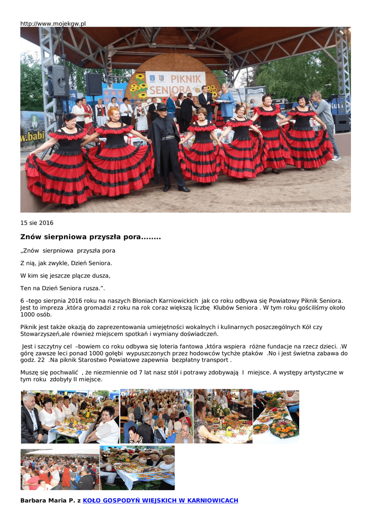 http://www.mojekgw.pl 15 sie 2016 Znów sierpniowa przyszła pora........ „Znów sierpniowa przyszła pora Z nią, jak zwykle, Dzień Seniora. W kim się jeszcze plącze dusza, Ten na Dzień Seniora rusza.”. 6 –tego sierpnia 2016 roku na naszych Błoniach Karniowickich jak co roku odbywa się Powiatowy Piknik Seniora. Jest to impreza ,która gromadzi z roku na rok coraz większą liczbę Klubów Seniora . W tym roku gościliśmy około 1000 osób. Piknik jest także okazją do zaprezentowania umiejętności wokalnych i kulinarnych poszczególnych Kół czy Stowarzyszeń,ale również miejscem spotkań i wymiany doświadczeń. Jest i szczytny cel –bowiem co roku odbywa się loteria fantowa ,która wspiera różne fundacje na rzecz dzieci. .W górę zawsze leci ponad 1000 gołębi wypuszczonych przez hodowców tychże ptaków .No i jest świetna zabawa do godz. 22 .Na piknik Starostwo Powiatowe zapewnia bezpłatny transport . Muszę się pochwalić , że niezmiennie od 7 lat nasz stół i potrawy zdobywają I miejsce. A występy artystyczne w tym roku zdobyły II miejsce. Barbara Maria P. z KOŁO GOSPODYŃ WIEJSKICH W KARNIOWICACH