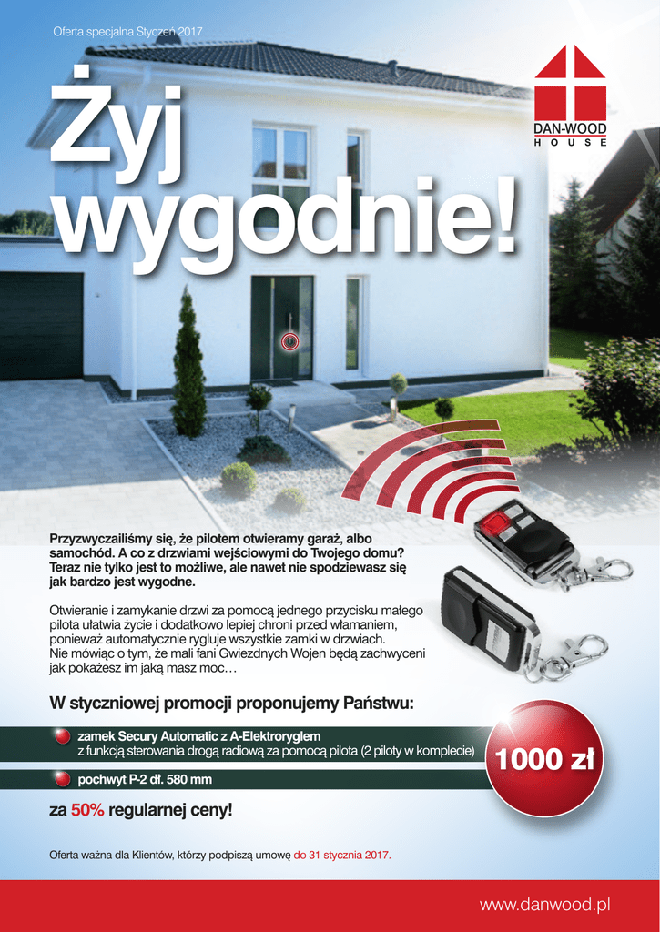 Oferta specjalna Styczeń 2017 Żyj wygodnie! Przyzwyczailiśmy się, że pilotem otwieramy garaż, albo samochód. A co z drzwiami wejściowymi do Twojego domu? Teraz nie tylko jest to możliwe, ale nawet nie spodziewasz się jak bardzo jest wygodne. Otwieranie i zamykanie drzwi za pomocą jednego przycisku małego pilota ułatwia życie i dodatkowo lepiej chroni przed włamaniem, ponieważ automatycznie rygluje wszystkie zamki w drzwiach. Nie mówiąc o tym, że mali fani Gwiezdnych Wojen będą zachwyceni jak pokażesz im jaką masz moc… W styczniowej promocji proponujemy Państwu: zamek Secury Automatic z A-Elektroryglem z funkcją sterowania drogą radiową za pomocą pilota (2 piloty w komplecie) pochwyt P-2 dł. 580 mm 1000 zł za 50% regularnej ceny! Oferta ważna dla Klientów, którzy podpiszą umowę do 31 stycznia 2017. www.danwood.pl
