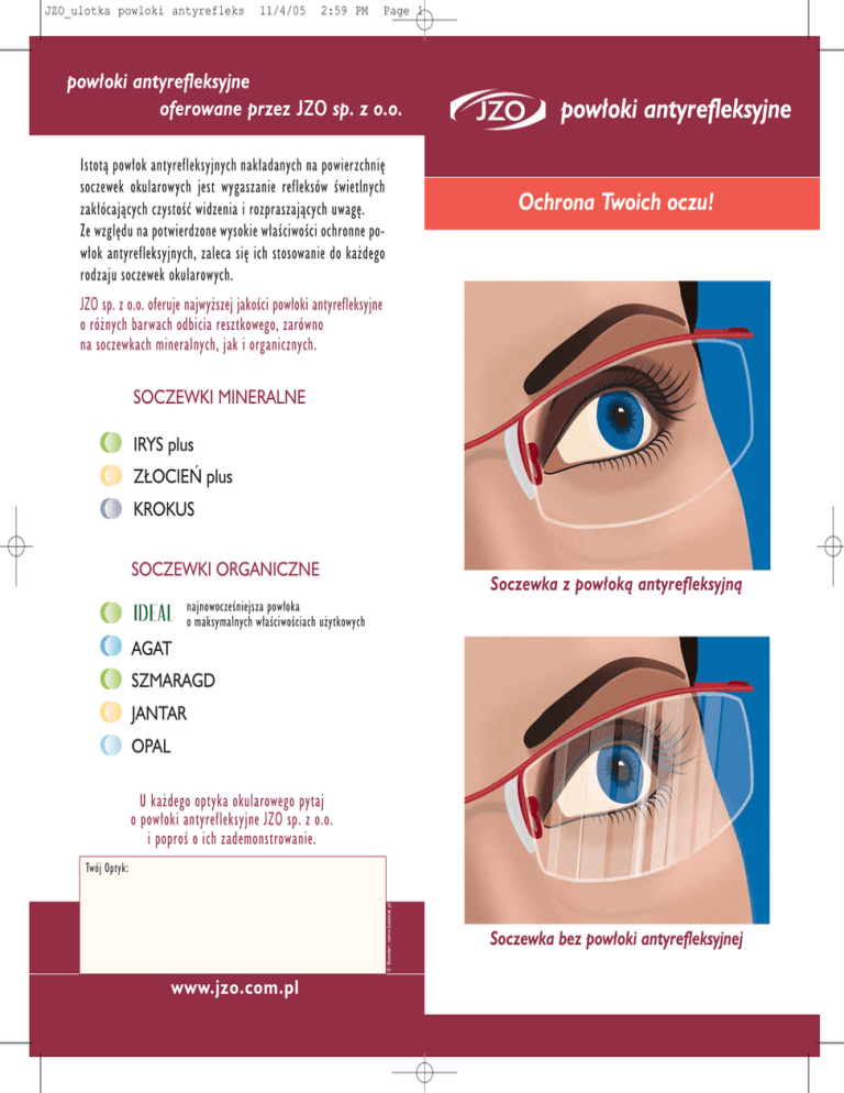 JZO_ulotka powloki antyrefleks 11/4/05 2:59 PM Page 1 pow∏oki antyrefleksyjne oferowane przez JZO sp. z o.o. Istotà pow∏ok antyrefleksyjnych nak∏adanych na powierzchni´ soczewek okularowych jest wygaszanie refleksów Êwietlnych zak∏ócajàcych czystoÊç widzenia i rozpraszajàcych uwag´. Ze wzgl´du na potwierdzone wysokie w∏aÊciwoÊci ochronne pow∏ok antyrefleksyjnych, zaleca si´ ich stosowanie do ka˝dego rodzaju soczewek okularowych. pow∏oki antyrefleksyjne Ochrona Twoich oczu! JZO sp. z o.o. oferuje najwy˝szej jakoÊci pow∏oki antyrefleksyjne o ró˝nych barwach odbicia resztkowego, zarówno na soczewkach mineralnych, jak i organicznych. SOCZEWKI MINERALNE IRYS plus Z¸OCIE¡ plus KROKUS SOCZEWKI ORGANICZNE IDEAL Soczewka z pow∏okà antyrefleksyjnà najnowoczeÊniejsza pow∏oka o maksymalnych w∏aÊciwoÊciach u˝ytkowych AGAT SZMARAGD JANTAR OPAL U ka˝dego optyka okularowego pytaj o pow∏oki antyrefleksyjne JZO sp. z o.o. i poproÊ o ich zademonstrowanie. © Booster, www.booster.pl Twój Optyk: www.jzo.com.pl Soczewka bez pow∏oki antyrefleksyjnej JZO_ulotka powloki antyrefleks 11/4/05 2:59 PM Page 2 Pow∏oki antyrefleksyjne – dla ka˝dego i w ró˝nych sytuacjach! ¸ATWOÂå KOMFORT U˚YTKOWANIA PRACY I WYPOCZYNKU • zmniejszajà uczucie zm´czenia • chronià przed szkodliwym promieniowaniem UV bez pow∏oki z pow∏okà POMOC W NAUCE bez pow∏oki • u∏atwiajà czytanie i pisanie • chronià przed zm´czeniem z pow∏okà bez pow∏oki BEZPIECZNE PROWADZENIE SAMOCHODU • zwi´kszajà kontrast widzenia, zw∏aszcza podczas jazdy nocà lub w deszczu PRZEJRZYSTOÂå komfort widzenia ODPORNOÂå NA ZARYSOWANIA d∏ugotrwa∏oÊç u˝ytkowania HYDROFOBOWOÂå ochrona przed zaparowaniem z pow∏okà bez pow∏oki z pow∏okà OLEOFOBOWOÂå ∏atwoÊç czyszczenia ATRAKCYJNY WYGLÑD • zapewniajà doskona∏à przejrzystoÊç soczewek • dodajà osobistego uroku bez pow∏oki z pow∏okà ANTYSTATYCZNOÂå skuteczna bariera przeciwko zabrudzeniom