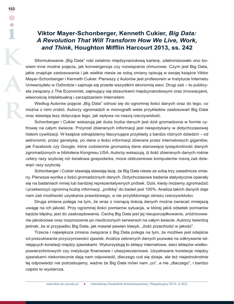153 Viktor Mayer-Schonberger, Kenneth Cukier, Big Data: A Revolution That Will Transform How We Live, Work, and Think, Houghton Mifflin Harcourt 2013, ss. 242 Sformułowanie „Big Data” robi ostatnio międzynarodową karierę, zdetronizowało ono bowiem inne modne pojęcia, jak konwergencja czy rozwiązania chmurowe. Czym jest Big Data, jakie znajduje zastosowania i jak wielkie niesie ze sobą zmiany opisują w swojej książce Viktor Mayer-Schonberger i Kenneth Cukier. Pierwszy z Autorów jest profesorem w Instytucie Internetu Uniwersytetu w Oxfordzie i zajmuje się przede wszystkim ekonomią sieci. Drugi zaś – to publicysta związany z The Economist, zajmujący się stosunkami międzynarodowymi oraz innowacjami, własnością intelektualną i zarządzaniem Internetem. Według Autorów pojęcie „Big Data” odnosi się do ogromnej ilości danych oraz do tego, co można z nimi zrobić. Autorzy zgromadzili w monografii wiele przykładów zastosowań Big Data oraz stawiają tezy dotyczące tego, jak wpływa na naszą rzeczywistość. Schonberger i Cukier wskazują jak duża liczba danych jest dziś gromadzona w formie cyfrowej na całym świecie. Przyrost zbieranych informacji jest niespotykany w dotychczasowej historii cywilizacji. W książce odnajdziemy fascynujące przykłady z bardzo różnych dziedzin – od astronomii, przez genetykę, po dane o ilości informacji zbierane przez internetowych gigantów, jak Facebook czy Google, które codziennie gromadzą dane stanowiące tysiąckrotność danych zgromadzonych w bibliotece Kongresu USA. Autorzy wskazują, iż ilość zbieranych danych rośnie cztery razy szybciej niż światowa gospodarka, moce obliczeniowe komputerów rosną zaś dziewięć razy szybciej. Schonberger i Cukier stawiają stawiają tezę, że Big Data niesie ze sobą trzy zasadnicze zmiany. Pierwsza wynika z ilości gromadzonych danych. Dotychczasowe badania statystyczne opierały się na badaniach mniej lub bardziej reprezentatywnych próbek. Dziś, kiedy możemy zgromadzić i przetworzyć ogromną liczbę informacji, „próbką” do badań jest 100%. Analiza takich danych daje nam zaś możliwość uzyskania prawdziwego, a nie przybliżonego obrazu rzeczywistości. Druga zmiana polega na tym, że wraz z rosnącą ilością danych można zwracać mniejszą uwagę na ich jakość. Przy ogromnej ilości pomiarów sytuacja, w której jakiś odsetek pomiarów będzie błędny, jest do zaakceptowania. Cechą Big Data jest jej nieuporządkowanie, zróżnicowanie jakościowe oraz rozproszenie po niezliczonych serwerach na całym świecie. Autorzy twierdzą jednak, że w przypadku Big Data, jak mawiał pewien klasyk, „ilość przechodzi w jakość”. Trzecia i największa zmiana związana z Big Data polega na tym, że możliwe jest odejście od poszukiwania przyczynowości zjawisk. Analiza zebranych danych pozwala na odkrywanie istniejących korelacji między zjawiskami. Wykorzystują to sklepy internetowe, sieci sklepów wielkopowierzchniowych czy instytucje finansowe i ubezpieczeniowe. Uzyskiwane korelacje między zjawiskami niekoniecznie dają nam odpowiedź, dlaczego coś się dzieje, ale też niejednokrotnie tej odpowiedzi nie potrzebujemy, ważne że Big Data mówi nam „co”, a nie „dlaczego”, i bardzo często to wystarcza. www.ikar.wz.uw.edu.pl internetowy Kwartalnik Antymonopolowy i Regulacyjny 2013, nr 8(2) 154 Wojciech Dziomdziora Viktor Mayer-Schonberger, Kenneth Cukier, Big Data: A Revolution That Will Transform… Autorzy opisują również zjawisko, które nazwali „datafication”, co moglibyśmy przetłumaczyć jako „danymizację”, tj. gromadzenie danych o wszelkich możliwych zjawiskach, nawet takich, jak sposób nacisku ciała na fotel samochodowy, informacje o wibracjach silników czy o nacisku wywieranym na most. Zbierane i analizowane są również dane o relacjach i interakcjach między ludźmi, czego na ogromną skalę dokonują serwisy społecznościowe. Wszelkie gromadzone dane są gromadzone w formatach cyfrowych pozwalających na ich przetwarzanie w rozmaity sposób. Ważność, a tym samym wartość danych rośnie. Ilość zgromadzonych danych, np. o klientach, ich zachowaniach i nawykach, staje się coraz częściej najważniejszym zasobem firm. Powstaje również cały łańcuch wartości, w którym pojawiają się pośrednicy, tj. firmy kupujące dane z wielu pierwotnych źródeł, przetwarzające je i udostępniające dalej w postaci konkretnych produktów, takich jak aplikacje internetowe czy narzędzia analityczne. W ten sposób Big Data staje się podstawą bardzo wielu nowych przedsięwzięć gospodarczych. Big Data to jednak również szereg rodzajów ryzyka, takich jak zagrożenia związane z naruszaniem praw, na czele z prawem do prywatności. Dotychczasowe instytucje i rozwiązania prawne zaczynają zawodzić. Pojawia się wizja orwellowskiego Wielkiego Brata, który widzi i kontroluje wszystko. Autorzy przywołują przykład NSA (U.S. National Security Agency, o której zrobiło się ostatnio bardzo głośno), która codziennie archiwizuje 1.7. miliarda maili i rozmów telefonicznych. Z tymi wyzwaniami trzeba się zmierzyć. Wymagać to będzie, według Autorów, stworzenia zupełnie nowych ram regulacyjnych i gwarancji prawnych, aby zapobiec nadużywaniu wykorzystywania danych zarówno przez przedsiębiorców, jak i rządy. Autorzy snują ciekawe rozważania o tym, jak Big Data wpłynie na pojmowanie wolności, na system sprawiedliwości czy tryb podejmowania decyzji. Recenzowana książka nie jest rozprawą popularnonaukową. Znajdziemy w niej wiele przykładów zastosowania Big Data w działalności gospodarczej czy działaniach rządów. Ale przede wszystkim monografia pozwala ogarnąć nowe zjawiska i zacząć je lepiej rozumieć. Niektóre tezy stawiane przez Autorów są kontrowersyjne, szczególnie zaś trudno zgodzić się z tym, iż analizy Big Data zwalniają nas z obowiązku poszukiwania przyczynow