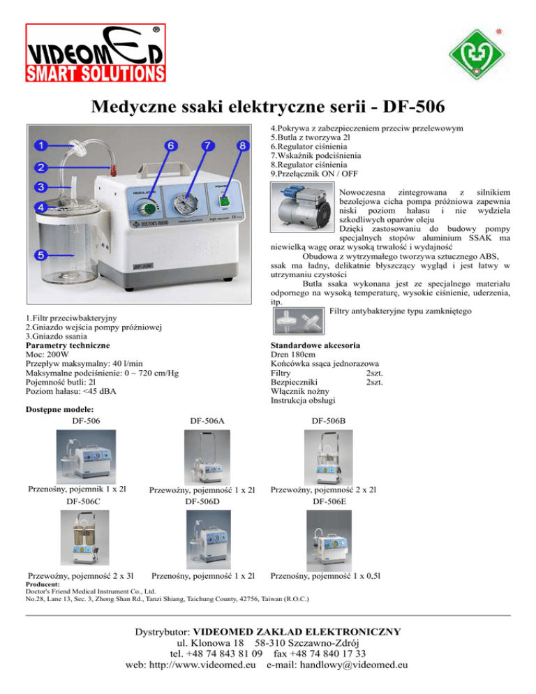 Medyczne ssaki elektryczne serii - DF-506 4.Pokrywa z zabezpieczeniem przeciw przelewowym 5.Butla z tworzywa 2l 6.Regulator ciśnienia 7.Wskaźnik podciśnienia 8.Regulator ciśnienia 9.Przełącznik ON / OFF Nowoczesna zintegrowana z silnikiem bezolejowa cicha pompa próżniowa zapewnia niski poziom hałasu i nie wydziela szkodliwych oparów oleju Dzięki zastosowaniu do budowy pompy specjalnych stopów aluminium SSAK ma niewielką wagę oraz wysoką trwałość i wydajność Obudowa z wytrzymałego tworzywa sztucznego ABS, ssak ma ładny, delikatnie błyszczący wygląd i jest łatwy w utrzymaniu czystości Butla ssaka wykonana jest ze specjalnego materiału odpornego na wysoką temperaturę, wysokie ciśnienie, uderzenia, itp. Filtry antybakteryjne typu zamkniętego 1.Filtr przeciwbakteryjny 2.Gniazdo wejścia pompy próżniowej 3.Gniazdo ssania Parametry techniczne Moc: 200W Przepływ maksymalny: 40 l/min Maksymalne podciśnienie: 0 ~ 720 cm/Hg Pojemność butli: 2l Poziom hałasu: <45 dBA Dostępne modele: DF-506 Standardowe akcesoria Dren 180cm Końcówka ssąca jednorazowa Filtry 2szt. Bezpieczniki 2szt. Włącznik nożny Instrukcja obsługi DF-506A DF-506B Przenośny, pojemnik 1 x 2l DF-506C Przewoźny, pojemność 1 x 2l DF-506D Przewoźny, pojemność 2 x 2l DF-506E Przewoźny, pojemność 2 x 3l Przenośny, pojemność 1 x 2l Przenośny, pojemność 1 x 0,5l Producent: Doctor's Friend Medical Instrument Co., Ltd. No.28, Lane 13, Sec. 3, Zhong Shan Rd., Tanzi Shiang, Taichung County, 42756, Taiwan (R.O.C.) Dystrybutor: VIDEOMED ZAKŁAD ELEKTRONICZNY ul. Klonowa 18 58-310 Szczawno-Zdrój tel. +48 74 843 81 09 fax +48 74 840 17 33 web: http://www.videomed.eu e-mail: [email protected]