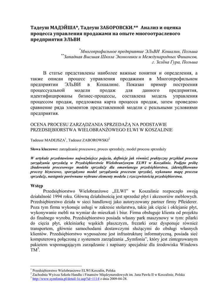 Тадеуш МАДЭЙША*, Тадеуш ЗАБОРОВСКИ.** Анализ и оценка процесса управления продажами на опыте многоотраслевого предприятия ЭЛЬВИ * Многопрофильное предприятие ЭЛьВИ Кошалин, Польша Западная Высшая Школа Экономики и Международных Финансов, г. Зелёна Гура, Польша ** В статье представлены наиболее важные понятия и определения, а также описан процесс управления продажами в Многопрофильном предприятии ЭЛьВИ в Кошалине. Показан пример построения процессуальной модели продаж для данного предприятия, идентифицированы бизнес-процессы, составлена модель управления процессом продаж, предложена карта процесса продаж, затем проведено сравнение ряда элементов представленной модели с реальными условиями предприятия. OCENA PROCESU ZARZĄDZANIA SPRZEDAŻĄ NA PODSTAWIE PRZEDSIĘBIORSTWA WIELOBRANŻOWEGO ELWI W KOSZALINIE Tadeusz MADEJSZA1, Tadeusz ZABOROWSKI2 Słowa kluczowe: zarządzanie procesowe, proces sprzedaży, model procesu sprzedaży W artykule przedstawiono najważniejsze pojęcia, definicje jak również praktyczny przykład procesu zarządzania sprzedażą w Przedsiębiorstwie Wielobranżowym ELWI w Koszalinie. Podjęto próbę zbudowania procesowego modelu sprzedaży dla omawianego przedsiębiorstwa, zidentyfikowano procesy biznesowe, sporządzono model zarządzania procesem sprzedaż, wykonano mapę procesu sprzedaży, następnie porównano wybrane elementy modelu z rzeczywistością przedsiębiorstwa. Wstęp Przedsiębiorstwo Wielobranżowe „ELWI” w Koszalinie rozpoczęło swoją działalność 1994 roku. Główną działalnością jest sprzedaż płyt i akcesoriów meblowych. Przedsiębiorstwo działa w sieci handlowej jako autoryzowany partner firmy Pfleiderer. Poza tym firma wykonuje usługi w zakresie stolarstwa, takie jak cięcie i oklejanie płyt, wykonywanie mebli na wymiar do mieszkań i biur. Firma obsługuje klienta od projektu do finalnego wyrobu. Przedsiębiorstwo posiada własny park maszynowy w tym: pilarki do cięcia płyt, okleiniarkę wąskich płaszczyzn, frezarki oraz dysponuje również transportem, głównie samochodami dostawczymi służącymi do obsługi własnych klientów. Przedsiębiorstwo wyposażone jest infrastrukturę informatyczną, posiada sieć komputerową połączoną z systemem zarządzania „Symfonia”, który jest zintegrowanym pakietem wspomagającym zarządzanie i napisany specjalnie dla środowiska Windows TM3. 1 Przedsiębiorstwo Wielobranżowe ELWI Koszalin, Polska Zachodnia Wyższa Szkoła Handlu i Finansów Międzynarodowych im. Jana Pawła II w Koszalinie, Polska 3 http://www.symfonia.pl/detail-1c.asp?id=1114 z dnia 2009-04-28. 2 Firma połączona jest z systemem CRM działającym w firmie Pfleiderer i za pomocą B2B realizuje swoje zamówienia w sieci jako autoryzowany partner handlowy. Firma zatrudnienia 25 pracowników. Koncern Pfleiderer jest wiodącym producentem materiałów w przemyśle meblarskim i zajmuje drugie miejsce na świecie w wielkości produkcji płyt wiórowych przeznaczonych do meblarstwa oraz wyposażenia wnętrz. Posiada w Europie 13 fabryk oraz 8 fabryk w Ameryce Północnej i produkuje głównie płyty wiórowe, oraz płyty MDF. W skład Grupy Kapitałowej Pfleiderer Grajewo wchodzą następujące spółki: Pfleiderer Grajewo S.A. w Grajewie, producent płyt meblowych oraz oklein (folii meblowych i filmów melaminowych). Pfleiderer Prospan S.A. w Wieruszowie, producent płyt meblowych oraz blatów roboczych. Pfleiderer MDF Sp. z o.o. w Grajewie, producent płyty typu HDF . Fleiderer OOO w Novgorodzie Wielkim (Rosja) – producent płyt wiórowych, surowych jak rórnież laminowanych. Silekol Sp. z o.o. w Kędzierzynie-Koźlu – producent żywic i klejów dla meblarstwa. Jura Polska Sp. z o.o. w Grajewie – spółka spedycyjna świadcząca usługi dla przemysłu przetwórstwa drzewnego. Dystrybucja Grupy Pfleiderer Grajewo odbywa się następująco: duże firmy meblarskie zaopatrywane są bezpośrednio przez Pfleiderera, natomiast małe i średnie firmy meblarskie zaopatrywane są przez sieć autoryzowanych punktów sprzedaży Pfleiderer Partner. Procesowo Zorientowany Model Sprzedaży P.W. ELWI Coraz częściej zmiany w zarządzaniu przedsiębiorstwami idą w kierunku „orientacji procesowej”, odchodząc od „orientacji strukturalnej”. Organizacja procesowa stawia na: elastyczność, innowacyjność, kreatywność, daje to możliwość kompleksowego rozwiązania problemu klienta i stanowi „nowe podejście” w optymalnym zaspokojeniu potrzeb klienta4. Zarządzanie procesami to posługiwanie się metodami, które pozwalają na stopniowe udoskonalanie procesów. Skuteczne zarządzanie procesami pozwala na rozszerzenie możliwości przedsiębiorstwa w związku z właściwą oceną sytuacji, zachodzących zmian na rynku, pozwala na wyeliminowanie błędów, itp. Tworzenie systemu zarządzania procesami jest trudne oraz czasochłonne, wiąże się z dodatkowym obciążeniem pracowników. Zarządzanie procesami to: analiza, standaryzacja, planowanie i zarządzanie procesami, które zachodzą w przedsiębiorstwie. Procesy zachodzące w przedsiębiorstwach są od siebie współzależne, relacje między nimi tworzą jakość funkcjonowania organizacji. Skuteczne zarządzanie procesami związane jest z koniecznością reorientacji struktur organizacyjnych firmy. Polega to na zmianie układu pionowego na układy poziome5. 