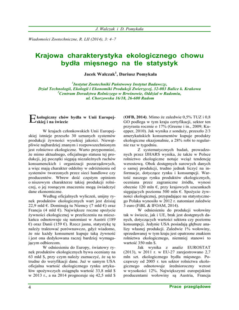 J. Walczak i D. Pomykała Wiadomości Zootechniczne, R. LII (2014), 3: 4–7 Krajowa charakterystyka ekologicznego chowu bydła mięsnego na tle statystyk Jacek Walczak1, Dariusz Pomykała 1 Instytut Zootechniki Państwowy Instytut Badawczy, Dział Technologii, Ekologii i Ekonomiki Produkcji Zwierzęcej, 32-083 Balice k. Krakowa 2 Centrum Doradztwa Rolniczego w Brwinowie, Oddział w Radomiu, ul. Chorzowska 16/18, 26-600 Radom E kologiczny chów bydła w Unii Europejskiej i na świecie W krajach członkowskich Unii Europejskiej istnieje przeszło 30 uznanych systemów produkcji żywności wysokiej jakości. Niewątpliwie najbardziej znanym i rozpowszechnionym jest rolnictwo ekologiczne. Warto przypomnieć, że mimo aktualnego, oficjalnego statusu tej produkcji, jej początki sięgają niezależnych ruchów konsumenckich i organizacji pozarządowych, a więc mają charakter oddolny w odróżnieniu od systemów tworzonych przez sieci handlowe czy producentów. Wbrew dość częstym opiniom o niszowym charakterze takiej produkcji rolniczej, o jej rosnącym znaczeniu mogą świadczyć dane ekonomiczne. Według oficjalnych wyliczeń, unijny rynek produktów ekologicznych wart jest dzisiaj 22,9 mld €. Dominują tu Niemcy (7 mld €) oraz Francja (4 mld €). Największe roczne spożycie żywności ekologicznej w przeliczeniu na mieszkańca odnotowuje się natomiast w Austrii (189 €) oraz Danii (159 €). Rzecz jasna, statystykę tę należy traktować porównawczo, gdyż wiadomo, że nie każdy konsument kupuje taką żywność i jest ona dedykowana raczej bardziej wymagającym odbiorcom. W odniesieniu do Europy, światowy rynek produktów ekologicznych bywa oceniany na 63 mld $, przy czym należy zaznaczyć, że są to trudne do weryfikacji dane. Już w samym USA oficjalna wartość ekologicznego rynku artykułów spożywczych osiągnęła wartość 33,8 mld $ w 2013 r., a na 2014 prognozuje się 42,5 mld $ 4 (OFB, 2014). Mimo że zaledwie 0,5% TUZ i 0,8 GO podlega w tym kraju certyfikacji, sektor ten przyrasta rocznie o 17% (Greene i in., 2009; Kuepper, 2010). Jak wynika z sondaży, przeszło 2/3 amerykańskich konsumentów kupuje produkty ekologiczne okazjonalnie, a 28% robi to regularnie raz w tygodniu. Z systematycznych badań, prowadzonych przez IJHARS wynika, że także w Polsce rolnictwo ekologiczne notuje wciąż tendencję wzrostową. Obok dostępnych surowych danych o samej produkcji, trudno jednak liczyć na informacje, dotyczące rynku i konsumpcji. Wartość naszego rynku produktów ekologicznych, oceniana przez zagraniczne źródła, wynosi obecnie 120 mln €, przy krajowych szacunkach sięgających poziomu 500 mln €. Spożycie żywności ekologicznej, przypadające na statystycznego Polaka wynosiło w 2012 r. natomiast zaledwie 3 euro (FiBL & IFOAM, 2014). W odniesieniu do produkcji wołowiny tak w świecie, jak i UE, brak jest dostępnych danych, dotyczących wartości sektora czy poziomu konsumpcji. Jedynie USA posiadają głębsze analizy własnej produkcji. Zaledwie 1% wołowiny, sprzedawanej w tym kraju jest opatrzone znakiem rolnictwa ekologicznego, niemniej stanowi to wartość 350 mln $. Jak wynika z analiz EUROSTAT (2013), w 2011 r. w EU-27 zarejestrowano 2,7 mln szt. ekologicznego bydła mięsnego. Począwszy od 2005 r. ten sektor rolnictwa ekologicznego odnotowuje średnioroczny wzrost w wysokości 12%. Największymi europejskimi producentami wołowiny są Austria, Francja Prace przeglądowe Krajowa charakterystyka ekologicznego chowu bydła mięsnego (202,5 tys. szt.), Hiszpania (143 tys. szt.), Dania (109,5 tys. szt.), Szwecja (93,9 tys. szt.), Wielka Brytania (87,5 tys. szt.) i Włochy (70,7 tys. szt.). Największy udział ekologicznej wołowiny w całości krajowych produkcji tego mięsa odnotowano w Austrii (19%) i kolejno w Szwecji (17%), Łotwie i Czechach (13%) oraz Danii (10%) (EC, 2013). W teorii, regulacjach prawnych, jak i praktyce produkcja wołowiny jest ściśle związana z trwałymi użytkami zielonymi. To właśnie one stanowią 44% wszystkich ekologicznych UR w UE. W Polsce jest to odpowiednio 59% UR. Podobny, przekraczający połowę udział mają również Niemcy, Włochy i Wielka Brytania. W ujęciu globalnym TUZ stanowią aż 2/3 całości ekologicznych UR na świecie. Bezpośrednio z produkcją mięsa jest powiązany sektor jego przetwórstwa. Obecnie szacuje się, że działa w nim blisko 3 tys. przetwórni, z czego najwięcej w Wielkiej Brytanii (650 zakładów), a we Francji, Austrii i Włoszech o połowę mniej. W całej UE stanowi on 12% wszystkich przetwórni surowców ekologicznych. W Polsce, obok konwencjonalnego surowca, ekologiczne mięso przetwarza okazjonal- nie 5 zakładów, podczas gdy w Czechach są to już 72 jednostki (Ricke i in., 2012). Ekologiczny chów bydła w kraju Mimo że IJHARS, realizując szereg zadań na rzecz rolnictwa ekologicznego, między innymi sprawując nadzór nad jednostkami certyfikującymi oraz samą produkcją, prowadzi także dość szczegółowy monitoring gospodarstw. Niestety, bardzo niewiele wiadomo z gromadzonych tu danych na temat chowu bydła mięsnego. Dopiero dalsze własne analizy, przeprowadzone przez autorów, pozwalają uzyskać bardziej dokładny obraz. Otóż, chowem bydła mięsnego zajmuje się łącznie 3149 gospodarstw, utrzymujących pogłowie, liczące 25 140 szt. Jak wynika z przeprowadzonej analizy własnej, na jedno gospodarstwo przypada zatem średnio 7,98 szt. Jednak, w rzeczywistości znacząca część gospodarstw, tj. 22,1% posiada zaledwie 1 szt. Najwięcej, bo 45,6% gospodarstw utrzymuje do 5 szt. bydła mięsnego, a w dalszej kolejności − 16% do 10 szt., 9,3% do 20 szt., 4,8% do 50 szt., a 1,3% do 100 szt. Wykres 1. Krajowa struktura pogłowia ekologicznego bydła mięsnego − opracowanie własne na podstawie danych IJHARS, 2013 Figure 1. National structure of organic beef cattle population − authors’ own compilation based on Agricultural and Food Quality In