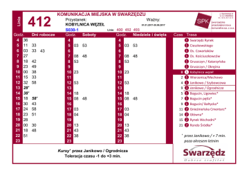 Linia 412 Godz. 4 36 5 11 6 03 7 27 8 18 9 23 10 00 11 15 12 32 13 28' 14 38' 15 18 16 30 17 24 18 23 19 28 20 00 21 18 22 51 23 Dni robocze 33 33 43 42 49 38 33 58 58' 43 58 51 30 48 KOMUNIKACJA MIEJSKA W SWARZĘDZU Przystanek: KOBYLNICA WĘZEŁ S030-1 Godz. Soboty 4 5 03 53 6 7 08 48 8 53 9 10 23 11 12 53 13 14 18 15 08 48 16 17 03 18 04 19 20 13 21 43 22 38 23 Ważny: 01.01.2017-30.06.2017 Linie: 400 492 Godz. 4 5 03 6 7 08 8 53 9 10 23 11 12 53 13 14 18 15 08 16 17 03 18 04 19 20 13 21 43 22 38 23 Kursy' przez Janikowo / Ogrodnicza Toleracja czasu -1 do +3 min. 493 Niedziele i święta Czas Trasa 53 48 48 0 2 4 9 5 7 9 11 14 15 21 ❶ Swarzędz Rynek ❶ Cieszkowskiego ❶ Os. Czwartaków ❶ Os. Kościuszkowców ❶ Gruszczyn / Katarzyńska ❶ Gruszczyn / Okrężna ❶ Kobylnica węzeł ❶ Wierzenica/Mechowo ❶ Janikowo / Szybowcowa ❶ Janikowo / Ogrodnicza ❶ Bogucin, Ligowiec* ❶ Bogucin pętla* ❶ Bogucin/ Bałtycka* ❷ Gnieźnieńska Cmentarz* ❷ Główna* ❷ Rynek Wschodni* ❷ Rondo Śródka* ' przez Janikowo / + 7 min. poza okresem letnim
