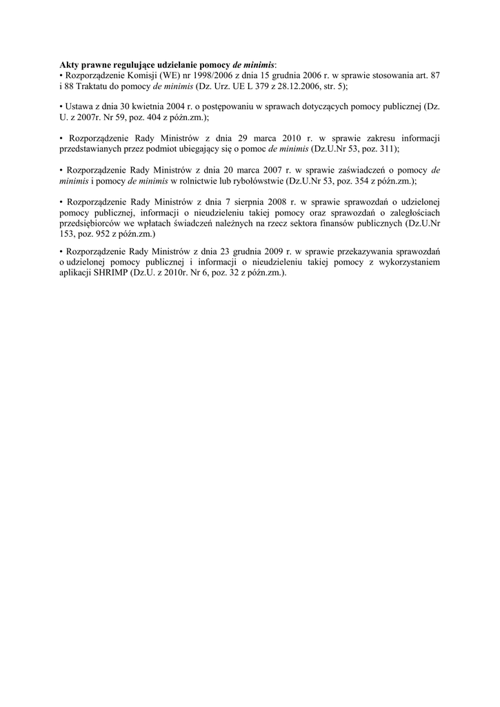 Akty prawne regulujące udzielanie pomocy de minimis: • Rozporządzenie Komisji (WE) nr 1998/2006 z dnia 15 grudnia 2006 r. w sprawie stosowania art. 87 i 88 Traktatu do pomocy de minimis (Dz. Urz. UE L 379 z 28.12.2006, str. 5); • Ustawa z dnia 30 kwietnia 2004 r. o postępowaniu w sprawach dotyczących pomocy publicznej (Dz. U. z 2007r. Nr 59, poz. 404 z póżn.zm.); • Rozporządzenie Rady Ministrów z dnia 29 marca 2010 r. w sprawie zakresu informacji przedstawianych przez podmiot ubiegający się o pomoc de minimis (Dz.U.Nr 53, poz. 311); • Rozporządzenie Rady Ministrów z dnia 20 marca 2007 r. w sprawie zaświadczeń o pomocy de minimis i pomocy de minimis w rolnictwie lub rybołówstwie (Dz.U.Nr 53, poz. 354 z późn.zm.); • Rozporządzenie Rady Ministrów z dnia 7 sierpnia 2008 r. w sprawie sprawozdań o udzielonej pomocy publicznej, informacji o nieudzieleniu takiej pomocy oraz sprawozdań o zaległościach przedsiębiorców we wpłatach świadczeń należnych na rzecz sektora finansów publicznych (Dz.U.Nr 153, poz. 952 z późn.zm.) • Rozporządzenie Rady Ministrów z dnia 23 grudnia 2009 r. w sprawie przekazywania sprawozdań o udzielonej pomocy publicznej i informacji o nieudzieleniu takiej pomocy z wykorzystaniem aplikacji SHRIMP (Dz.U. z 2010r. Nr 6, poz. 32 z późn.zm.).