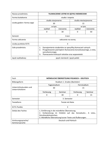 Nazwa przedmiotu TŁUMACZENIE USTNE W JĘZYKU NIEMIECKIM Forma kształcenia studia I stopnia studia stacjonarne studia niestacjonarne 30 15 w tym w tym Liczba godzin i forma zajęd wykład dwiczenia wykład 0 30 0 Semestr dwiczenia 50 trzeci Forma zaliczenia zaliczenie na ocenę Liczba punktów ECTS 3 Cele przedmiotu 1. Zaznajomienie studentów ze specyfiką tłumaczeo ustnych. 2. Przygotowanie pod kątem tłumaczenia konsekutywnego, a vista, symultanicznego. 3. Tłumaczenie krótszych tekstów oraz wypowiedzi. Język wykładowy język niemiecki i język polski Fach MÜNDLICHE ÜBERSETZUNG POLNISCH – DEUTSCH Bildungsform Studium 1. Grades (Bachelor) Tagesstudium Fernstudium 30 15 Unterrichtsstunden und Unterrichtsform Semester Testatform ECTC-Punkte Ziel(e) des Faches Vorlesungssprache/ Seminarsprache Vorlesung Seminar Vorlesung 0 30 0 Seminar 15 3. Semester Testat mit Note 3 1. Einführung in die mündliche Übersetzung. 2. Vorbereitung im Hinblick auf das Konsekutiv-, A vista-, Simultandolmetschen. 3. Mündliche Übersetzung kurzer Texte und Äußerungen. Deutsch und Polnisch