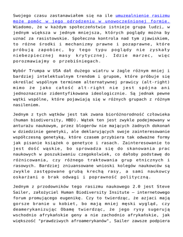 Swojego czasu zastanawiałem się na ile umuzealnienie rasizmu może pomóc w jego odrodzeniu w unowocześnionej formie. Wiadomo, że w każdym społeczeństwie istnieje grupa ludzi, w jednym większa w jednym mniejsza, których poglądy można by uznać za rasistowskie. Społeczna kontrola nad tym zjawiskiem, to różne środki i mechanizmy prawne i pozaprawne, które próbują zapobiec, by tego typu poglądy nie zyskały niebezpiecznej masy krytycznej. Idzie marzec, więc porozmawiajmy o przebiśniegach. Wybór Trumpa w USA dał dużego wiatru w żagle różnym mniej i bardziej intelektualnym trendom i grupom, które próbuje się określać wspólnym terminem alternatywnej prawicy (alt-right) mimo że jako całość alt-right nie jest spójna ani jednoznacznie zidentyfikowana ideologicznie. Są jednak pewne wątki wspólne, które pojawiają się w różnych grupach z różnym nasileniem. Jednym z tych wątków jest tak zwana bioróżnorodność człowieka (human biodiversity, HBD). Wątek ten jest zwykle podejmowany w anturażu naukowym, przez blogerów nie mających żadnych dokonań w dziedzinie genetyki, ale deklarujących swoje zainteresowanie współczesną genetyką, które czasem przybiera tak odważne formy jak pisanie książek o genetyce i rasach. Zainteresowanie to jest dość wąskie, bo sprowadza się do skanowania prac naukowych w poszukiwaniu czegokolwiek, co dałoby podstawę do różnicowania, czy różnego traktowania grup etnicznych i rasowych. Bardziej zniuansowane wnioski kolegów naukowców są zwykle zastępowane grubą krechą rasy, a sami naukowcy oskarżani o brak odwagi i poprawność polityczną. Jednym z przodowników tego rasizmu naukowego 2.0 jest Steve Sailer, założyciel Human Biodiversity Insitute – internetowego forum promującego eugenikę. Czy to twierdząc, że azjaci mają gorsze branie u kobiet, bo mają mniej męski wygląd, czy deamerykanizując Obamę twierdząc, że jego rysy sugerują wschodnio afrykańskie geny a nie zachodnio afrykańskie, jak większość "prawdziwych afroamerykanów", Sailer zawsze podpiera się nauką. No bo każdy może się nauką "podpierać" i nikomu nie można tego zabronić. Najgorsze jednak jest to, że Sailer, jak wielu mu podobnych, rzeczywiście dysponuje ponadprzeciętną wiedzą dotyczącą genetyki i przeciętny czytelnik jego wywodów nie ma możliwości prostej identyfikacji tych treści jako pseudonauki. Ludzie, którym podobają się tego typu idee to nie jakieś prytmitywne naziołki, tylko wyształceni i inteligentni przedstawiciele klasy średniej, często libertarianie, często związani z technologią, często hipsterzy, liberałowie, ateiści, często samookreślający się jako racjonaliści. Nieco mniej radykalny, a przez to bardziej niebezpieczny, jest Nicolas Wade. Każdy przeciętny czytelnik, nawet względnie obeznany z genetyką może dać się przekonać temu świetnie piszącemu, wieloletniemu felietoniście naukowemu z New York Timesa. Jego książkę "The Troublesome Inheritance: Genes, Race and Human History" powinien przeczytać każdy, kto szuka twardych podstaw wyższości cywilizacji zachodniej i chciałby ugruntować swoje przekonanie o niemożliwych od przeskoczenia różnicach między grupami etnicznymi w niemożliwej do odróżnienia od nauki pseudonauce. Charles Murray, prominentny libertariański politolog, praojciec wszystkich amerykańskich nowych rasistów, autor eugenicznej książki "The Bell Curve", przekonującej "naukowo", że biali nie powinni się mieszać z czarnymi ani meksykańcami, pisał peany na temat książki Wade'a. Tak, tak – akcja dzieje się w XXI wieku roku i bohaterowie nie są fikcyjni. Dziennikarze jak zwykle chętnie przytaczali opinię Murraya, bo jest to człowiek bardzo wpływowy i zasłużony, nie poświęcając zbytniej uwagi takim drobiazgom jak list ponad stu genetyków denuncjujący książkę jako pseudonaukową. Co tam naukowcy – ci politykorektni nudziarze i ich zdania wielokrotnie złożone pełne zbyt długich wyrazów. Inna ciekawa postać to bloger JayMan, który sam określa się mianem skrupulatnego konesera empiryzmu (czyżby racjonalista?), jest ateistą, liberałem i co ciekawe, sam ma bardzo mieszaną kompozycję etniczną. Jego walka z "murzyńskością" jest więc walką z własnymi słabościami. Na pytanie jednego ze swoich czytelników, co zrobić gdy się jest w związku z czarną dziewczyną, żeby dzieci jak najmniej zdegenerowały się genetycznie, Jayman sugeruje przeprowadzkę do białego Maine i całkowite odcięcie od czarnych wpływów. Nowi rasiści często przedstawiają ciekawe dylematy intelektualne, których celem jest perswazja konieczności i nieuchronności zaakceptowania różnic między rasami i zaaplikowania ich w polityce i codziennym życiu. Przykładem jest farmakoróżnorodność, czyli możliwa konieczność dostosowywania leków do indywidualnej kompozycji genetycznej, co może prowadzić do konieczności produkcji leków dla konkretnej grupy etnicznej. Wszystko dla waszego dobra, chcemy wam pomóc. Nowy rasizm jest niebezpiecznie inteligentny, często odwołuje się do empatii i "realizmu", a więc i pragmatyzmu, bywa oświeceniowo utylitarny, racjonalistyczne ciuszki. jednym słowem ubiera się w W dawnych czasach, kiedy nie było internetu, istniały pewne strukturalne bariery uniemożliwiające czystej wody wariatom wyrażanie swoich opinii w miejscach, w których opinie takie mogłyby ulec upowszechnieniu. To bardzo trafne zdanie, nie moje co prawda, ale się pod nim podpiszę. Podpiszę się, mimo że padło z ust jednego z fanów JayMana i mimo że JayMan pogratulował jego trafności, po czym oboje przeszli do rozpaczania nad internetowymi troglodytami ludzkiej bioróżnorodności, którzy upraszczają zniuansowane i precyzyjne rozważania JayMana. Jak żyć?