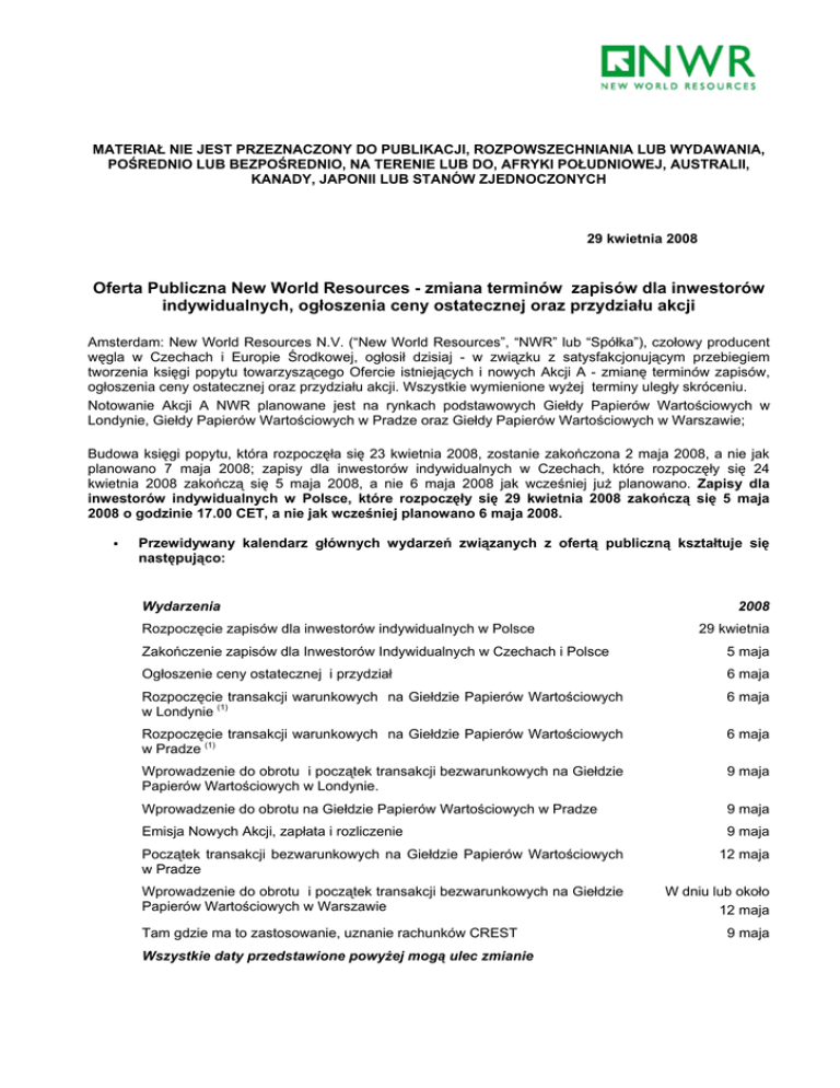 MATERIA! NIE JEST PRZEZNACZONY DO PUBLIKACJI, ROZPOWSZECHNIANIA LUB WYDAWANIA, PO"REDNIO LUB BEZPO"REDNIO, NA TERENIE LUB DO, AFRYKI PO!UDNIOWEJ, AUSTRALII, KANADY, JAPONII LUB STANÓW ZJEDNOCZONYCH 29 kwietnia 2008 Oferta Publiczna New World Resources - zmiana terminów zapisów dla inwestorów indywidualnych, og#oszenia ceny ostatecznej oraz przydzia#u akcji Amsterdam: New World Resources N.V. (“New World Resources”, “NWR” lub “Spó!ka”), czo!owy producent w"gla w Czechach i Europie #rodkowej, og!osi! dzisiaj - w zwi$zku z satysfakcjonuj$cym przebiegiem tworzenia ksi"gi popytu towarzysz$cego Ofercie istniej$cych i nowych Akcji A - zmian" terminów zapisów, og!oszenia ceny ostatecznej oraz przydzia!u akcji. Wszystkie wymienione wy%ej terminy uleg!y skróceniu. Notowanie Akcji A NWR planowane jest na rynkach podstawowych Gie!dy Papierów Warto&ciowych w Londynie, Gie!dy Papierów Warto&ciowych w Pradze oraz Gie!dy Papierów Warto&ciowych w Warszawie; Budowa ksi"gi popytu, która rozpocz"!a si" 23 kwietnia 2008, zostanie zako'czona 2 maja 2008, a nie jak planowano 7 maja 2008; zapisy dla inwestorów indywidualnych w Czechach, które rozpocz"!y si" 24 kwietnia 2008 zako'cz$ si" 5 maja 2008, a nie 6 maja 2008 jak wcze&niej ju% planowano. Zapisy dla inwestorów indywidualnych w Polsce, które rozpocz$#y si$ 29 kwietnia 2008 zako%cz& si$ 5 maja 2008 o godzinie 17.00 CET, a nie jak wcze'niej planowano 6 maja 2008. ! Przewidywany kalendarz g#ównych wydarze% zwi&zanych z ofert& publiczn& kszta#tuje si$ nast$puj&co: Wydarzenia Rozpocz"cie zapisów dla inwestorów indywidualnych w Polsce 2008 29 kwietnia Zako'czenie zapisów dla Inwestorów Indywidualnych w Czechach i Polsce 5 maja Og!oszenie ceny ostatecznej i przydzia! 6 maja Rozpocz"cie transakcji warunkowych na Gie!dzie Papierów Warto&ciowych w Londynie (1) 6 maja Rozpocz"cie transakcji warunkowych na Gie!dzie Papierów Warto&ciowych w Pradze (1) 6 maja Wprowadzenie do obrotu i pocz$tek transakcji bezwarunkowych na Gie!dzie Papierów Warto&ciowych w Londynie. 9 maja Wprowadzenie do obrotu na Gie!dzie Papierów Warto&ciowych w Pradze 9 maja Emisja Nowych Akcji, zap!ata i rozliczenie 9 maja Pocz$tek transakcji bezwarunkowych na Gie!dzie Papierów Warto&ciowych w Pradze 12 maja Wprowadzenie do obrotu i pocz$tek transakcji bezwarunkowych na Gie!dzie Papierów Warto&ciowych w Warszawie W dniu lub oko!o 12 maja Tam gdzie ma to zastosowanie, uznanie rachunków CREST Wszystkie daty przedstawione powy!ej mog" ulec zmianie 9 maja (1) Je&li nie nast$pi wprowadzenie do obrotu wszystkie transakcje warunkowe b"d$ przeprowadzone na nienotowanych papierach warto&ciowych oraz nie b"d$ skuteczne. Wszystkie te transakcje b"d$ dokonywane na w!asne ryzyko inwestorów. Transakcje warunkowe nie b"d$ dokonywane na Gie!dzie Papierów warto&ciowych w Warszawie. Inne szczegó#y dotycz&ce Oferty Publicznej pozosta#y bez zmian: ! Przedzia! cenowy z zwi$zku z pierwsz$ ofert$ publiczn$ (IPO) zwyk!ych akcji serii A New World Resources zosta! wyznaczony na 10,75GBP do 13,25GBP (funtów brytyjskich) za Akcj" zwyk!$ A; ! Oferta sk!ada si" z 83 013 344 Akcji zwyk!ych A, z których 69 513 344 b"dzie sprzedawane przez RPG Industries SE, akcjonariusza NWR, a do 13 500 000 akcji b"d$ to nowoemitowane akcje przez NWR; ! Oferta reprezentuje !$cznie do 31,5% akcji NWR z wy!$czeniem Opcji Dodatkowego Przydzia!u, która mo%e zawiera( !$cznie do 15% oferowanych Akcji A; ! Bior$c pod uwag" przedzia! cenowy ustalony na 10,75 GBP -13,25 GBP oraz !$czn$ liczb" oferowanych akcji !$czna warto&( oferty wyniesie od 892 mln GBP do 1,1 mld GBP (w przybli%eniu 1,2- 1,4 mld EUR). W efekcie kapitalizacja NWR wyniesie mi"dzy 2,8 mld EUR i 3,5 mld GBP (w przybli%eniu 3,5 mld EUR - 4,4 mld EUR); ! Publikacja prospektu i oraz pocz$tek roadshow nast$pi!y 23 kwietnia 2008 Prospekt Elektroniczne wersje prospektu dost"pne s$ na stronach internetowych: New World Resources (www.newworldresources.eu), dla inwestorów w Czechach: www.csas.cz, www.patria.cz i www.wood.cz oraz dla inwestorów w Polsce na: www.ca-ib.pl. Darmowa wersja drukowana prospektu dost"pna jest w biurach w siedzibie UniCredit CAIB Poland S.A. („Oferuj$cy”) w Warszawie, ul. Emilii Plater 53, w Centrum Informacyjnym Komisji Nadzoru Finansowego w Warszawie, pl. Powsta'ców Warszawy 1, w Centrum Promocji Gie!dy Papierów Warto&ciowych w Warszawie, ul. Ksi$%"ca 4, w Punktach Obs!ugi Klienta Centralnego Domu Maklerskiego Pekao S.A. przyjmuj$cych zapisy na akcje Spó!ki w ramach oferty publicznej; Punktach Obs!ugi Klienta Domu Maklerskiego Pekao przyjmuj$cych zapisy na akcje Spó!ki w ramach oferty publicznej oraz punktach przyjmowania zlece' Pekao w ca!ej Polsce. Ponadto prospekt dost"pny jest w biurach: New World Resources (Fred. Roeskestraat 123-3, 1076 EE, Amsterdam, Holandia), Morgan Stanley & Co. International plc (25 Cabot Square Canary Wharf, Londyn E14 4QA, Wielka Brytania), Goldman Sachs International (Peterborough Court, 133 Fleet Street, Londyn EC4A 2BB, Wielka Brytania), JP Morgan Cazenove Limited (20 Moorgate, Londyn EC2R 6DA, Wielka Brytania) oraz w biurach pozosta!ych mened%erów, G!ównego Agenta P!atno&ci i czeskiego Agenta Sprzedaj$cego. Informacje / Zapytania: New World Resources Tel: +31 20 570 2210 Marek Jelínek Jennifer Martin Tel: +31 20 570 2255 Morgan Stanley Tel: +44 207 425 8000 Gergely Voros Katarina Kohlmayer 2 Peter Bacchus Alastair Cochran Goldman Sachs International Tel: +44 207 774 1000 Richard Cormack Klaus Umek Philip Lindop JPMorgan Cazenove Tel: +44 20 7588 2828 Charles Harman Ian Hannam Adam Brett James Taylor Citigate Dewe Rogerson Tel: +44 20 7638 9571 Andrew Hey Toby Moore Kate Delahunty Sandra Novakov Cook Communications Tel: + 420 602 683 230 Joe Cook NBS Public Relations Tel. + 48 826 74 18 Anna Krajewska )ukasz Wójcik Ani niniejszy komunikat ani jego kopia nie mog! by" przekazywane ani wysy#ane na terenie, lub do, Stanów Zjednoczonych Ameryki, Afryki Po#udniowej, Australii, Kanady l