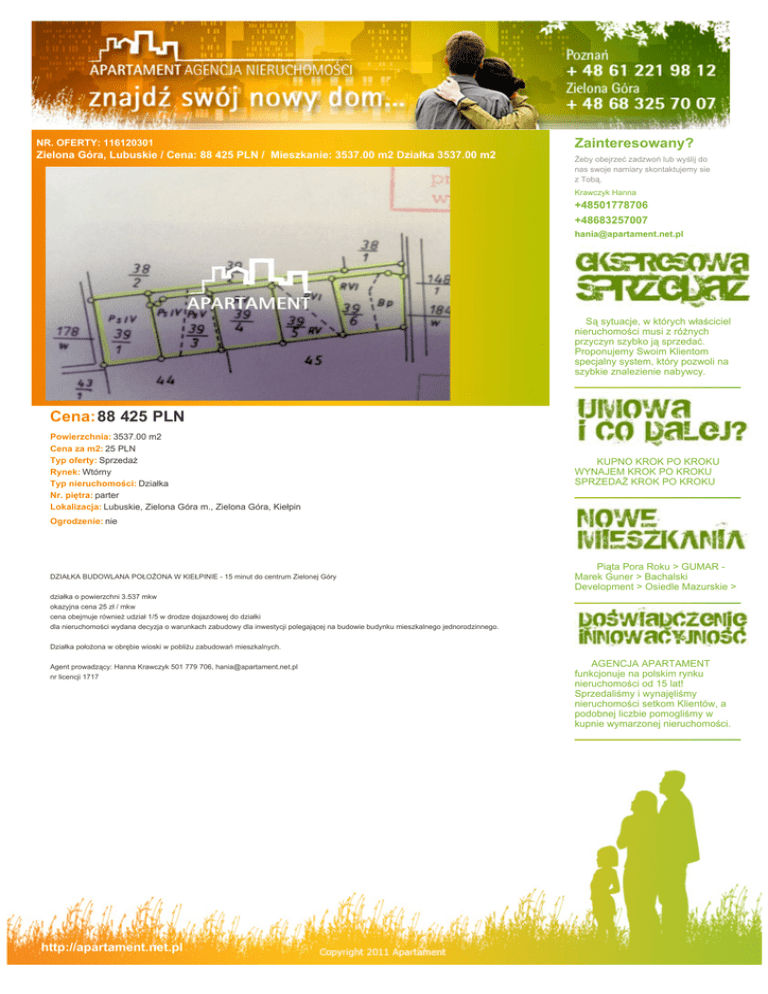 NR. OFERTY: 116120301 Zielona Góra, Lubuskie / Cena: 88 425 PLN / Mieszkanie: 3537.00 m2 Działka 3537.00 m2 Zainteresowany? Żeby obejrzeć zadzwoń lub wyślij do nas swoje namiary skontaktujemy sie z Tobą. Krawczyk Hanna +48501778706 +48683257007 [email protected] Są sytuacje, w których właściciel nieruchomości musi z różnych przyczyn szybko ją sprzedać. Proponujemy Swoim Klientom specjalny system, który pozwoli na szybkie znalezienie nabywcy. Cena: 88 425 PLN Powierzchnia: 3537.00 m2 Cena za m2: 25 PLN Typ oferty: Sprzedaż Rynek: Wtórny Typ nieruchomości: Działka Nr. piętra: parter Lokalizacja: Lubuskie, Zielona Góra m., Zielona Góra, Kiełpin KUPNO KROK PO KROKU WYNAJEM KROK PO KROKU SPRZEDAŻ KROK PO KROKU Ogrodzenie: nie DZIAŁKA BUDOWLANA POŁOŻONA W KIEŁPINIE - 15 minut do centrum Zielonej Góry Piąta Pora Roku > GUMAR Marek Guner > Bachalski Development > Osiedle Mazurskie > działka o powierzchni 3.537 mkw okazyjna cena 25 zł / mkw cena obejmuje również udział 1/5 w drodze dojazdowej do działki dla nieruchomości wydana decyzja o warunkach zabudowy dla inwestycji polegającej na budowie budynku mieszkalnego jednorodzinnego. Działka położona w obrębie wioski w pobliżu zabudowań mieszkalnych. Agent prowadzący: Hanna Krawczyk 501 779 706, [email protected] nr licencji 1717 http://apartament.net.pl AGENCJA APARTAMENT funkcjonuje na polskim rynku nieruchomości od 15 lat! Sprzedaliśmy i wynajęliśmy nieruchomości setkom Klientów, a podobnej liczbie pomogliśmy w kupnie wymarzonej nieruchomości.