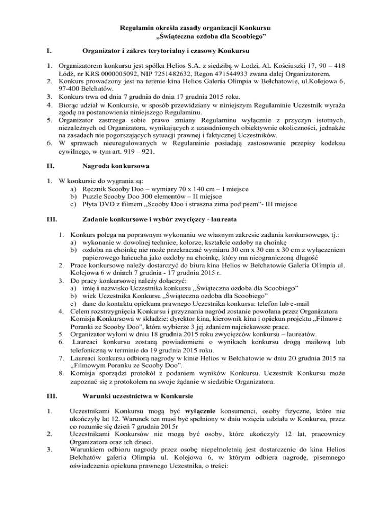 Regulamin określa zasady organizacji Konkursu „Świąteczna ozdoba dla Scoobiego” I. Organizator i zakres terytorialny i czasowy Konkursu 1. Organizatorem konkursu jest spółka Helios S.A. z siedzibą w Łodzi, Al. Kościuszki 17, 90 – 418 Łódź, nr KRS 0000005092, NIP 7251482632, Regon 471544933 zwana dalej Organizatorem. 2. Konkurs prowadzony jest na terenie kina Helios Galeria Olimpia w Bełchatowie, ul.Kolejowa 6, 97-400 Bełchatów. 3. Konkurs trwa od dnia 7 grudnia do dnia 17 grudnia 2015 roku. 4. Biorąc udział w Konkursie, w sposób przewidziany w niniejszym Regulaminie Uczestnik wyraża zgodę na postanowienia niniejszego Regulaminu. 5. Organizator zastrzega sobie prawo zmiany Regulaminu wyłącznie z przyczyn istotnych, niezależnych od Organizatora, wynikających z uzasadnionych obiektywnie okoliczności, jednakże na zasadach nie pogorszających sytuacji prawnej i faktycznej Uczestników. 6. W sprawach nieuregulowanych w Regulaminie posiadają zastosowanie przepisy kodeksu cywilnego, w tym art. 919 – 921. II. Nagroda konkursowa 1. W konkursie do wygrania są: a) Ręcznik Scooby Doo – wymiary 70 x 140 cm – I miejsce b) Puzzle Scooby Doo 300 elementów – II miejsce c) Płyta DVD z filmem „Scooby Doo i straszna zima pod psem”- III miejsce III. Zadanie konkursowe i wybór zwycięzcy - laureata 1. Konkurs polega na poprawnym wykonaniu we własnym zakresie zadania konkursowego, tj.: a) wykonanie w dowolnej technice, kolorze, kształcie ozdoby na choinkę b) ozdoba na choinkę nie może przekraczać wymiaru 30 cm x 30 cm x 30 cm z wyłączeniem papierowego łańcucha jako ozdoby na choinkę, który ma nieograniczoną długość 2. Prace konkursowe należy dostarczyć do biura kina Helios w Bełchatowie Galeria Olimpia ul. Kolejowa 6 w dniach 7 grudnia - 17 grudnia 2015 r. 3. Do pracy konkursowej należy dołączyć: a) imię i nazwisko Uczestnika konkursu „Świąteczna ozdoba dla Scoobiego” b) wiek Uczestnika Konkursu „Świąteczna ozdoba dla Scoobiego” c) dane do kontaktu opiekuna prawnego Uczestnika konkursu: telefon lub e-mail 4. Celem rozstrzygnięcia Konkursu i przyznania nagród zostanie powołana przez Organizatora Komisja Konkursowa w składzie: dyrektor kina, kierownik kina i opiekun projektu „Filmowe Poranki ze Scooby Doo”, która wybierze 3 jej zdaniem najciekawsze prace. 5. Organizator wyłoni w dniu 18 grudnia 2015 roku zwycięzców konkursu – laureatów. 6. Laureaci konkursu zostaną powiadomieni o wynikach konkursu drogą mailową lub telefoniczną w terminie do 19 grudnia 2015 roku. 7. Laureaci konkursu odbiorą nagrody w kinie Helios w Bełchatowie w dniu 20 grudnia 2015 na „Filmowym Poranku ze Scooby Doo”. 8. Komisja sporządzi protokół z podaniem wyników Konkursu. Uczestnik Konkursu może zapoznać się z protokołem na swoje żądanie w siedzibie Organizatora. III. 1. 2. 3. Warunki uczestnictwa w Konkursie Uczestnikami Konkursu mogą być wyłącznie konsumenci, osoby fizyczne, które nie ukończyły lat 12. Warunek ten musi być spełniony w dniu wzięcia udziału w Konkursu, przez co rozumie się dzień 7 grudnia 2015r Uczestnikami Konkursów nie mogą być osoby, które ukończyły 12 lat, pracownicy Organizatora oraz ich dzieci. Warunkiem odbioru nagrody przez osobę niepełnoletnią jest dostarczenie do kina Helios Bełchatów galeria Olimpia ul. Kolejowa 6, w którym odbiera nagrodę, pisemnego oświadczenia opiekuna prawnego Uczestnika, o treści: „ Ja niżej podpisany/a (imię i nazwisko) jako opiekun prawny (należy wskazać stosunek prawny: np. rodzic, opiekun, itp.) niepełnoletniego (należy wskazać dane Uczestnika),: · wyrażam zgodę na udział (dane uczestnika) w Konkursie o nazwie: „Świąteczna ozdoba dla Scoobiego”, znam treść Regulaminu Konkursów i akceptuję w pełni jego treść i warunki.” · wyrażam zgodę na i upoważniam Organizatora do przetwarzania danych osobowych moich i (dane uczestnika) na zasadach wskazanych w Regulaminie, dla celów realizacji Konkursu.” 4. Warunkiem odbioru nagrody przez Uczestnika niepełnoletniego jest stawienie się Uczestnika celem odbioru nagrody wraz z opiekunem prawnym lub samodzielnie, pod warunkiem posiadania i przekazania Organizatorowi, najpóźniej podczas odbioru nagrody pisemnej zgody opiekuna na odbiór nagrody przez Uczestnika. IV. Dane osobowe 1. Uczestnicy Konkursu wysyłając maila i podając swoje dane osobowe, wyrażają jednocześnie zgodę i upoważniają Organizatora do przetwarzania tych danych osobowych dla celów organizacji Konkursu, wydania przyznanych nagród oraz innych celów związanych z realizacją Konkursu. Uczestnikom Konkursu przysługuje prawo wglądu do swoich danych osobowych, prawo poprawy treści swoich danych osobowych oraz prawo żądania zaprzestania przetwarzania ich danych osobowych. Organizator informuje, iż podane dane osobowe będą przetwarzane zgodnie z ustawą z dnia 29 sierpnia 1997 r. o ochronie danych osobowych (Dz. U. 2002 Nr 101., poz. 926 ze zmianami). 2. 3. V. Warunki odbioru nagród 1. Zwycięzcom – laureatom nie przysługuje prawo do zastrzeżenia wyboru szczególnych właściwości nagrody ani do otrzymania jej ekwiwalentu (pieniężnego, rzeczowego). 2. Wydanie nagrody może nastąpić po spełnieniu łącznie poniższych warunków: a) Stawienie się w wybranym kinie z dokumentem tożsamości b) w przypadku laureatów niepełnoletnich, również po spełnieniu warunków wskazanych w Rozdziale III pkt. 3-5. 3. Nagroda nie może być przeniesiona na osoby trzecie wskazane przez laureata. Organizator nie ponosi odpowiedzialności z powodu niezawinionej przez Organizatora niemożności powiadomienia laureata o wygranej, w szczególności z powodu wskazania przez Uczestnika błędnego numeru telefonu lub jego zmiany w czasie trwania Konkursów lub podania błędnego adresu e-mail Uczestnika. 4. Organizator nie ponosi odpowiedzialności za niemożność odbioru lub realizacji nagród z przyczy