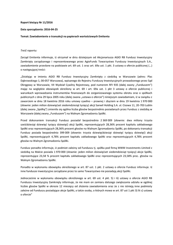Raport bieżący Nr 11/2016 Data sporządzenia: 2016-04-25 Temat: Zawiadomienie o transakcji na papierach wartościowych Emitenta Treść raportu: Zarząd Emitenta informuje, iż otrzymał w dniu dzisiejszym od Akcjonariusza AGIO RB Fundusz Inwestycyjny Zamknięty zarządzanego i reprezentowanego przez AgioFunds Towarzystwo Funduszy Inwestycyjnych S.A., zawiadomienie przesłane na podstawie art. 69 ust. 1 oraz art. 69a ust. 1 pkt. 3 ustawy o ofercie publicznej (…) o następującej treści: „Działając w imieniu AGIO RB Fundusz Inwestycyjny Zamknięty z siedzibą w Warszawie (adres: Plac Dąbrowskiego 1, 00-057 Warszawa), wpisanego do Rejestru Funduszy Inwestycyjnych prowadzonego przez Sąd Okręgowy w Warszawie, VII Wydział Cywilny Rejestrowy, pod numerem RFI 935 (dalej zwany „Funduszem”) mając na względzie obowiązek określony w art. 69 i art. 69a ust. 1 pkt 3 ustawy o ofercie publicznej i warunkach wprowadzania instrumentów finansowych do zorganizowanego systemu obrotu oraz o spółkach publicznych z dnia 29 lipca 2005 roku (dalej zwana „ustawa o ofercie”) niniejszym zawiadamiam, iż w związku z zawarciem w dniu 18 kwietnia 2016 roku umowy cywilno – prawnej i zbyciem w dniu 19 kwietnia 1 970 000 (słownie: jeden milion dziewięćset siedemdziesiąt tysięcy) akcji Sanwil Holding S.A. ul. Cisowa 11, 20-703 Lublin (dalej zwana „Spółką”) zmieniła się ogólna liczba głosów bezpośrednio posiadanych przez Fundusz z siedzibą w Warszawie (dalej zwany „Funduszem”) na Walnym Zgromadzeniu Spółki. Przed dokonaniem transakcji Fundusz posiadał bezpośrednio 2 369 009 (słownie: dwa miliony trzysta sześćdziesiąt dziewięć tysięcy dziewięć) akcji Spółki, reprezentujących 28,36% procent kapitału zakładowego Spółki oraz reprezentujących 28,36% procent głosów na Walnym Zgromadzeniu Spółki, po dokonaniu transakcji Fundusz posiada bezpośrednio 399 009 (słownie: trzysta dziewięćdziesiąt dziewięć tysięcy dziewięć) akcji Spółki, reprezentujących 4,78% procent kapitału zakładowego Spółki oraz reprezentujących 4,78% procent głosów na Walnym Zgromadzeniu Spółki. Fundusz ponadto informuje, iż podmiot zależny od Funduszu tj. spółka pod firmą MWM Investments Limited z siedzibą na Malcie posiada 1 970 000 (słownie: jeden milion dziewięćset siedemdziesiąt tysięcy) akcje Spółki, reprezentujące 23,58 % procent kapitału zakładowego Spółki oraz reprezentujących 23,58% proc. głosów na Walnym Zgromadzeniu Spółki. Ponadto w wykonaniu obowiązku określonego w art. 87 ust. 1 pkt. 2 ustawy o ofercie Fundusz informuje. Iż inne fundusze inwestycyjne zarządzane przez to samo Towarzystwo nie posiadają akcji Spółki. Jednocześnie w wykonaniu obowiązku określonego w art. 69 ust. 4 pkt. 5) i 6) ustawy o ofercie AGIO RB Funduszu Inwestycyjny Zamknięty informuje, że nie mam on zamiaru dalszego zwiększania udziału w ogólnej liczbie głosów Spółki w okresie 12 miesięcy od złożenia zawiadomienia oraz że z nie istnieją inne podmioty zależne od Funduszu posiadające akcje Spółki, a także osoby, o których mowa w art. 87 ust 1 pkt 3) lit c) ustawy o ofercie”