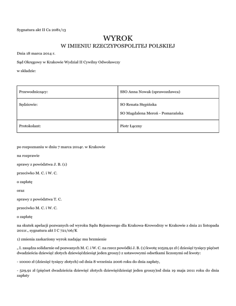 Sygnatura akt II Ca 2081/13 WYROK W IMIENIU RZECZYPOSPOLITEJ POLSKIEJ Dnia 18 marca 2014 r. Sąd Okręgowy w Krakowie Wydział II Cywilny Odwoławczy w składzie: Przewodniczący: SSO Anna Nowak (sprawozdawca) Sędziowie: SO Renata Stępińska SO Magdalena Meroń - Pomarańska Protokolant: Piotr Łączny po rozpoznaniu w dniu 7 marca 2014r. w Krakowie na rozprawie sprawy z powództwa J. B. (1) przeciwko M. C. i W. C. o zapłatę oraz sprawy z powództwa T. C. przeciwko M. C. i W. C. o zapłatę na skutek apelacji pozwanych od wyroku Sądu Rejonowego dla Krakowa-Krowodrzy w Krakowie z dnia 21 listopada 2011r., sygnatura akt I C 721/06/K 1) zmienia zaskarżony wyrok nadając mu brzmienie „ I. zasądza solidarnie od pozwanych M. C. i W. C. na rzecz powódki J. B. (1) kwotę 10529,91 zł ( dziesięć tysięcy pięćset dwadzieścia dziewięć złotych dziewięćdziesiąt jeden groszy) z ustawowymi odsetkami liczonymi od kwoty: - 10000 zł (dziesięć tysięcy złotych) od dnia 8 września 2006 roku do dnia zapłaty, - 529,91 zł (pięćset dwadzieścia dziewięć złotych dziewięćdziesiąt jeden groszy)od dnia 19 maja 2011 roku do dnia zapłaty II. zasądza solidarnie od pozwanych M. C. i W. C. na rzecz powódki T. C. kwotę 10529,91 zł ( dziesięć tysięcy pięćset dwadzieścia dziewięć złotych dziewięćdziesiąt jeden groszy) z ustawowymi odsetkami liczonymi od kwoty: - 10000 zł (dziesięć tysięcy złotych) od dnia 26 września 2006 roku do dnia zapłaty, - 529,91 zł (pięćset dwadzieścia dziewięć złotych dziewięćdziesiąt jeden groszy)od dnia 19 maja 2011 roku do dnia zapłaty III. oddala oba powództwa w pozostałej części; IV. nie obciąża pozwanej I. C. (1) kosztami postępowania; V. przyznaje od Skarbu Państwa - Sądu Rejonowego dla Krakowa - Krowodrzy w Krakowie na rzecz adwokata T. G. kwotę 2952 (dwa tysiące dziewięćset pięćdziesiąt dwa złote) tytułem wynagrodzenia za pomoc prawną udzieloną z urzędu.” 2. oddala apelacje w pozostałej części; 3. odrzuca zażalenie nazwane apelacją na punkt IV zaskarżonego wyroku 4. zasadza solidarnie od pozwanych na rzecz powódki J. B. (2) kwotę 1200 (jeden tysiąc dwieście złotych) tytułem zwrotu kosztów postępowania odwoławczego; 5. zasadza solidarnie od pozwanych na rzecz powódki T. C. kwotę 1200 (jeden tysiąc dwieście złotych) tytułem zwrotu kosztów postępowania odwoławczego; 6. nakazuje ściągnąć od pozwanych solidarnie na rzecz Skarbu Państwa - Sądu Okręgowego w Krakowie kwotę 884,96 zł (osiemset osiemdziesiąt cztery złote dziewięćdziesiąt sześć groszy) tytułem wydatków. UZASADNIENIE wyroku z dnia 18 marca 2014 roku Powódki J. B. (2) i T. C. w ostatecznie sprecyzowanym żądaniu pozwu domagały się zasądzenia na ich rzecz od I. C. (1) kwot po 17179 zł wraz z odsetkami ustawowymi liczonymi od chwili wniesienia pozwu. W uzasadnieniu wskazały, że W. M. zmarł 23 stycznia 1983 roku a spadek po nim nabyła I. C. (1) jako spadkobierca testamentowy, natomiast spadkobiercami ustawowymi są I. C. (1) i powódki. Pozwana I. C. (1) uznała powództwo do kwoty 2000 zł podnosząc, że dom na przedmiotowej nieruchomości został wybudowany w całości ze środków należących do niej. Następnie wniosła o oddalenie rozszerzonych powództw ponad kwotę 500 zł a w razie uznania roszczeń powódek domagała się rozłożenia zasądzonych świadczeń na raty po 100 zł bądź 50 zł miesięcznie oraz nieobciążenie jej kosztami. Zaskarżonym wyrokiem Sąd Rejonowy zasądził od pozwanej I. C. (1) na rzecz powódek J. B. (2) i T. C. kwoty po 11281,63 zł z odsetkami ustawowymi od dnia 14 lipca 2006 roku do dnia zapłaty (punkt I), w pozostałej części oddalił powództwo (punkt II), nie obciążył pozwanej I. C. (1) kosztami postępowania (punkt III) oraz zasądził od Skarbu Państwa (kasy Sądu) na rzecz pełnomocnika z urzędu adwokata T. G. kwotę 2952 zł tytułem nieopłaconej pomocy prawnej udzielonej z urzędu (punkt IV). Podstawą rozstrzygnięcia był następujący stan faktyczny. Właścicielem działki nr (...) o powierzchni 0,16 ha położonej w C. nr(...)zabudowanej domem mieszkalnym była J. M.. Działka ta powstała z (...).1.kat (...)objętej L. (...) oraz (...), (...) objętych lwh (...) i (...) Obie księgi wieczyste dawne zaginęły. J. M. zmarła(...) a spadek po niej nabyli na podstawie ustawy: mąż W. M. i córka I. C. (1) po 1/3 a także wnuczki J. B. (2) i T. C. po 1/6. W. M. zmarł (...)a jego spadkobiercą na podstawie testamentu z dnia (...)jest córka I. C. (1). Spadek po M. M. synu J. i M. zmarłym w dniu(...)na podstawie ustawy nabyli wprost żona I. M. oraz córki J. B. (3) i T. C. po 1/3 części każda. W skład spadku po W. M. wchodzi 1/3 udziału w wyżej opisanej zabudowanej nieruchomości o wartości 270759 zł według stanu na dzień 23 stycznia 1983 roku a według cen na chwilę orzekania. Powyższych ustaleń faktycznych dokonał Sąd Rejonowy na podstawie dokumentów dołączonych do akt sprawy, opinii biegłej E. H. oraz zeznań powódek. Sąd Rejonowy nie dał wiary zeznaniom świadków B. M., J. B. (4) i W. B. oraz pozwanej ponieważ nie znajdywały one potwierdzenia w innych materiałach dowodowych. Sąd Rejonowy powołując art. 991 k.c. zważył, że powódkom należy się zachowek. Jedynym składnikiem majątku spadkowego po W. M. był udział w 1/3 części w prawie własności nieruchomości składającej się z działki nr (...) położonej w C.. Wartość tej działki została ustalona przez biegłego na kwotę 270759 zł. Sąd Rejonowy dokonał obliczenia zachowku na podstawie wartości spadku ustalonej według cen z daty orzekania o roszczeniach z tego tytułu. Argumentował, że z uwagi na fakt, że spadkodawca był uprawniony do 1/3 części nieruchomości, jego synowi W. M. przysługiwałby zachowek w wysokości połowy udziału, który przypadłby mu w drodze dziedziczenia ustawowego, tj. w sumie ¼ a wnuczkom J. 