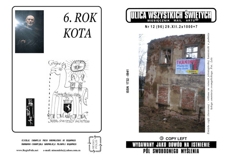 6. ROK KOTA ISSN 1732 - 0941 Estetyka ceg³y zlasowanej - reklama na ruinach jeleniogórskiej kamieniczki u podnó¿a by³ego cmentarza ewangelickiego. Fot.: Lele Nr 12 (96) 29.XII.2x1000+7 CENTRAL EUROPEAN PRESS CORPORATION OF REGIOPOLIS ŒRODKOWO – EUROPEJSKA KORPORACJA PRASOWA REGIOPOLIS www.RegioPolis.net e-mail: [email protected] © COPY LEFT 2 MYŒLI KARASIA, CZYLI KARAŒ MYŒLI WIEJSKA Z KLAS¥ (niekiedy z czterema) Mogê Mogê, Na jedn¹ nogê By³y prezydent S¹dz¹c po gestach I po minach Musia³ coœ ³ykn¹æ Na Filipinach Alergik Ca³e ¿ycie by³ uczulony Zw³aszcza na cudze ¿ony XXX Paso¿yty ¿yj¹ce na roœlinach Umieraj¹ razem z ¿ywicielem. Paso¿yty ¿eruj¹ce na cz³owieku Zmuszone s¹ tylko do przeprowadzki XXX Nie trzeba koniecznie byæ chromym By dostaæ po kulach XXX Najwiêkszym zawodem cz³owieka Sta³oby siê odkrycie, ¯e nawet Pan Bóg nie jest wiarygodny Druga ksi¹¿ka Mariana Karasia „Zamyœlenia z myœlenia ” - ju¿ na stronie www „Ulicy...”. Nowe texty i Nowy Rok... MARIAN KARAŒ MICHA£ GRACZYK 31 dla ¿o³du wszystko zrobi. 30 Forever and Together Poland and USA! Status Porêby, 8. czerwca 2007 quo Dobrzy wujkowie z Rodziny G-8, stó³ obfitoœci, ma³ej, g³upiej ludzkoœci roz³o¿yli. 2 Kraków, 18. czerwca 2007 3 Kolesie Deka i Log Bêdziecie mieli bogów cudzych w internecie, bêdziecie ich wzywaæ codziennie, bêdziecie œwiêciæ dzieñ œwiêty w handlowej galerii. 1 4 Porêby, 7. czerwca 2007 6 Krótki esej z Beskidami w tle, czyli przemyœlenia turysty na kanwie Schengen Pan krzyknie: „Aport –Burek!”, a kundel mu przyniesie, bo mo¿e Pan siê zlituje i wizy zniesie. Dlaczego wiêc, niewdziêczne, rozwydrzone bachory, krzycz¹ g³oœno za oknem? Kundel Wierny sojusznik, wasal silnego seniora, jak pies wierny Pana, w misji pokojowej, na ostrym polowaniu, chcia³by kawa³ek miêsa wyrwaæ dla siebie. Nie wie œlepiec, ¿e dom nas podpali³ wpl¹ta³ w piek³o, ¿e mosty za sob¹ spali³. Na nowym bankiecie Œwiêtego Przymierza, dzieli siê przysz³oœæ naszego œwiata. Czemu wiêc kija chc¹ bardziej, ni¿ marchewki? W uszach grzmi jeszcze huk strzelaj¹cych korków po szampanach, a w pamiêci ci¹gle majacz¹ sceny z grudniowej nocy na granicach. Nieukrywana radoœæ ze zniesienia kontroli na granicach z naszymi unijnymi s¹siadami sk³ania do krótkiej refleksji – niekoniecznie do wielkich s³ów i wiekopomnych przemyœleñ, ale do zwyk³ego spojrzenia na kordony, które co prawda nie zniknê³y, ale ich przekraczanie w znacznym stopniu zosta³o uproszczone. polski Wojna daleka siê toczy, o zniewolenie wasze i brak wolnoœci naszej, ¿eby wró¿ba koñca historii szybciej siê spe³ni³a. W wojnie cywilizacji, ¯o³nierz-polski, wieczny tu³acz, Bêdziecie czciæ star¹ ze starym, bo oni was tu po raz pierwszy przyprowadzili. 5 I bêdzie siê wam dobrze powodziæ na ziemi, bo bêdziecie zabijaæ, cudzo³o¿yæ, kraœæ i k³amaæ. Kiedy7 zaœ starczy czasu, to dla rozrywki, bêdziecie po¿¹daæ konkubiny bliŸniego swego i oprogramowania jego. Porêby, 7. czerwca 2007 Korzystaj¹c z chwili wytchnienia jakie daje trzydniowy urlop w miêdzyœwi¹tecznej przerwie, postanowiliœmy (ja i Annka) wybraæ siê w krótk¹ przeja¿d¿kê w nieodleg³e od Katowic Beskidy. Plan by³ prosty i jasny – byle na po³udnie, ku Istebnej, Jaworzynie i okolicom. I pewnie tak by zosta³o, gdyby ju¿ w samej Wiœle mojej uwagi nie przyku³ drogowskaz „Jablunkov 25”. Przez Jablunkov, znany w Polsce jako Jab³onków wczeœniej tylko przeje¿d¿a³em, teraz pojawi³a siê okazja do zatrzymania siê w tym niewielkim, ale znacz¹cym dla beskidzkiej spo³ecznoœci mieœcie. W Istebnej zaopatrujemy siê wiêc w czeskie korony i w¹sk¹ drog¹ przez Jasnowice kierujemy siê ku Republice Czeskiej. Przejœcie graniczne – jakieœ zadaszone kontenery, obok nich sklep spo¿ywczy (ju¿ po czeskiej stronie) – przeje¿d¿amy sprawnie. A jeszcze w po³owie grudnia, wybieraj¹c siê do niedalekiej Opavy, na przejœciu granicznym sprawdzano nam dowody osobiste. Nasza trasa prowadzi przez Jab³onków, Mosty u Jab³onkowa, s³owacki Svrcinovec, z powrotem na polsk¹ stronê, do nazwijmy to galicyjskiego Zwardonia. I co w tym dziwnego? Ano niby nic – droga jak droga, krótka, jednodniowa wyprawa po beskidzkich groniach. A jednak w perspektywie naszego wejœcia do strefy Schengen, maj¹ca w sobie coœ niesamowitego. Ju¿ choæby to, ¿e na przestrzeni 40 kilometrów, zataczaj¹c pêtlê wœród miejscowoœci, gdzie ludzie pos³uguj¹ siê oficjalnie zbli¿onym, a nieoficjalnie prawie tym samym jêzykiem, cz³owiek przekracza trzy razy granicê pañstwow¹: polsko-czesk¹, czesko-s³owack¹ i s³owacko-polsk¹. Gdyby przewêdrowaæ tê cestê jakimœ górskim szlakiem gdzieœ w czternastym wieku, granic pañstwowych nie by³oby tu ¿adnych – toæ to wszystko nale¿a³o do Œl¹ska. Dopiero pod koniec czternastego stulecia Madziarzy przesunêli granice swego królestwa, zagarniaj¹c w¹ski pas œl¹skiej ziemi od rzeki Kysucy a¿ po Prze³êcz jab³onkowsk¹. To wtedy od œl¹skiej ziemi odpad³ Svrcinovec, o którym bêdzie jeszcze mowa. Nad piêkn¹? Modr¹? Na pewno Olz¹! Gdybyœmy w nasza podró¿ wybrali siê gdzieœ, dajmy na to ko³o roku 1800, zatrzyma³aby nas jedna, jedyna granica: na wysokoœci Gocza³kowic Zdroju, piêtnaœcie kilometrów przez Bielskiem opuœcilibyœmy pruski Œl¹sk i znaleŸli na Œl¹sku cesarskim - austriackim. Tak na marginesie: podzia³ na Prusoków z pó³nocy i Cysaroków, czyli mieszkañców Cieszyñskiego, przetrwa³ do dziœ i do dziœ rozpala czasem g³owy, z przymru¿eniem oka przyznajmy – Cieszynioków. Ale ju¿ miêdzy Istebn¹ a Jab³onkowem kordonu nie ma ¿adnego – i tu i tu ¿yj¹ beskidzcy górale, rodacy lokalnego zbójnika Ondraszka. Mowa rozbrzmiewa tu ta sama – dialekt œl¹ski górali beskidzkich. I konia z rzêdem temu, kto chcia³by wcisn¹æ owych Beskidzioków w jasne ramy nacjonalizmów