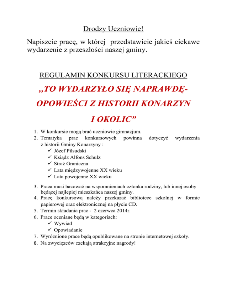Drodzy Uczniowie! Napiszcie pracę, w której przedstawicie jakieś ciekawe wydarzenie z przeszłości naszej gminy. REGULAMIN KONKURSU LITERACKIEGO ,,TO WYDARZYŁO SIĘ NAPRAWDĘOPOWIEŚCI Z HISTORII KONARZYN I OKOLIC” 1. W konkursie mogą brać uczniowie gimnazjum. 2. Tematyka prac konkursowych powinna z historii Gminy Konarzyny : Józef Piłsudski Ksiądz Alfons Schulz Straż Graniczna Lata międzywojenne XX wieku Lata powojenne XX wieku dotyczyć wydarzenia 3. Praca musi bazować na wspomnieniach członka rodziny, lub innej osoby będącej najlepiej mieszkańca naszej gminy. 4. Pracę konkursową należy przekazać bibliotece szkolnej w formie papierowej oraz elektronicznej na płycie CD. 5. Termin składania prac - 2 czerwca 2014r. 6. Prace oceniane będą w kategoriach: Wywiad Opowiadanie 7. Wyróżnione prace będą opublikowane na stronie internetowej szkoły. 8. Na zwycięzców czekają atrakcyjne nagrody!