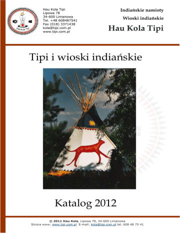 Hau Kola Tipi Lipowa 78 34-600 Limanowa Tel. +48 608487541 Fax (018) 3371438 [email protected] www.tipi.com.pl Indiańskie namioty Wioski indiańskie Hau Kola Tipi Tipi i wioski indiańskie Katalog 2012 © 2011 Hau Kola, Lipowa 78, 34-600 Limanowa Strona www: www.tipi.com.pl E-mail: [email protected] tel. 608 48 75 41 Jak zdobyć prestiż i zaskoczyć znajomych.. Kupując Tipi możesz być pewien niezapomnianych wrażeń, miło spędzonych chwil z rodziną i przyjaciółmi, podziwu w oczach sąsiadów i szczęścia w oczach dziecka. Koniec z nudą i monotonią! Tipi to magiczne miejsce, gdzie zatrzymuje się czas. Nawet komary nie mają tam wstępu! Mówią na Tipi indiański namiot, ale nie wierz w to. Zapomnij o ciasnym i zimnym miejscu, jakim jest namiot. W Tipi zawsze jest ciepło, bo można w środku rozpalić ogień! Miejsca jest na tyle, że zmieści się nawet 30 osób. To prawdziwy s a l o n, nieprawdaż? ...że leżysz w ciepłym łóżku, zapach pieczonej kiełbasy i innych pyszności minionej kolacji miesza się z żywicznym zapachem drewna. Obok pali się bezpiecznie ognisko rzucając magiczne cienie na ściany Tipi, a nad głową przez mały otwór, gdzie dym ucieka widzisz rozgwieżdżone niebo i spadającą gwiazdę. Zasypiasz błogo wspominając chwile z dzieciństwa. "Przebywanie w Tipi jest fascynujące. Duże, wygodne, wszechstronne, zapach palonego wewnątrz ogniska wywołuje we mnie odczucia nieograniczonej swobody, ciepła, przygody, radości. Przywołuje wspomnienia wspaniałych chwil spędzonych wraz z przyjaciółmi." Darek Szybka, właściciel Tipi "Od 20 lat biwakuję w Tipi i nie wyobrażam sobie, że może być inaczej. Ognisko daje ciepło i klimat, a przez otwarte wiatrownice widzę gwiazdy i niebo - czego chcieć więcej." Robert Piesiecki, właściciel Tipi "Noc spędzona w Tipi nie daje długo zapomnieć, nawet gwiazdy oglądane przez otwór w Tipi są inne i tajemnicze. Tego wrażenia nie da się do końca opisać, to trzeba po prostu przeżyć samemu." Pablo Czerwone Serce, właściciel Tipi "Gdy przekroczyłem wejście do Tipi poczułem się jakbym był we własnym domu, bo panowała tam niesamowita atmosfera . Wydawało mi się jakbym był prawdziwym Indianinem. Piękne było to, że przez górny otwór w dzień wpadały promienie słońca, a nocą można było oglądać piękne gwieździste niebo." Wojtek Jaszczur, 13 lat Czy nadal sądzisz, że Tipi można nazwać namiotem? W języku Indian "Tipi" oznacza "Dom". Dla Ciebie będzie to magiczne miejsce gdzie zatrzymuje się czas. I gdzie komary nie maja tam wstępu! Wspomniałem o tym, prawda? © 2011 Hau Kola, Lipowa 78, 34-600 Limanowa Strona www: www.tipi.com.pl E-mail: [email protected] tel. 608 48 75 41 Sekret jak pozbyć się komarów. M arzyłeś kiedyś o miejscu, gdzie można ukryć się przed komarami, a jednocześnie w spokoju zrelaksować się i odpocząć? O miejscu gdzie w upalny dzień nie jest duszno, a lekki wiaterek muska cię po twarzy przynosząc woń pieczonych jabłek? Jest takie miejsce. Jak już wiesz wewnątrz Tipi pali się ognisko. Naturalne płótno, z którego wykonane jest Tipi pochłania dym i żywicę z palącego się drewna. Są to zapachy, których komary nienawidzą. Tipi jest jak bariera ochronna przed wszelkiego rodzaju gryzącymi insektami. One czują z daleka zapach dymu i po prostu je omijają. Czy nie o takim miejscu marzyłeś? A to dopiero początek zalet Tipi. Kto jeszcze pragnie ochłody w upalny dzień? Czy to możliwe żeby w bardzo upalny dzień, w niemal bezwietrzną pogodę cieszyć się lekkim wiaterkiem i przyjemnym zapachem? W Tipi wystarczy lekko unieść boki wykonane z naturalnego płótna i otworzyć drzwi Tipi, a wiatr zaczyna krążyć wewnątrz niczym złapany w pułapkę. Leżąc na wygodnym posłaniu czujemy woń pieczonych jabłek i suszonych śliwek. Palone wcześniej ognisko sprawia, że z drewnianych tyczek wypływa sok, który ma właśnie taki zapach. "Gdy jest za ciepło latem, podnosisz jakąś część płótna i robi się przyjemnie, gdy jest za zimno dorzucasz większy kawałek drewna, zamykasz drzwi i może mrozić na zewnątrz, bo wiesz ze Ciebie i tak to nie ruszy. Tipi jest po prostu super!" Krzysztof Stereńczak, właściciel Tipi A zimą przygoda z Tipi wcale się nie kończy... Może pomyślałeś, że na zimę musisz złożyć Tipi i nic już ciekawego się nie wydarzy. Nic bardziej mylnego. Właśnie zimą zaczyna się największa frajda! Wyobraź sobie... P owrót z wyprawy na narty czy sanki, a może miło spędzony czas na kuligu, bitwę na śnieżki. Jest bardzo mroźne popołudnie, termometr wskazuje minus 20 stopni! Możesz pójść do domu, albo... zorganizować niezapomniany wieczór w Tipi! Płonący ogień szybko nagrzeje wnętrze i możesz rozebrać się z kurtki i swetra. A przecież na zewnątrz jest minus 20 stopni! Trudno uwierzyć? Pamiętam sylwestra spędzonego w gronie znajomych właśnie w Tipi. © 2011 Hau Kola, Lipowa 78, 34-600 Limanowa Strona www: www.tipi.com.pl E-mail: [email protected] tel. 608 48 75 41 Na zewnątrz było minus 27 stopni! A my w samych koszulkach piekliśmy kiełbasę, na ogniu w kotle gotował się gulasz z dziczyzny, obok na grilu skwierczała karkówka, boczek i plastry bakłażana, iskry strzelały wesoło w gorę... ...a nad cała okolicą rozbrzmiewały głośno słowa pieśni "hej ... hej ... hej... sokoły..." To był chyba najlepszy sylwester, jaki pamiętam. A na zewnątrz było -27 stopni! Ty też możesz śmiać się z osób odwołujących grilla z powodu deszczowej pogody, ... jeśli masz Tipi Pewnie nie uwierzysz, gdy powiem, że... grill może być udany nawet w największą ulewę i burze z piorunami! Wiem, że trudno w to uwierzyć, a jednak to właśnie podczas deszczu w Tipi jest niezwykle przyjemnie. Dlaczego? Wyobraź sobie o grillowanie w ogrodzie, gdy nagle zrywa się deszcz! Rozpaczliwie zbierasz wszystkie rzeczy do domu zastanawiając się gdzie pomie