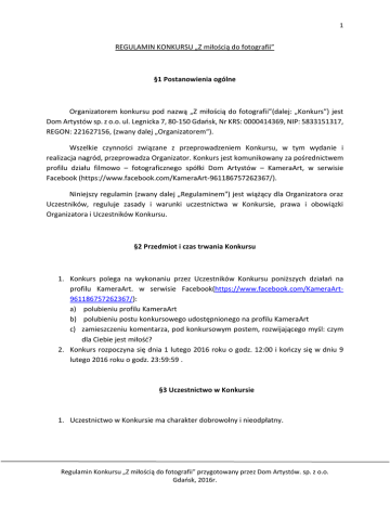 1 REGULAMIN KONKURSU „Z miłością do fotografii” §1 Postanowienia ogólne Organizatorem konkursu pod nazwą „Z miłością do fotografii”(dalej: „Konkurs”) jest Dom Artystów sp. z o.o. ul. Legnicka 7, 80-150 Gdańsk, Nr KRS: 0000414369, NIP: 5833151317, REGON: 221627156, (zwany dalej „Organizatorem“). Wszelkie czynności związane z przeprowadzeniem Konkursu, w tym wydanie i realizacja nagród, przeprowadza Organizator. Konkurs jest komunikowany za pośrednictwem profilu działu filmowo – fotograficznego spółki Dom Artystów – KameraArt, w serwisie Facebook (https://www.facebook.com/KameraArt-961186757262367/). Niniejszy regulamin (zwany dalej „Regulaminem") jest wiążący dla Organizatora oraz Uczestników, reguluje zasady i warunki uczestnictwa w Konkursie, prawa i obowiązki Organizatora i Uczestników Konkursu. §2 Przedmiot i czas trwania Konkursu 1. Konkurs polega na wykonaniu przez Uczestników Konkursu poniższych działań na profilu KameraArt. w serwisie Facebook(https://www.facebook.com/KameraArt961186757262367/): a) polubieniu profilu KameraArt b) polubieniu postu konkursowego udostępnionego na profilu KameraArt c) zamieszczeniu komentarza, pod konkursowym postem, rozwijającego myśl: czym dla Ciebie jest miłość? 2. Konkurs rozpoczyna się dnia 1 lutego 2016 roku o godz. 12:00 i kończy się w dniu 9 lutego 2016 roku o godz. 23:59:59 . §3 Uczestnictwo w Konkursie 1. Uczestnictwo w Konkursie ma charakter dobrowolny i nieodpłatny. Regulamin Konkursu „Z miłością do fotografii” przygotowany przez Dom Artystów. sp. z o.o. Gdańsk, 2016r. 2 2. W Konkursie mogą uczestniczyć osoby fizyczne od 16 roku życia, które skutecznie przystąpiły do Konkursu w sposób opisany w ust. 4 niniejszego paragrafu (dalej „Uczestnicy”). 3. W Konkursie nie mogą uczestniczyć pracownicy Organizatora, członkowie ich najbliższej rodziny oraz inne osoby biorące udział w przygotowaniu i prowadzeniu Konkursu, w tym podmioty lub pracownicy podmiotów, świadczących usługi na rzecz Organizatora przy organizowaniu Konkursu. 4. Osoba, o której mowa w §3 pkt.2, przystępuje do Konkursu poprzez łączne wykonanie następujących czynności, kolejno: W serwisie Facebook (profil: KameraArt): a) Polubienie profilu KameraArt w serwisie Facebook, b) Polubienie oraz udostępnienie na swojej tablicy w serwisie Facebook postu konkursowego udostępnionego na profilu KameraArt, c) Zamieszczenie komentarza pod konkursowym postem, rozwijającego myśl: czym dla Ciebie jest miłość? 5. Prawidłowe wykonanie czynności określonych w ust. 4 skutkuje wysłaniem zgłoszenia do Konkursu (dalej: „Zgłoszenie”). 6. Decyzja Komisji Konkursowej odnośnie przydzielenia Nagrody w Konkursie jest uznaniowa i ostateczna. 7. Laureatów wybiera Komisja Konkursowa, oceniając ciekawość, kreatywność, twórczość nadesłanych Zgłoszeń Konkursowych. Komisja składa się z Zespołu trzech Pracowników działu KameraArt, Domu Artystów sp. z o. o. 8. Uczestnik Konkursu, poprzez wzięcie udziału w Konkursie, wyraża dobrowolnie zgodę na przetwarzanie danych osobowych przez Organizatora zgodnie z ustawą z dnia 29 sierpnia 1997 r. o ochronie danych osobowych (Dz.U. z 2002 r. Nr 101, poz.926 ze zm.) wyłącznie na potrzeby niniejszego Konkursu. 9. Przystępując do Konkursu Uczestnik potwierdza, że jest autorem zgłaszanego do Konkursu komentarza oraz, że komentarz nie narusza jakichkolwiek praw, dóbr lub interesów osób trzecich, jak również obowiązujących przepisów prawa oraz wyraża zgodę na wykorzystanie go przez Organizatora do własnych celów promocyjnych i marketingowych, w tym na jego zamieszczenie w Internecie na profilu profilu Dom Artystów oraz KameraArt w serwisie Facebook. 10. W celu wyjaśnienia wątpliwości związanych z udziałem Uczestnika w Konkursie, Organizator może podjąć próbę kontaktu z Uczestnikiem za pośrednictwem profilu Facebook Uczestnika. 11. Wzięcie udziału w Konkursie oznacza zgodę na zastosowanie się do wszystkich postanowień niniejszego regulaminu. Regulamin Konkursu „Z miłością do fotografii” przygotowany przez Dom Artystów. sp. z o.o. Gdańsk, 2016r. 3 §4 Przebieg Konkursu 1. Konkurs trwa w dniach 1.02.2016 – 9.02.2016. 2. Spośród wszystkich zgłoszonych prac, w trakcie trwania konkursu, Komisja Konkursowa wybierze 1 laureata nagrody pierwszego stopnia(Nagroda Główna) oraz przyzna dwie nagrody II(Nagrody Mniejsze). 3. Zwycięzcy zostaną poinformowani o zdobyciu nagrody poprzez wiadomość wysłaną do Zwycięsców na ich profile, z profilu KameraArt założonego w portalu facebook.com, nie później niż 1 dzień od zakończenia Konkursu. 4. Lista zwycięzców oraz nagrodzone komentarze zostaną opublikowane na profilu KameraArt w portalu Facebook, nie później niż 1 dzień od zakończenia Konkursu. 5. Aby zrealizować Nagrogę, Uczestnik musi nie później niż 2 dni od momentu przekazania przez Organizatora informacji o wygranej, przesłać na profil KameraArt, wiadomość zawierającą następujące dane: imię, nazwisko, adres korespondencyjny, numer telefonu. 6. W przypadku braku wiadomości zwrotnej, o której mowa w §4 pkt.5,Nagroda pozostaje własnością Organizatora. 7. Organizator oświadcza, iż wyłącznie wiadmomość, o której mowa w §4 pkt.5, spełniająca wszystkie wymagania określone w Regulaminie będzie stanowiła podstawę do odbioru nagrody. §5 Nagrody 1. Fundatorem oraz realizatorem Nagród w Konkursie jest Organizator. 2. Nagrody: a) Nagroda Główna: W Konkursie przewidziano 1x Nagrodę Główną - Sesja Zdjęciowa (składająca się z 12 zdjęć) wykonana w Walentynki(14.02.2016r.) lub w innym terminie do końca marca 2016r. b) Nagroda Mniejsza: W Konkursie przewidziano 2x Nagrody Mniejsze - Sesje Zdjęciowe (składające się z 8 zdjęć/sesja) w dacie innej niż 14 lutego 2016r. Jednakowoż sesje wykonane muszą być w miesiącu marcu 2016r. 3. Sesje zdjęciowe zostan